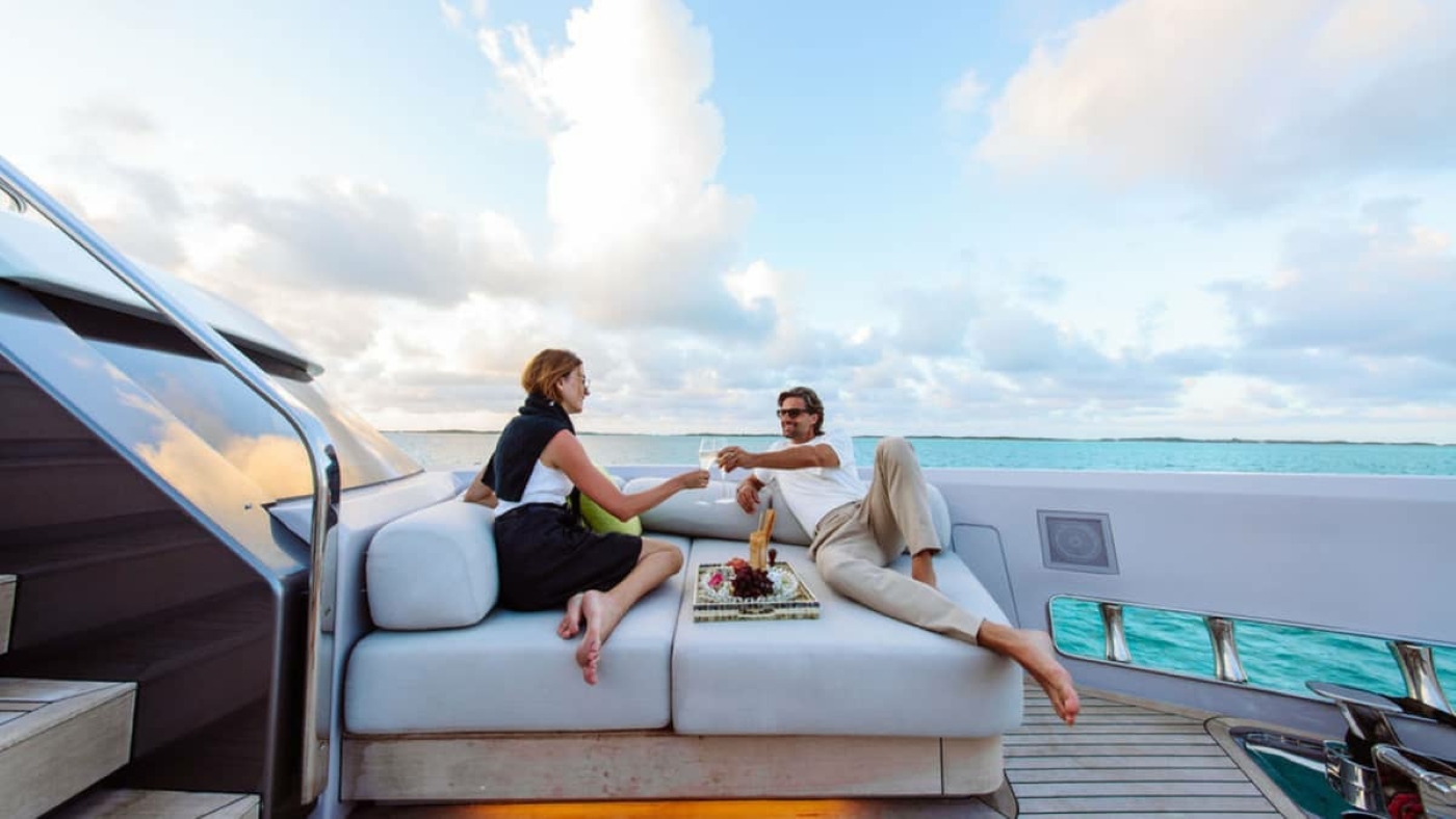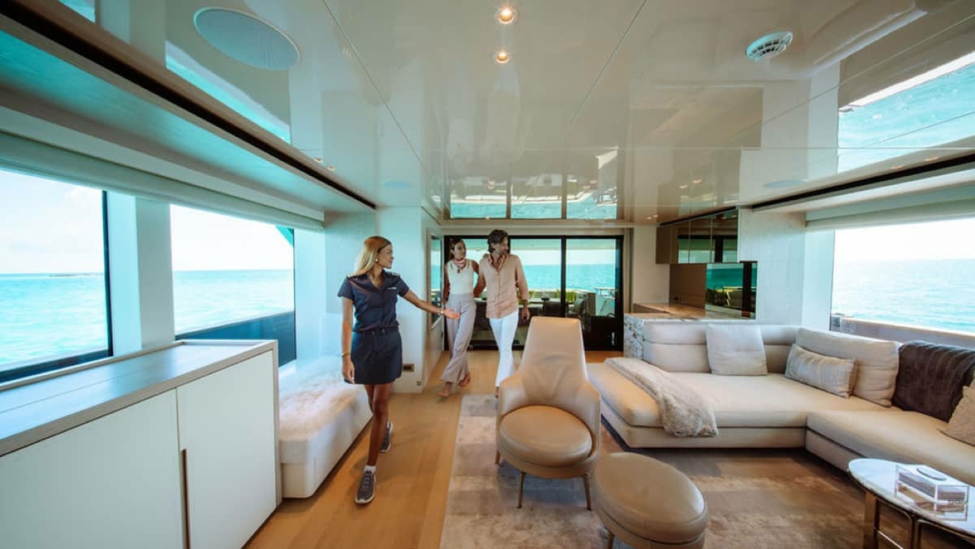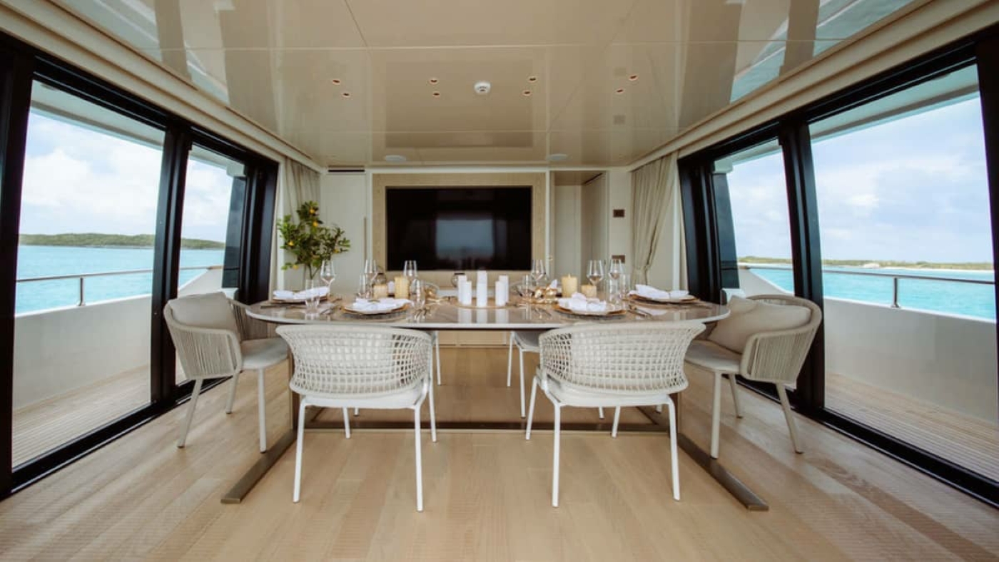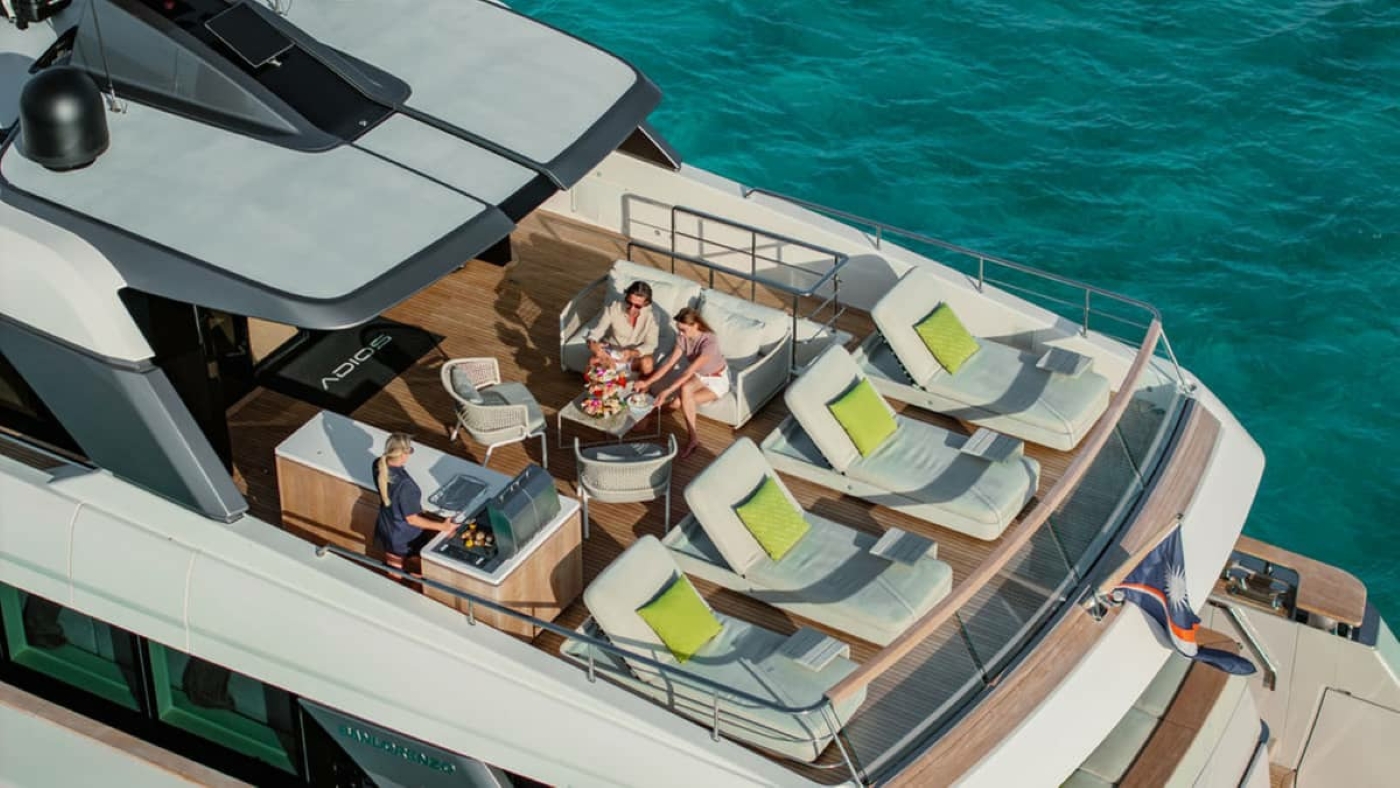 From her crisp lines to the tiered outdoor decks, ADIOS is tailored for refined outdoor living. The standout feature is her full-beam foredeck jacuzzi, flanked by wide sunpads and curved seating – a glamorous setting for sunbathing or cocktails with a view. The sun deck offers ample space for lounging, shaded dining, and enjoying the sea breeze, while the main deck aft features a relaxed alfresco area perfect for leisurely breakfasts or evening drinks.