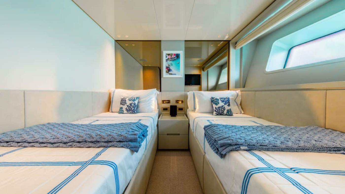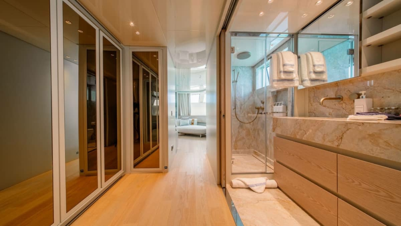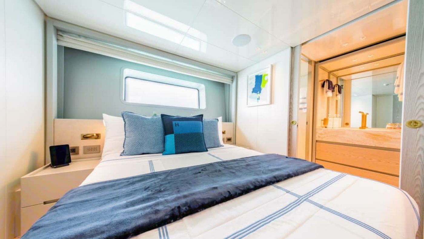 ADIOS offers accommodation for up to 10 guests in five elegant suites: ~ Main deck master suite: King bed, panoramic windows, private ensuite with double vanity and large walk-in shower ~ 2 x VIP cabins: Queen beds, ensuite bathrooms, generous storage ~ 2 x Twin cabins: Two single beds in each, ideal for children or staff, with ensuite facilities Each stateroom is designed for comfort and privacy, combining neutral tones with bespoke finishes and high-end linens.