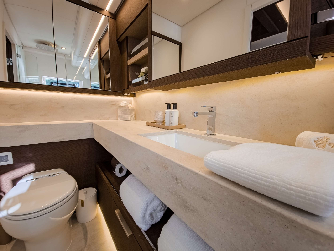 AEOLUS welcomes up to 8 guests in 4 cabins: ~ 1 x Primary suite with queen-sized bed, private lounge, walk-in wardrobe, and luxurious ensuite with waterfall shower ~ 2 x Queen guest cabins with ensuite bathrooms ~ 1 x Convertible cabin with twin or queen configuration, ensuite bathroom All cabins are fitted with high-quality linens, climate control, and private ensuites with modern fixtures and ambient lighting.