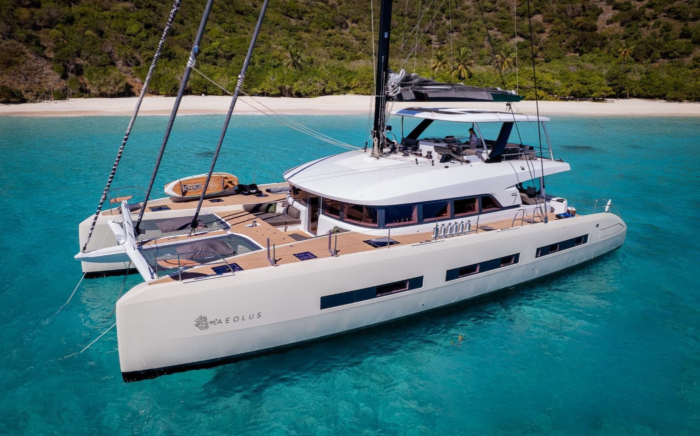NOTABLE FEATURES OF AEOLUS: ~ 2024 Lagoon SEVENTY7 with award-winning interior ~ Expansive primary suite with lounge, walk-in closet and waterfall shower ~ Three additional queen cabins including one convertible to twin ~ Flybridge with dining, bar and lounging zones ~ Alfresco cockpit and foredeck dolphin seating ~ Highly experienced crew of four ~ Wi-Fi, full air conditioning and state-of-the-art AV systems ~ Inflatable Hobie cat, e-foils, Seabobs and a host of watersports toys