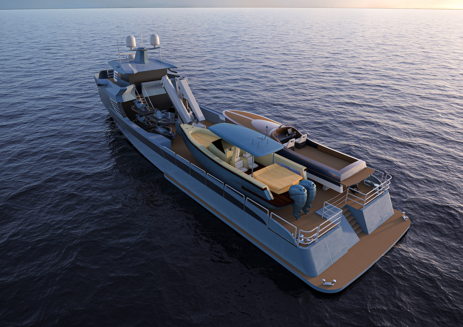 The main deck is used for the storage of tenders and water toys, with the 15,500kg capacity crane providing safe and efficient launch and retrieval. The foredeck can be used for observation, and the main deck aft has a stairway down to a swim platform for easy access to tenders and water toys.