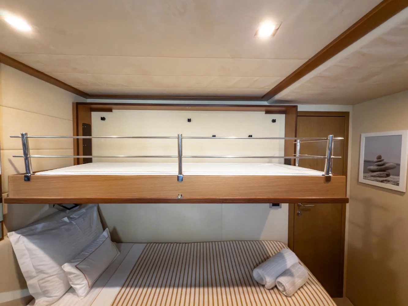 On the lower deck the four guest suites are private havens for everyone on board. There is a full beam master amidships, a VIP double forward plus two twins, one to port and one to starboard. All the suites benefit from the luxury and privacy of ensuite bathroom facilities and one of the twin suites boasts an additional pullman bunk, perfect for children.