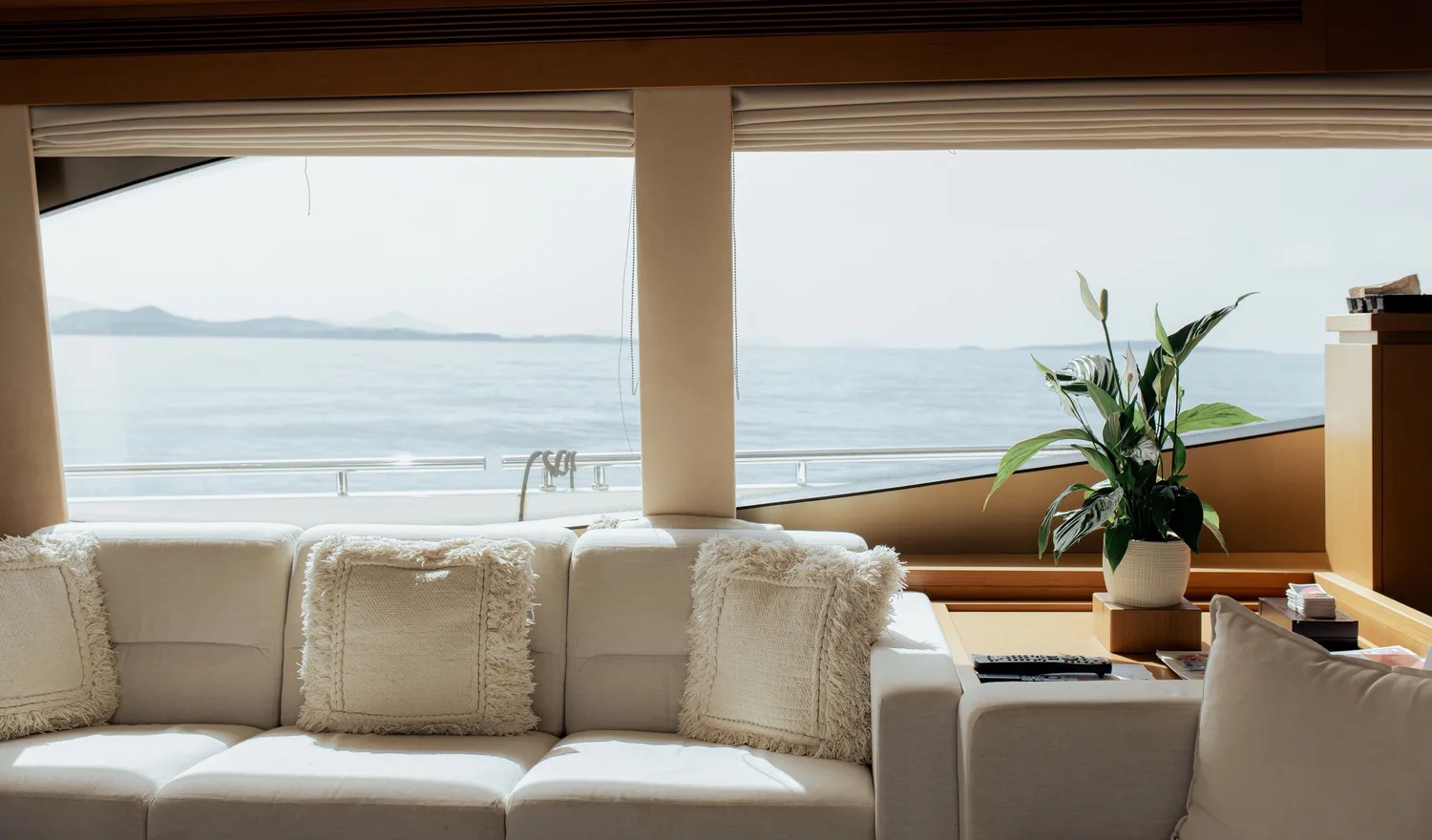 The welcoming interior feels light and airy thanks to the neutral décor and large windows. The main salon is a split-level space with an aft lounge and forward dining room; the lounge has lots of comfortable sofas while the dining table is elevated to make the most of the views from the windows.