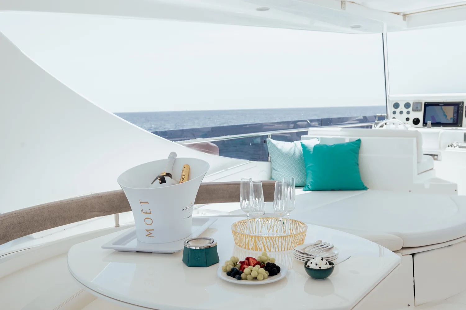 The main deck aft is perfect for leisurely al fresco lunches, is shaded under the flybridge overhang and has direct access into the main salon and down to the swim platform where the crew will set up the water toys while at anchor.