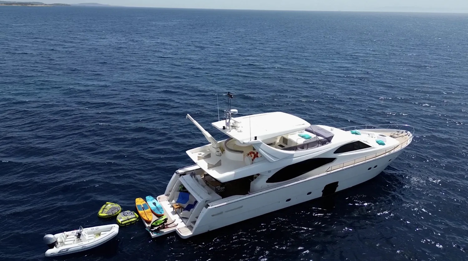 NOTABLE FEATURES OF ARVO V: ~Flybridge with hard roof ~Beautifully maintained interior ~Lots of water toys ~At anchor stabilisers ~Air conditioning ~WiFi