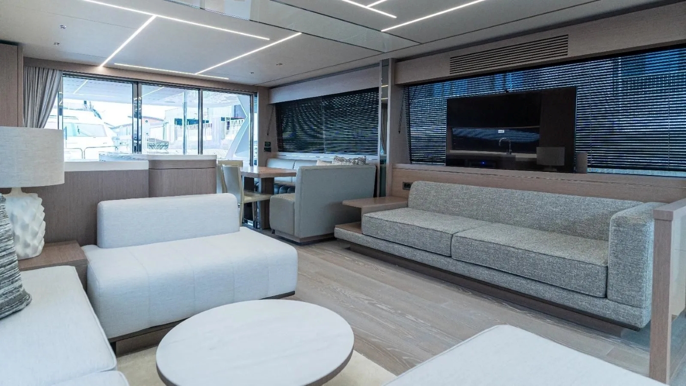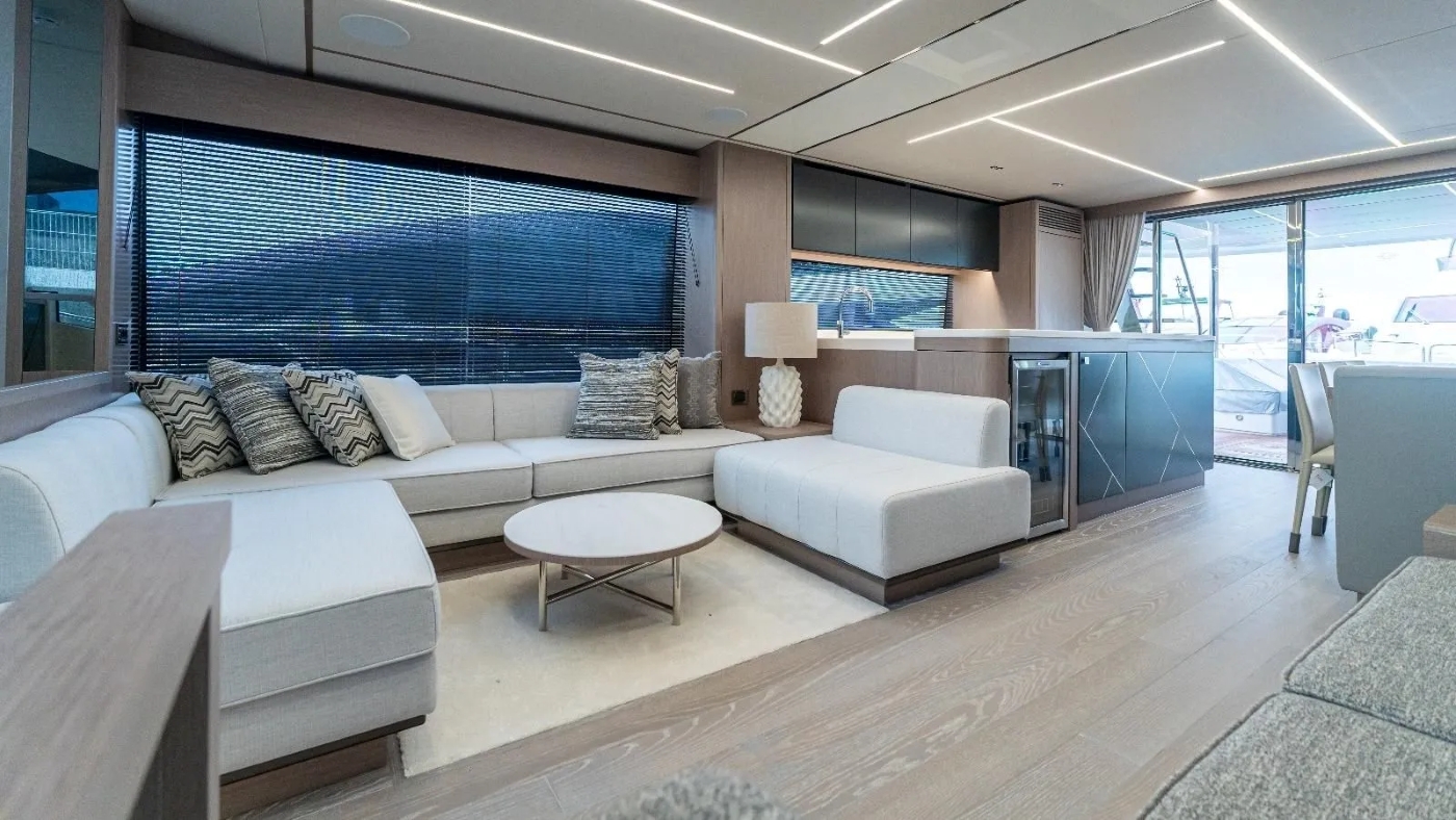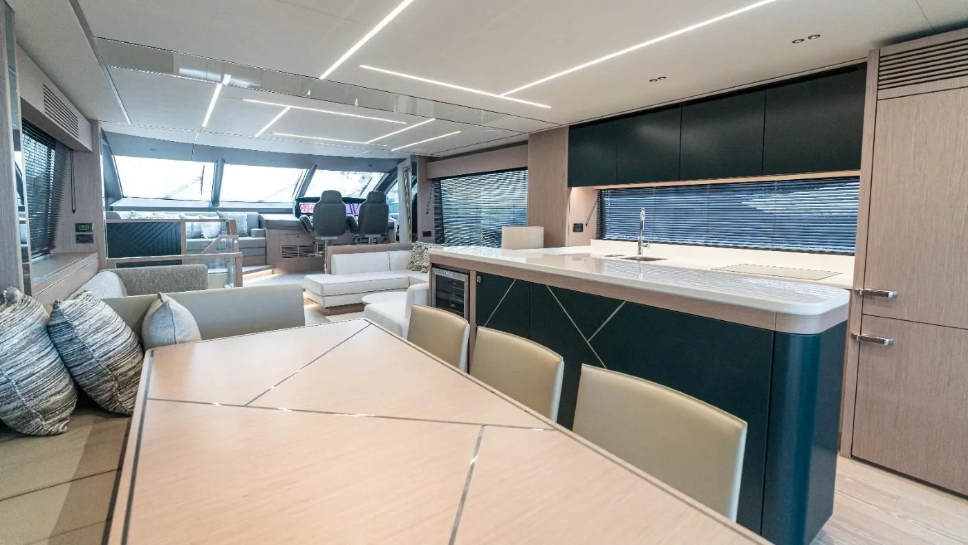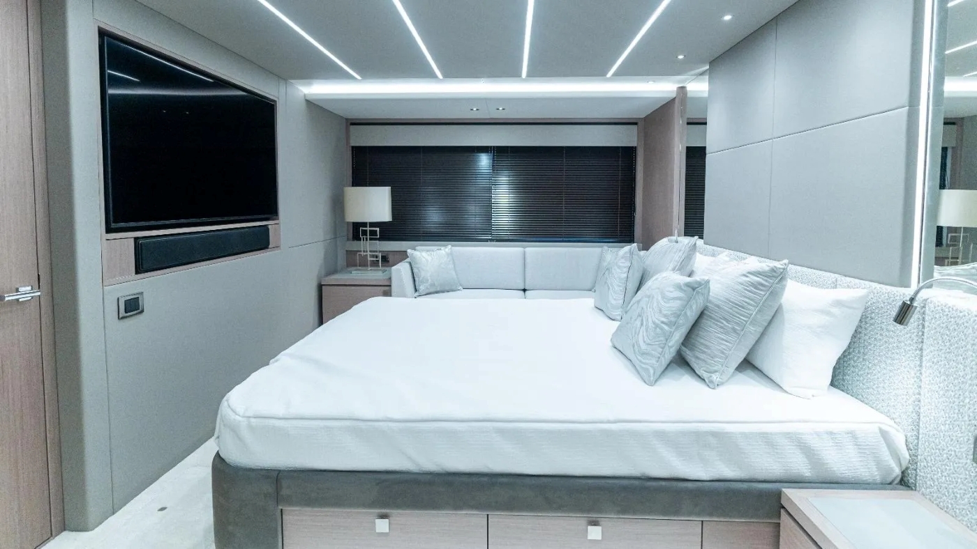 The galley is conveniently located forward, finished in sleek surfaces and fully equipped for gourmet dining. Throughout, the mood is contemporary yet comfortable – perfect for guests who appreciate understated luxury and refined design. The wheelhouse is seamlessly integrated into the open-plan space, with helm chairs set forward of the lounging area for a fluid, sociable layout.