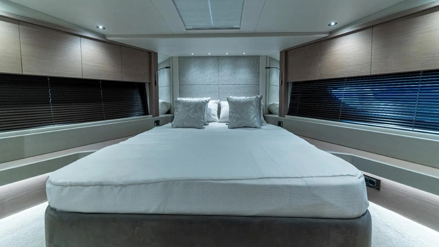 The guest accommodation on ASCEND consists of: ~ Master stateroom: Full-beam suite with queen-sized bed, dressing table, lounge area, and ensuite with dual vanity and walk-in shower ~ VIP cabin: Double bed, ensuite bathroom, contemporary styling and generous storage ~ Guest double cabin: Double bed with ensuite facilities and cohesive design aesthetics ~ Twin cabin: Two single beds and ensuite bathroom, ideal for children or additional guests