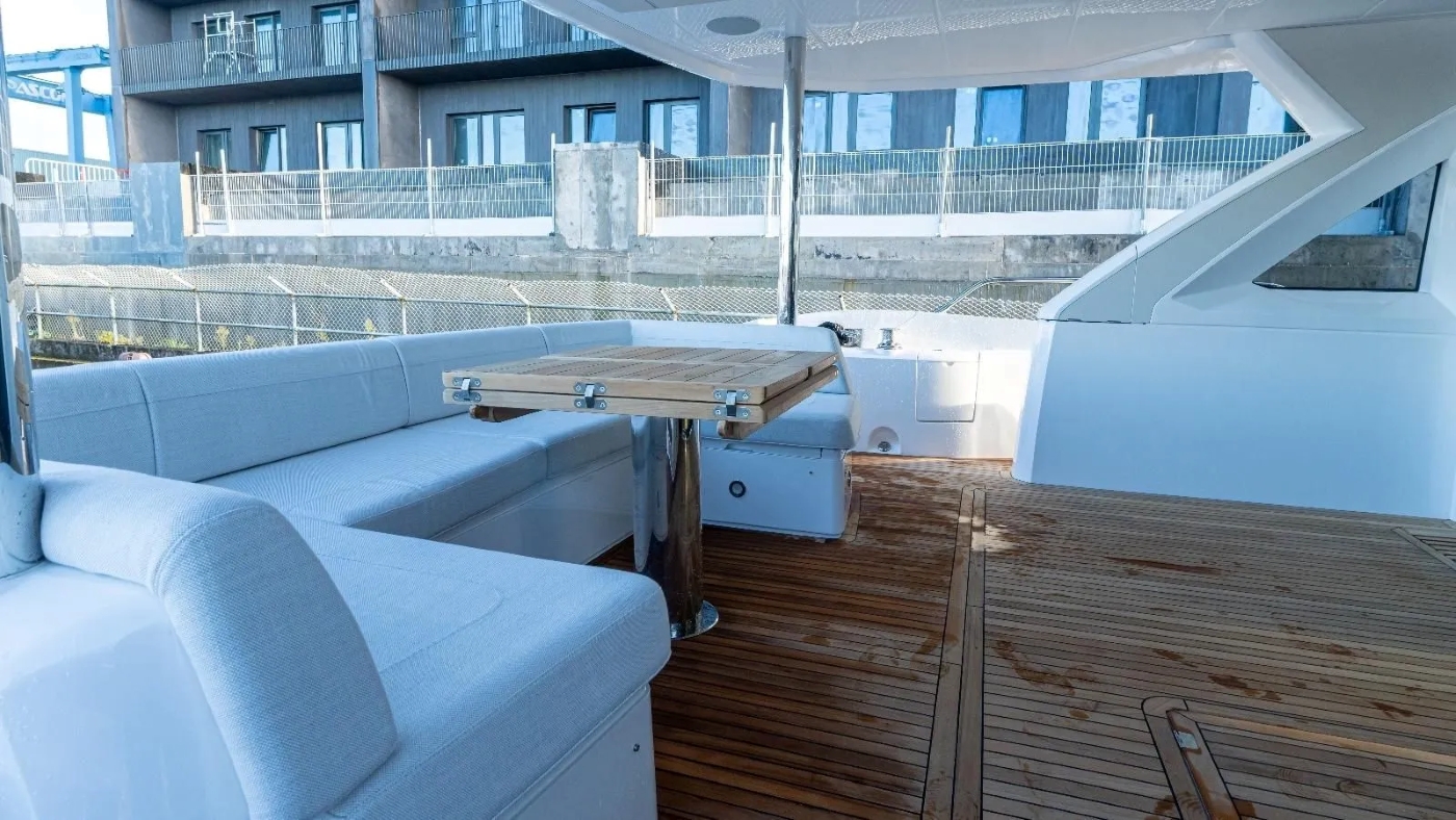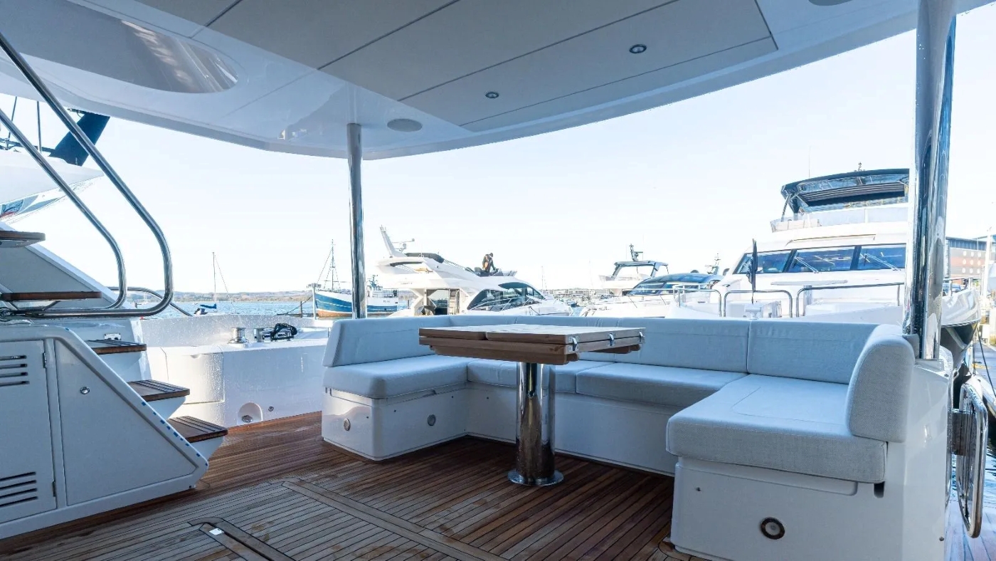 Her custom-finished flybridge is fitted with a Jet Black canopy and matching detailing across the radar arch and antennae, offering both visual impact and comfort. This upper deck space includes a drop-down BBQ station, dining area and space for sun loungers – a favourite spot for social gatherings or enjoying the breeze while underway.