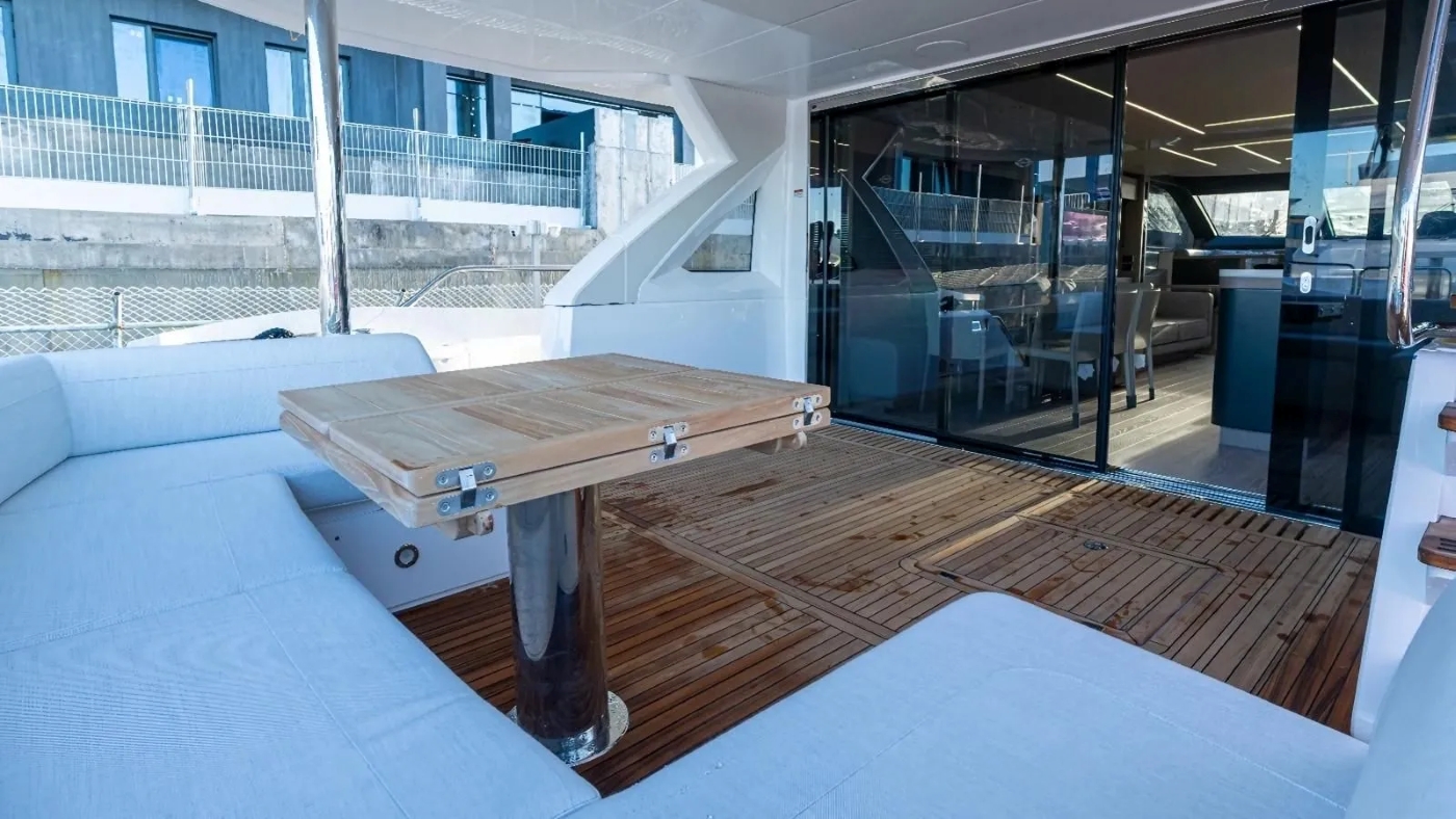 ASCEND delivers exceptional outdoor living from bow to stern. The aft deck features a relaxed U-shaped lounge with teak flooring and direct access to the main salon. A large hydraulic swim platform doubles as a beach club, with fold-down seating and an overhead shower for rinsing off after a swim.
