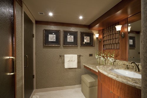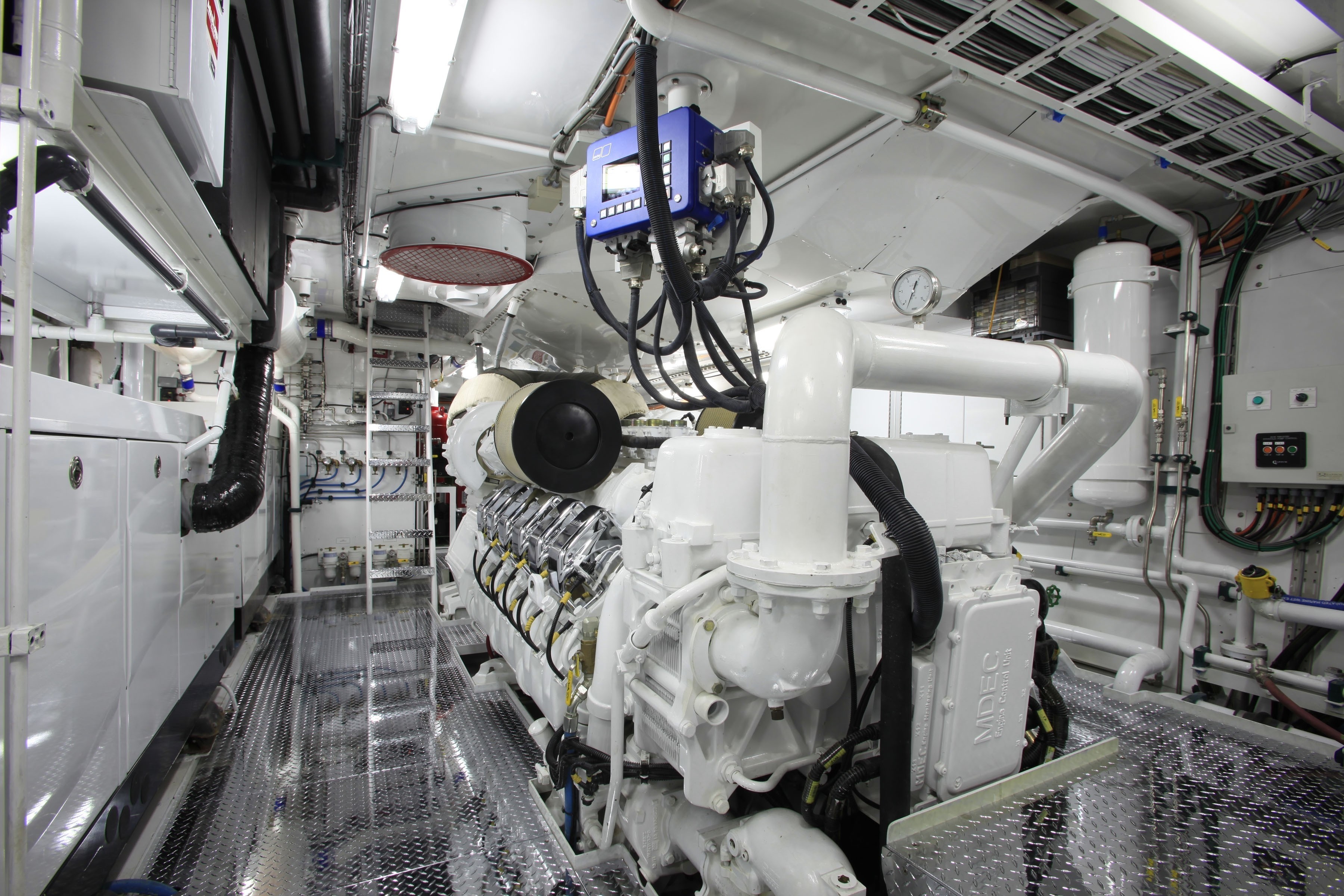 The 16V 396 TB93 engine installed in the motor yacht is built by MTU. For propulsion AT LAST has twin water jets (kamewa). The engine of the yacht produces 2610 horse power (or 1921 kilowatts). She is fitted with 2 engines. The combined output for the boat is 5220 HP / 3841 KW. As far as stabalisers are concerned she utilises Naiad. The bow thrusters are Transmark.