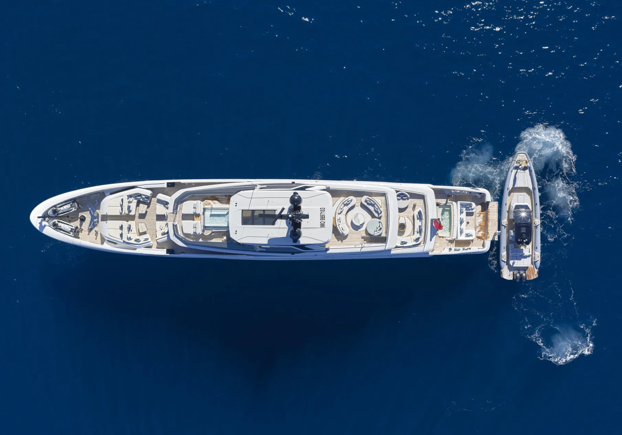 Tenders & Toys: ~1 Technohull Alpha 50 15m Chase boat with 2 x 600 mercury outboard ~1 Custom Williams 565 5.5m tender diesel jet tender ~2 Flite foil boards ~2 Seadoo GTX 325 limited jet skis ~2 Jobe sea scooters ~4 scuba-pro dive sets ~2 person kayak ~2 body boards ~Snorkels and masks ~2 Eovolt electric bikes Audio Visual Equipment and Deck Facilities: ~Smart Samsung HD TVs in all cabins, main saloon, sky lounge ~Dual Starlink internet ~5G Internet ~GEST Call button system ~WiFi connection ~Air Play and Sonos ~Apple TV, Plex, Prime, Netflix accounts ~Spotify