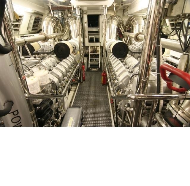 The motor yacht is engineered with two responsive MTU main engine(s) and can manage a exhilarant maximum continuous speed of 36 knots. The engine of the yacht generates 3645 horse power (or 2720 kilowatts). Her total HP is 7290 HP and her total Kilowatts are 5440. Her propulsion units are twin water jets (kamewa). The boat’s vivacious cruising speed is 32 knots which gives a range of 520.