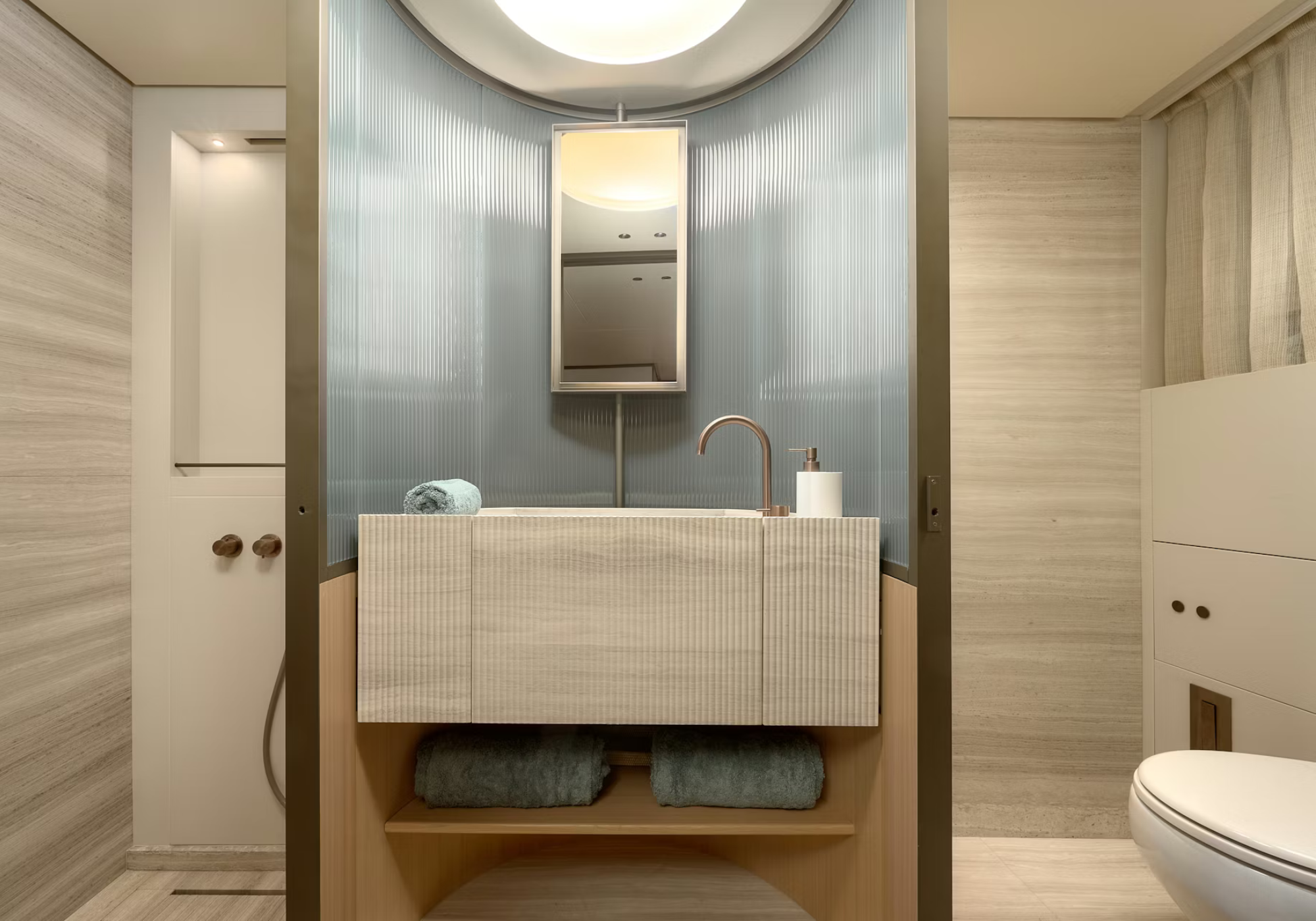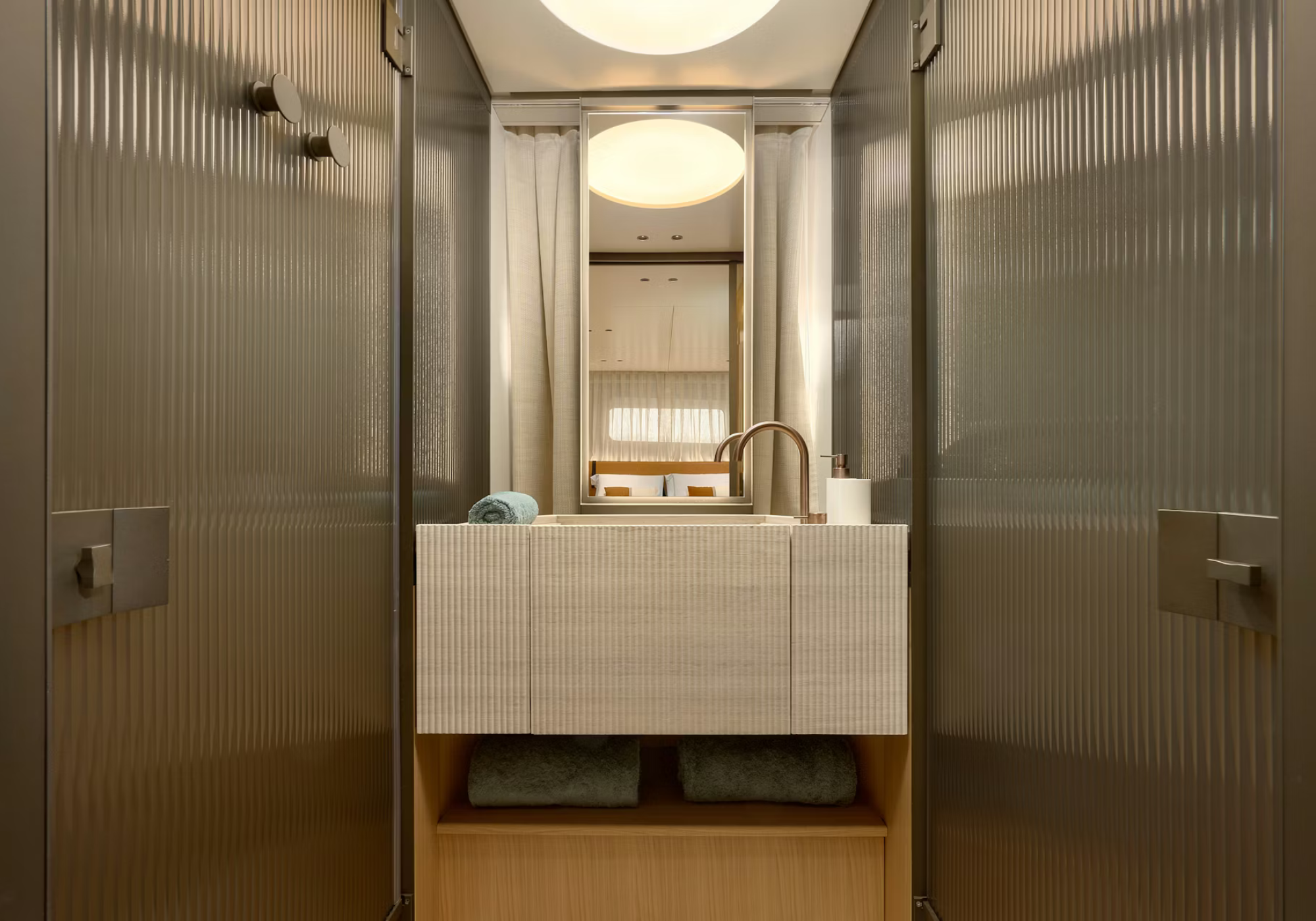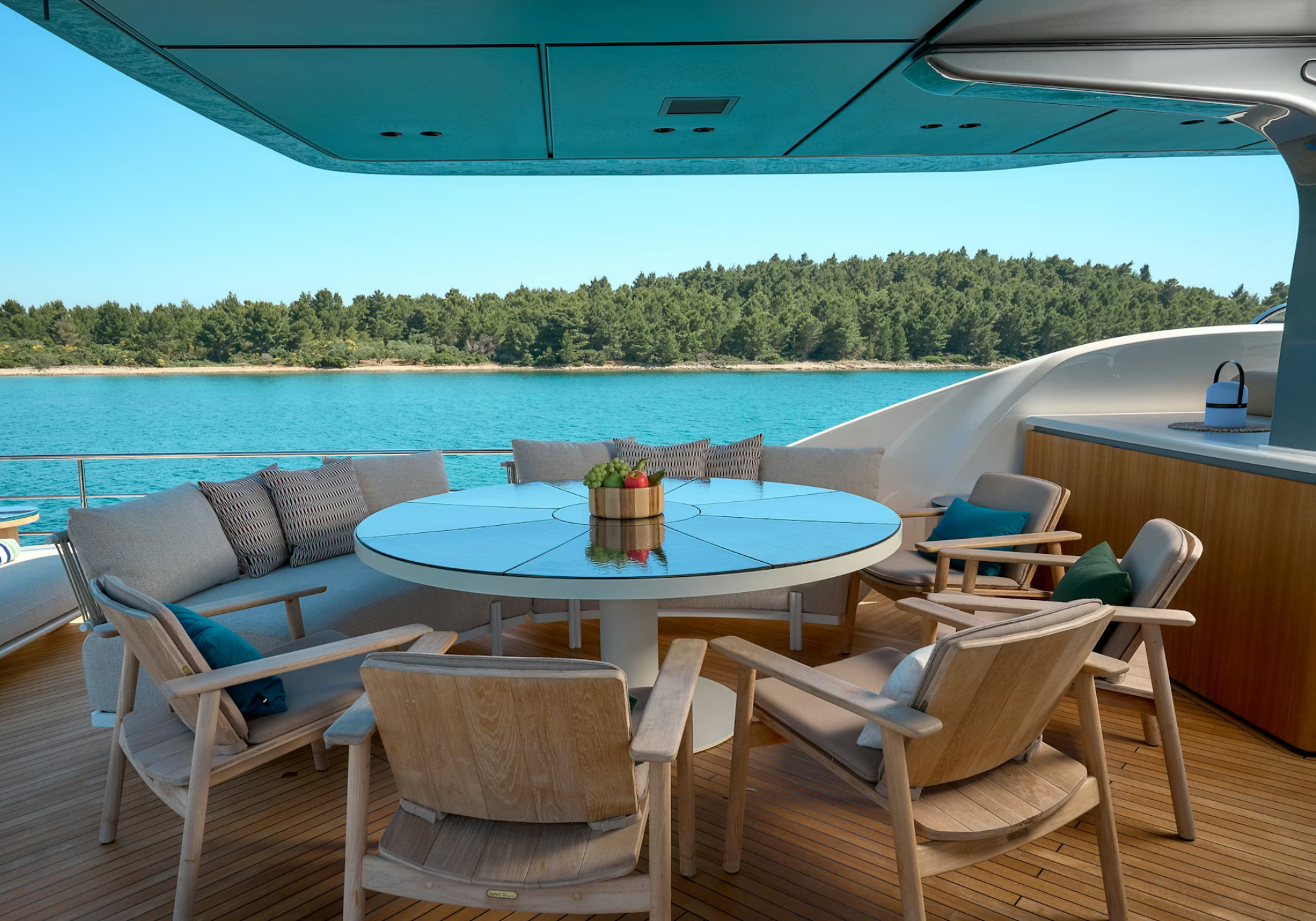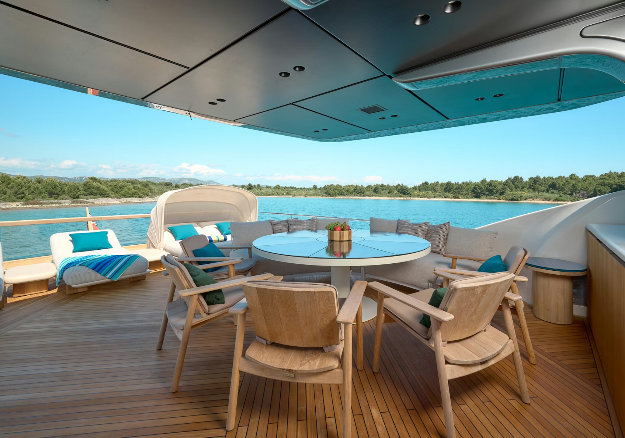 MAIN DECK OWNERS CABIN Full beam with double bed, built in desk/vanity area, Large central wall mirror with hidden TV 43". Steps down to split level ensuite features dual sinks with marble tops, shower and WC. Surround skylight offers lots of natural light. LOWER DECK FWD | VIP | Queen bed, built-in desk/Vanity. Hidden TV. Ensuite with shower and single sink. AFT | 2x mirrored Queen Staterooms featuring hidden TVs, nightstands. Ensuite with shower and single sink. FLYBRIDGE (can be reached either by either external staircase from the aft or via the wheelhouse). Cabinet with fridge and sink Circular dining area for up to 10 Large double (with hood) and 2 single Chaise Longues AFT DECK 2 separate dining tables ideal for more intimate dining (total 8) BOW AREA 2 x "l" shaped Seating fwd and central external staircase up to fwd sunpads All cabins fitted with blackout curtains (NB: 100% blackout cannot be guaranteed).