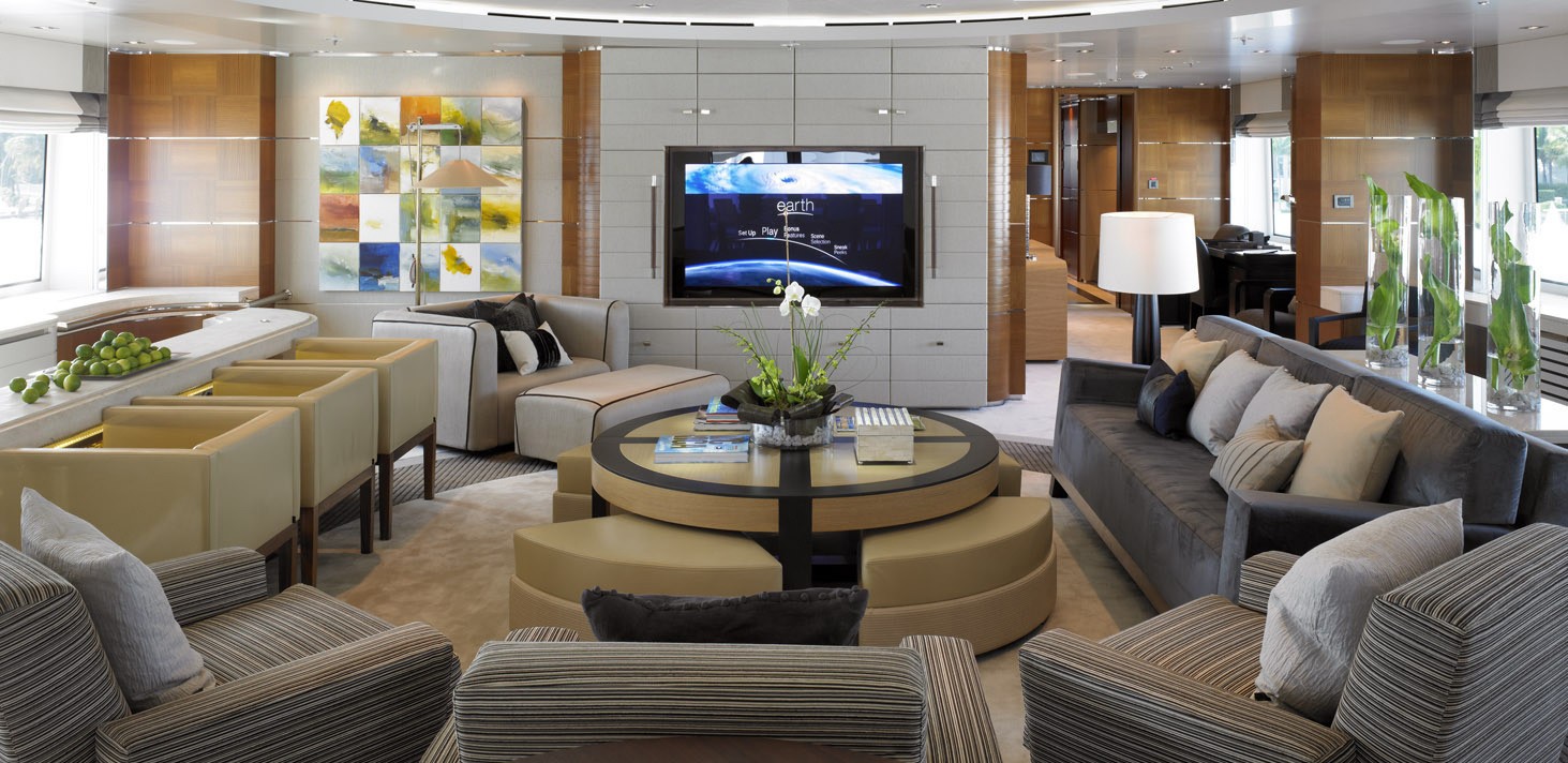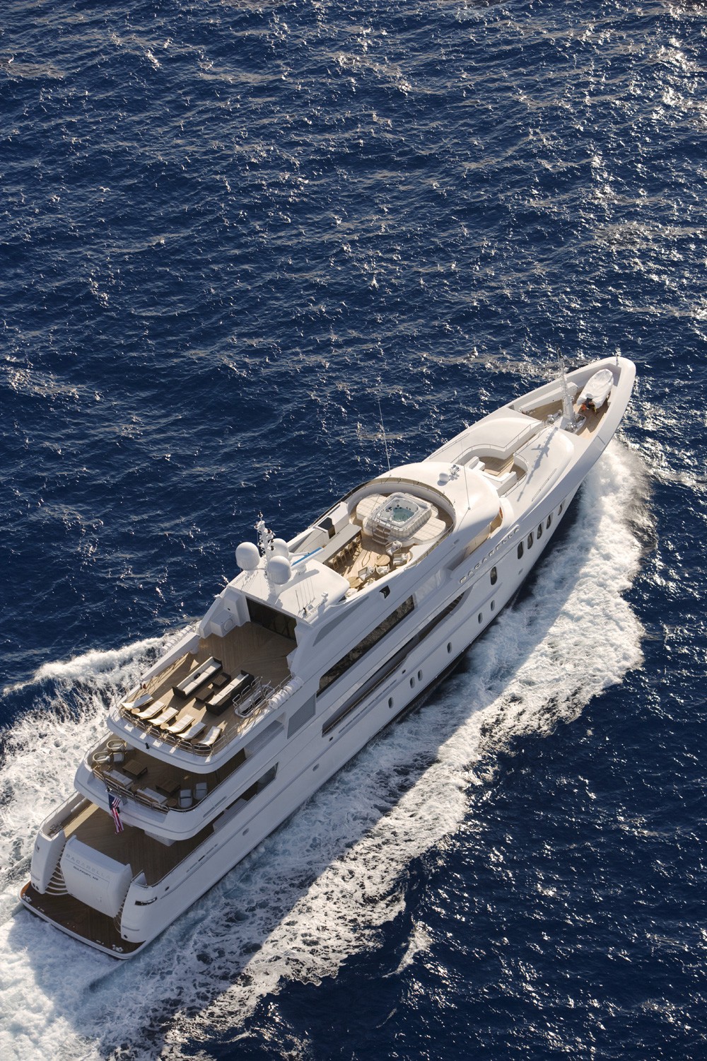 The owner of BACARELLA requested an extra large master suite which is a current trend in large motor yachts. Motor Yacht BACARELLA also has a full beam VIP cabin as well as a further four double guest’s cabins making 6 double cabins for a total of 12 possible guests sleeping onboard. She has a long main saloon, followed by a formal dining area with a dining table, custom designed by Bannenberg & Rowell as the center piece. It is possible dine alfresco on her main aft deck or the superyacht’s spacious upper aft deck.