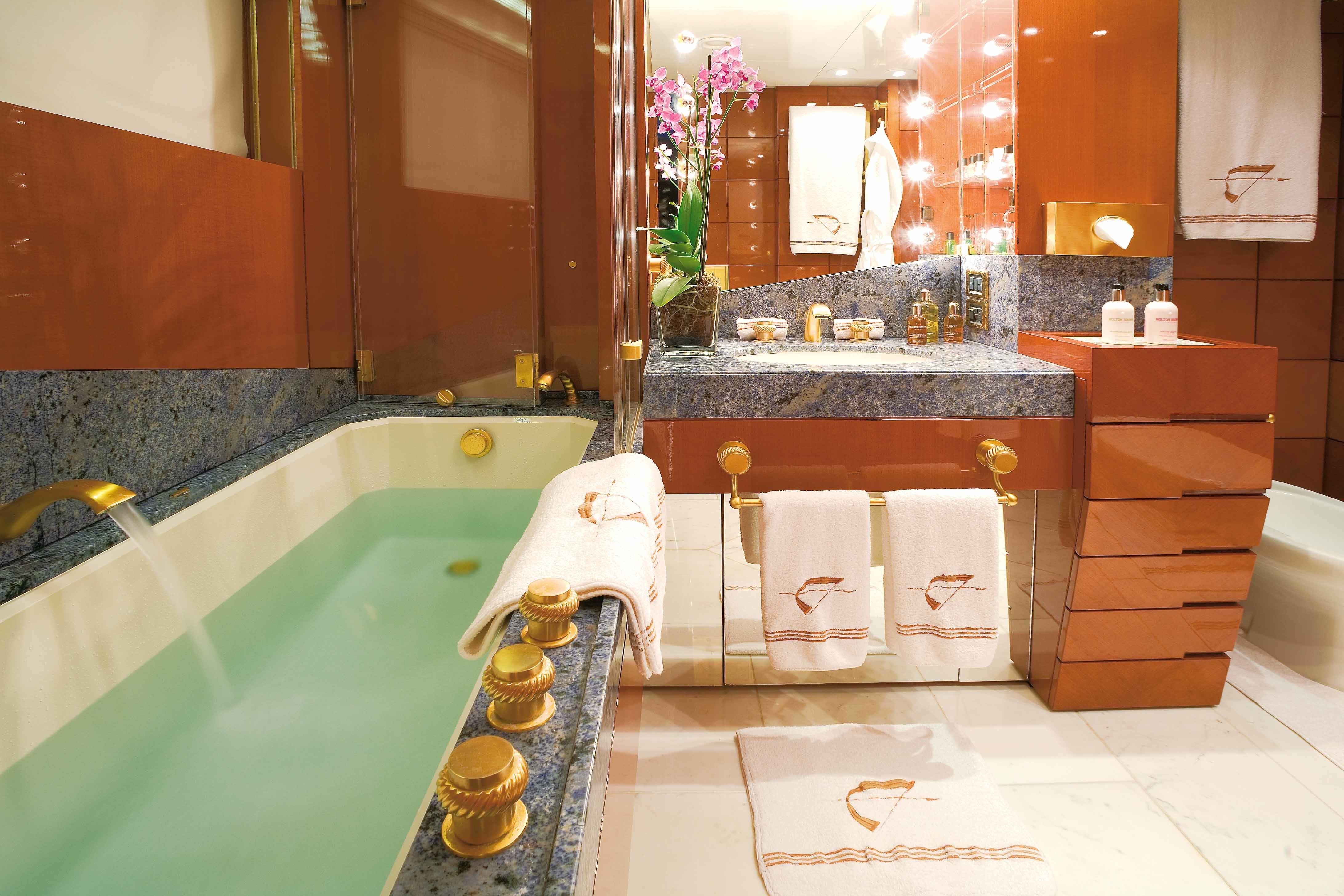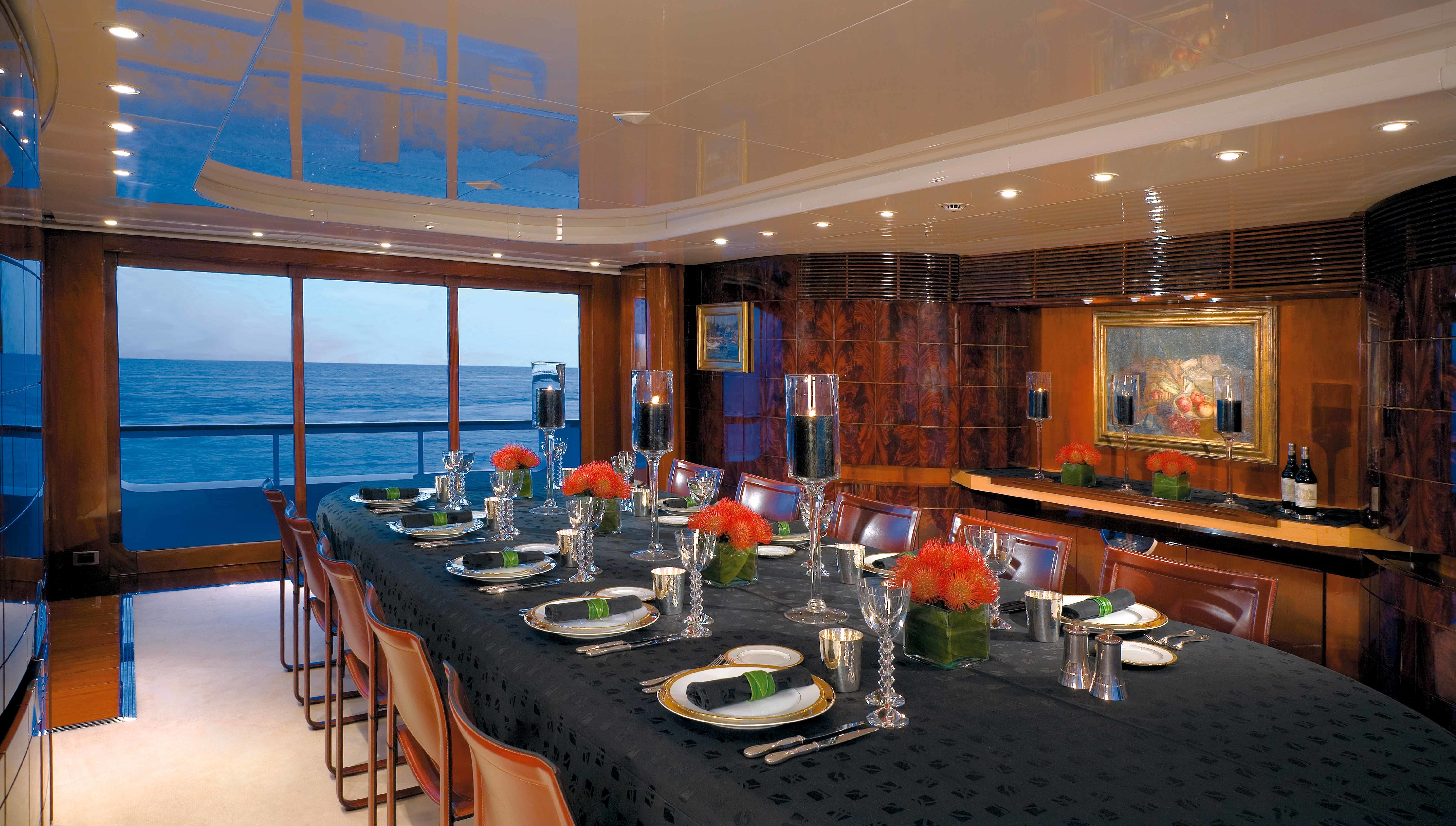 The 16V 396 TB84 engine powering the yacht is made by MTU. Connected to her MTU engine(s) are tripple water jets (kamewa). The main engine of the ship generates 2040 horse power (or 1521 kilowatts). She is equiped with 3 engines. The sum thrust for the boat is accordingly 6120 HP or 4563 KW. As for stabalisers she utilises Vosper. The bow thrusters are Schottel.