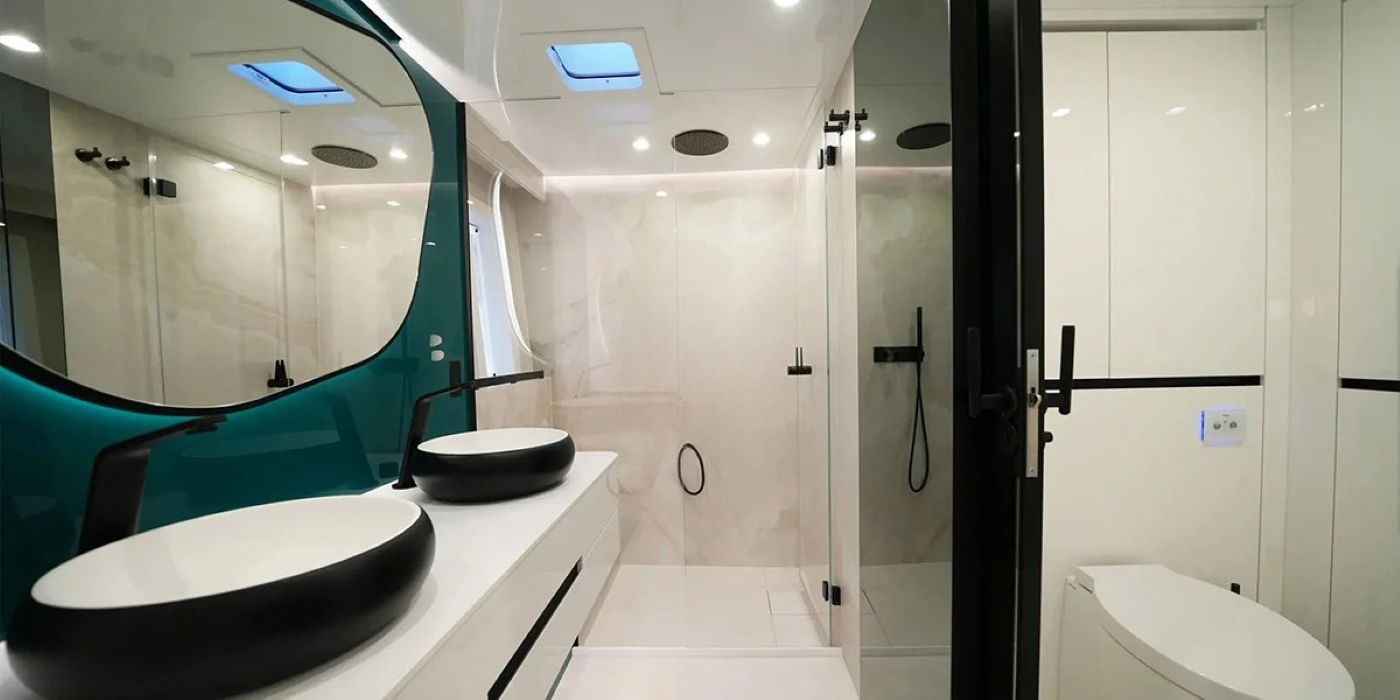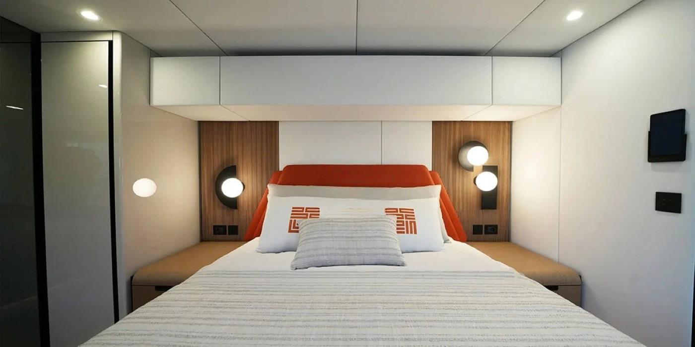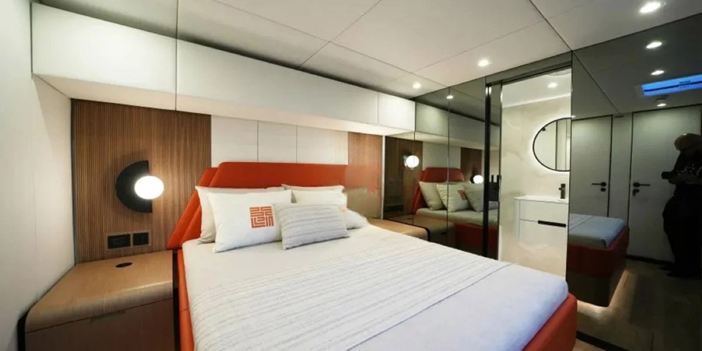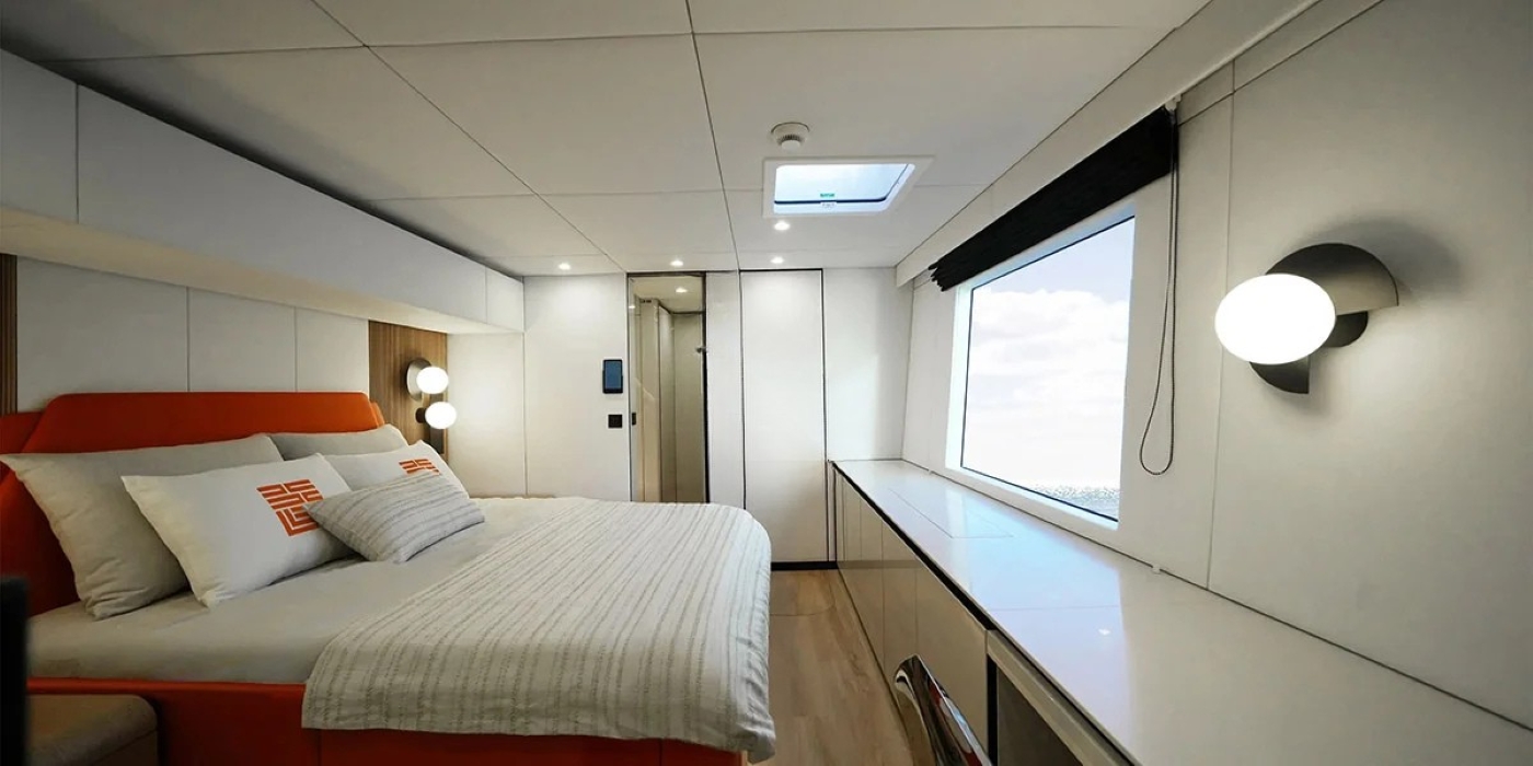 ~ Master suite with king-size bed, ensuite bathroom with walk-in shower, writing desk and ample storage ~ 2 VIP cabins with queen-size beds and stylish ensuite bathrooms ~ 1 convertible cabin with twin beds that can be arranged as a double; also ensuite ~ All cabins feature air conditioning, designer lighting, and modern finishes