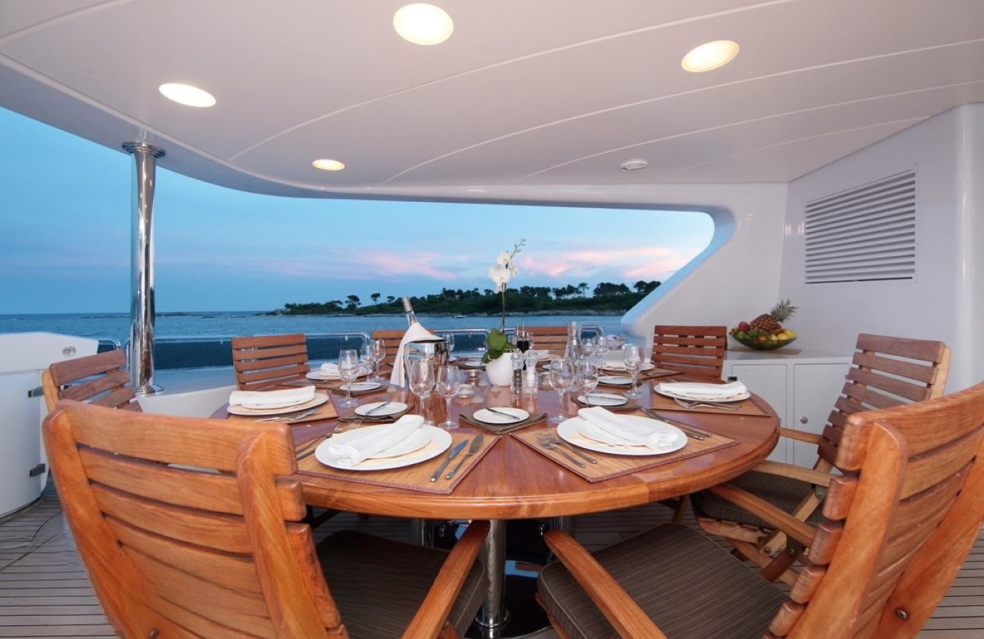 Aboard the luxury Benetti INOUIS, there is plenty of exterior living to enjoy and relax. Leading out from the salon, glass doors give way to a generous shaded aft deck with an alfresco dining option and full beam aft seating. The aft deck is the perfect spot to watch the water enthusiasts make the most of the sea toys on offer, from the extended swim platform. An upper deck boasts a further alfresco dining option, seating and partial shade, plus direct access to the skylounge. The sundeck is well-appointed and features ample sunning space, seating, partial shade and a deluxe Jacuzzi tub.
