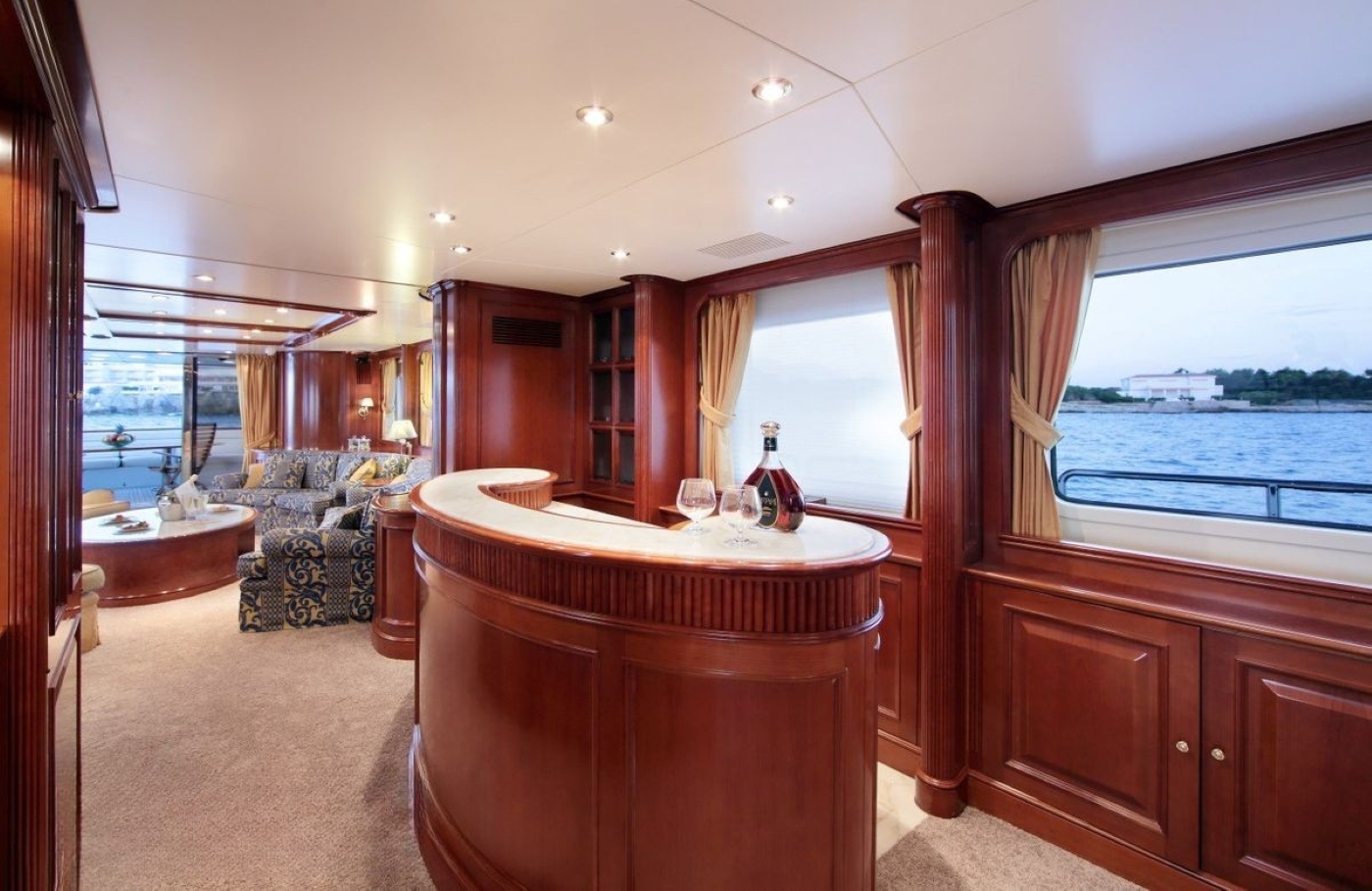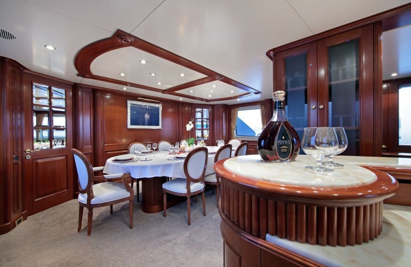 The stunning interiors of motor yacht INOUIS were designed by Zuretti and effortlessly combine elegance with functionality. Ideal for entertaining, the main salon offers a spacious lounge aft, with plush sofas, occasional chairs, coffee table and state of the art entertainment systems. Forward on the port side is a crescent shaped wet bar, while to starboard is the entrance foyer and stair well to the guests cabins. Both sides give access to the formal dining area, where all 10 guests can dine in style. Above the main deck, a skylounge is a fabulous additional social space, complete with a leather sofa, occasional chairs, coffee table, full wet bar with stools and additional games table.