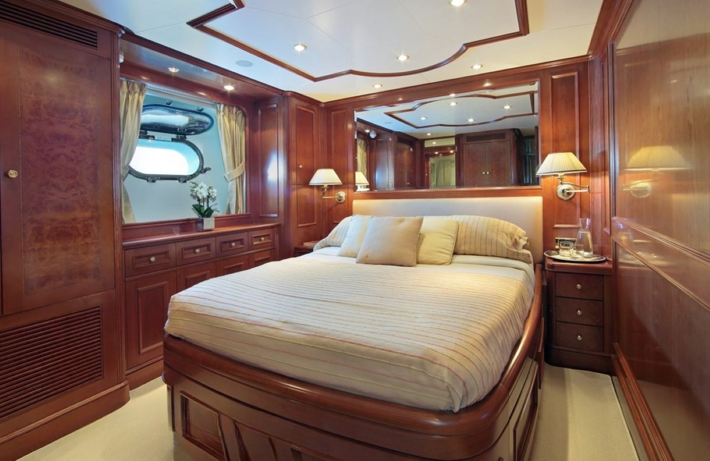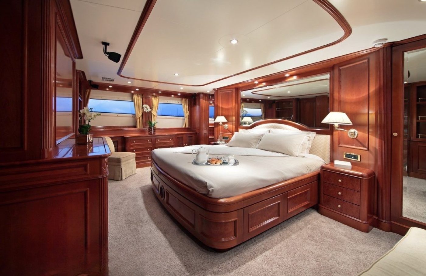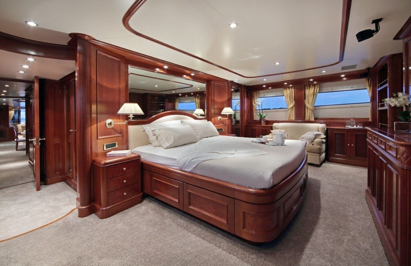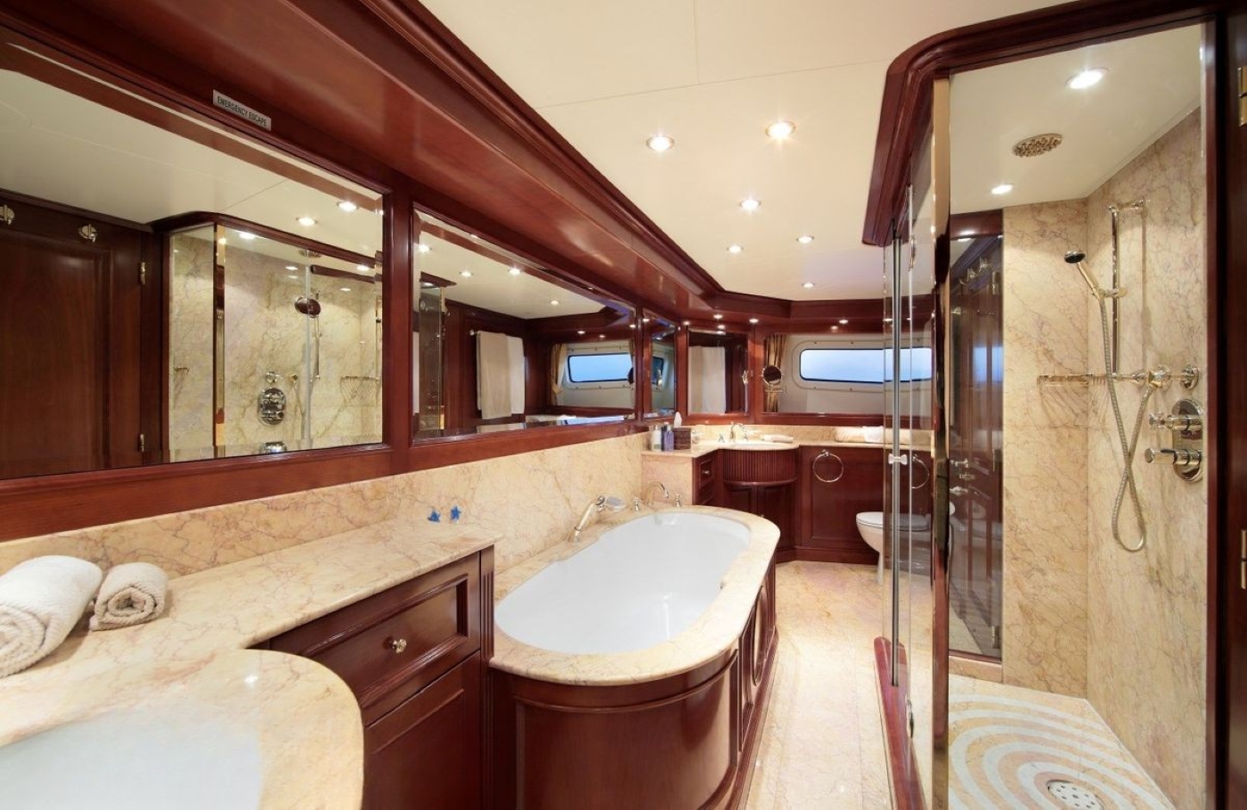 INOUIS offers up to 10 guests both comfort, stability and luxurious performance. She boasts 5 cabins, with 3 doubles and two twins. All of the cabins are fully air conditioned and have full ensuite bathrooms and electronic audio visual equipment. The master suite is forward on the main deck and full beam of the yacht, with a center lined king size bed, sofa, vanity, private study and large marble en-suite with his and hers facilities, walk in glass shower and deluxe tub.