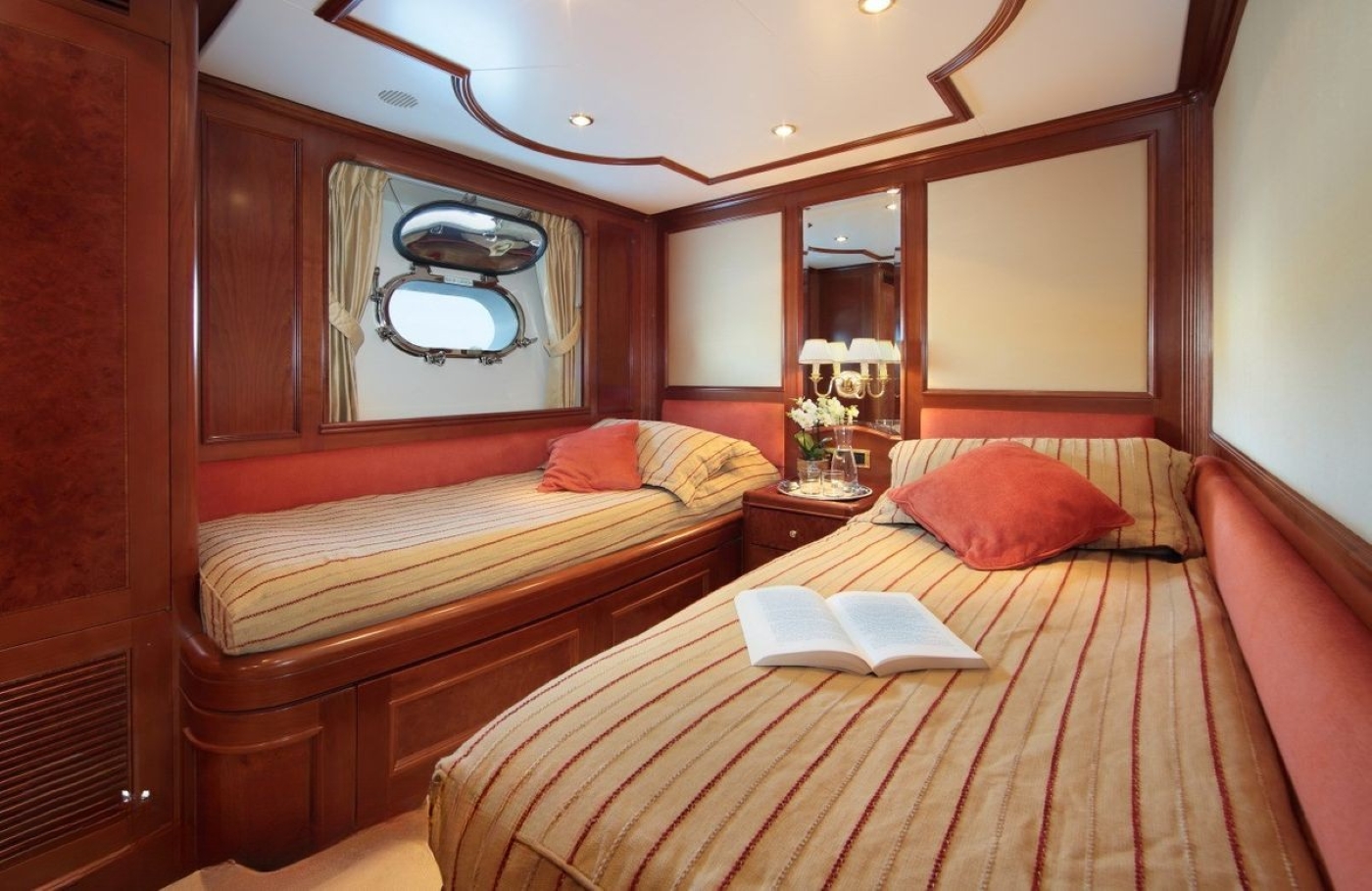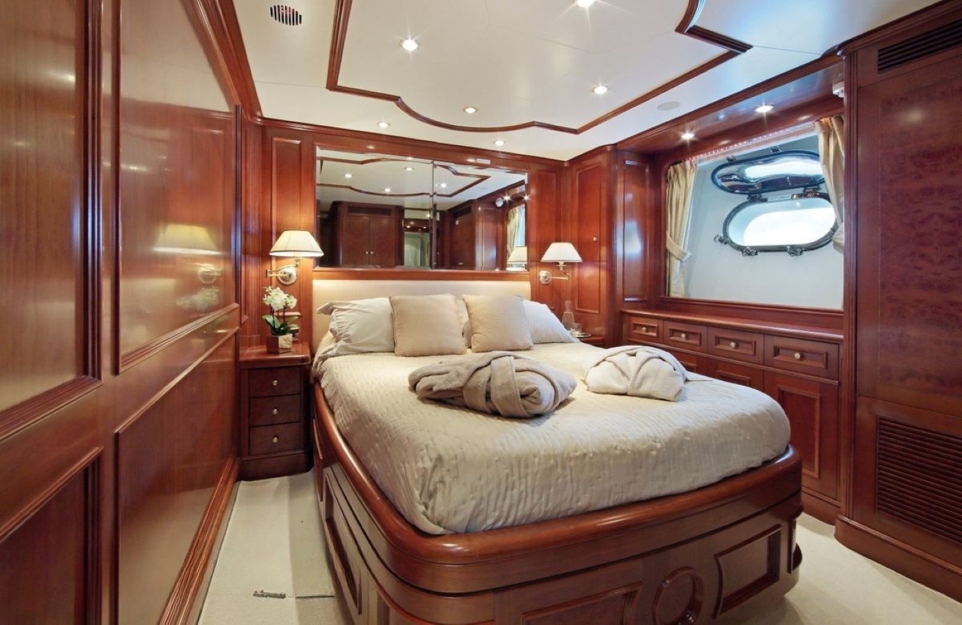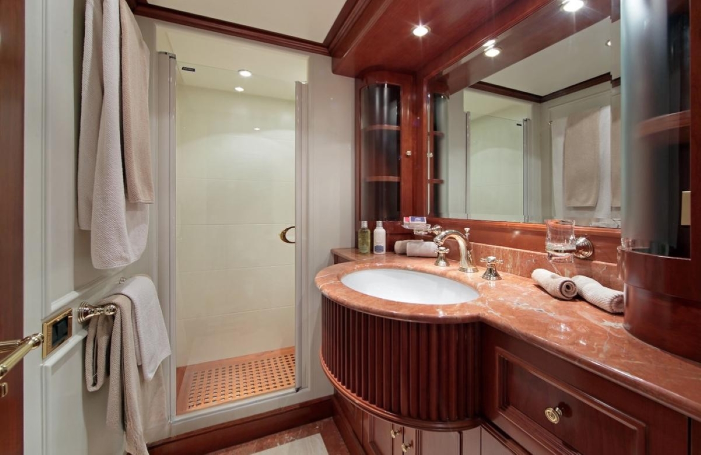 INOUIS offers up to 10 guests both comfort, stability and luxurious performance. She boasts 5 cabins, with 3 doubles and two twins. All of the cabins are fully air conditioned and have full ensuite bathrooms and electronic audio visual equipment. The master suite is forward on the main deck and full beam of the yacht, with a center lined king size bed, sofa, vanity, private study and large marble en-suite with his and hers facilities, walk in glass shower and deluxe tub.