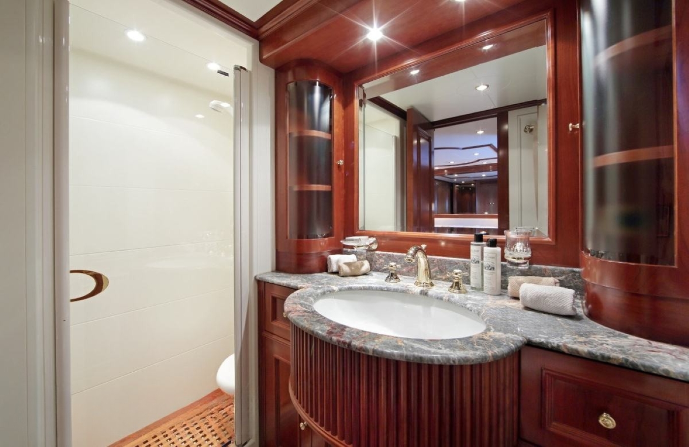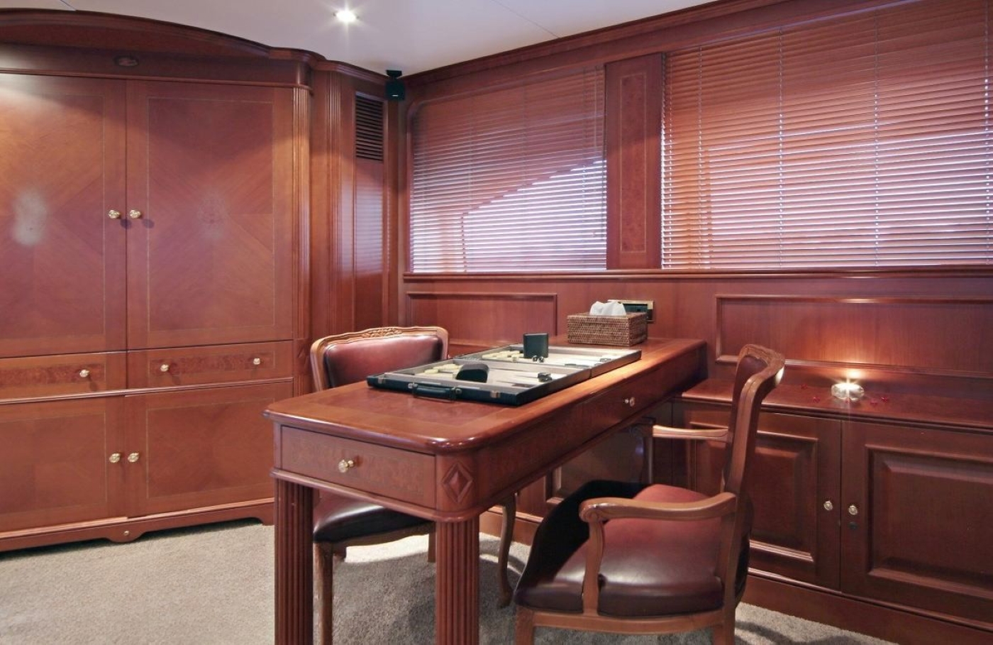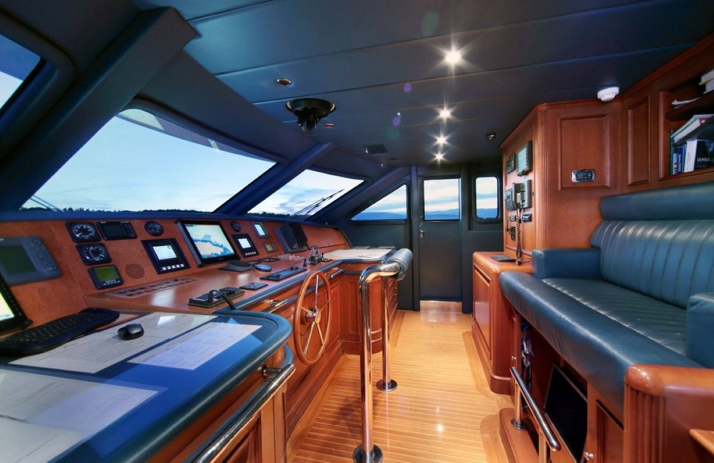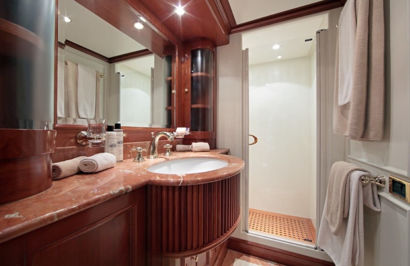 INOUIS offers up to 10 guests both comfort, stability and luxurious performance. She boasts 5 cabins, with 3 doubles and two twins. All of the cabins are fully air conditioned and have full ensuite bathrooms and electronic audio visual equipment. The master suite is forward on the main deck and full beam of the yacht, with a center lined king size bed, sofa, vanity, private study and large marble en-suite with his and hers facilities, walk in glass shower and deluxe tub.