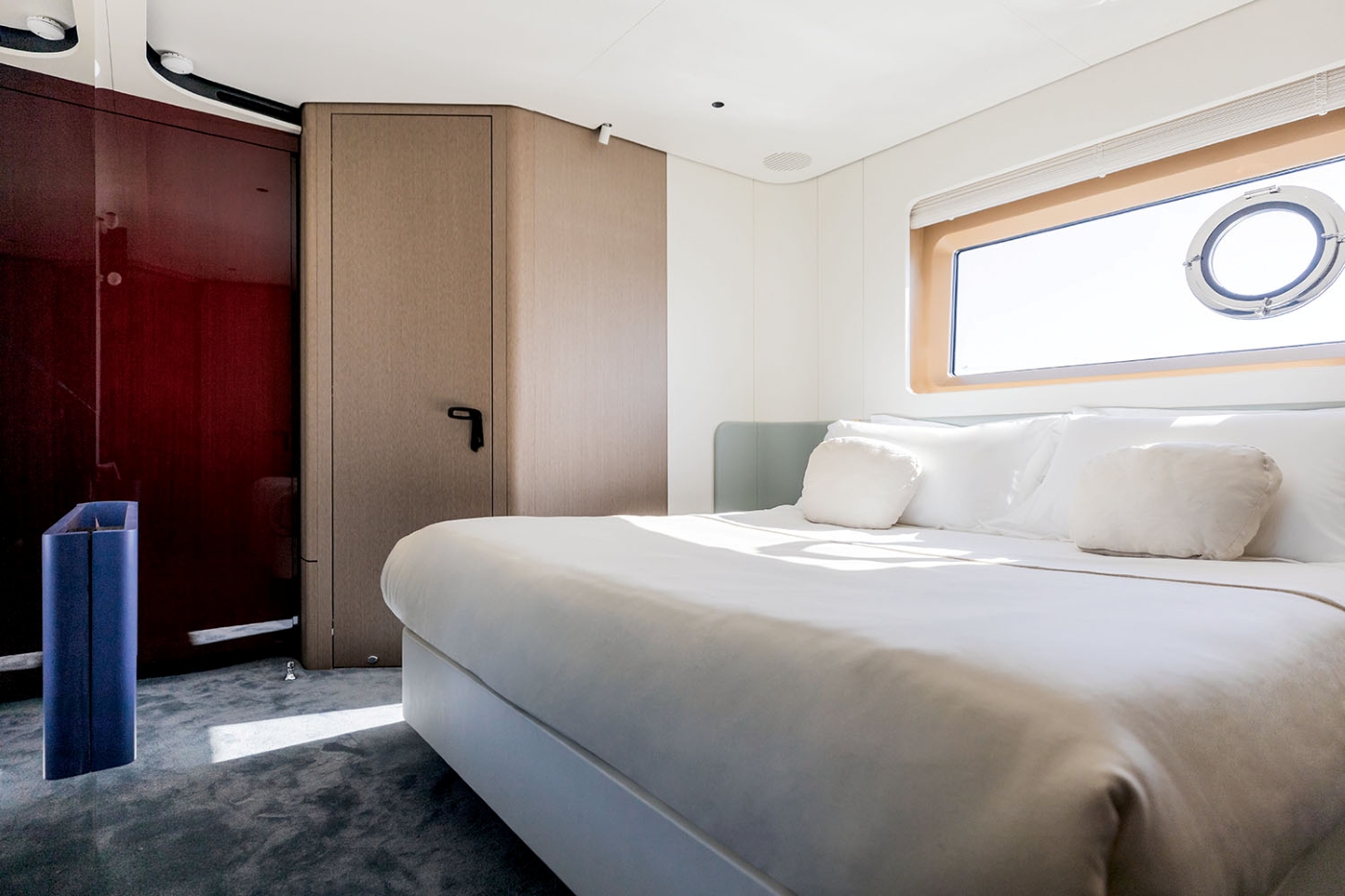 BK is configured to host up to 10 guests in 5 cabins, designed for flexibility, comfort and sophistication. ~ Master Cabin (Main Deck, full beam): King size bed, generous volume, ample glazing, en suite bathroom, and premium finishes ~ VIP Cabins (2): Each with queen or double configuration, en suite bathrooms, well appointed and bright ~ Twin / Convertible Cabins (2): Can function as twins or convert to doubles, each with en suite bathroom ~ In each suite: wardrobe storage, independent climate control, high quality finishes and en suite facilities This arrangement allows for couples, friends or families to cruise in comfort and privacy.