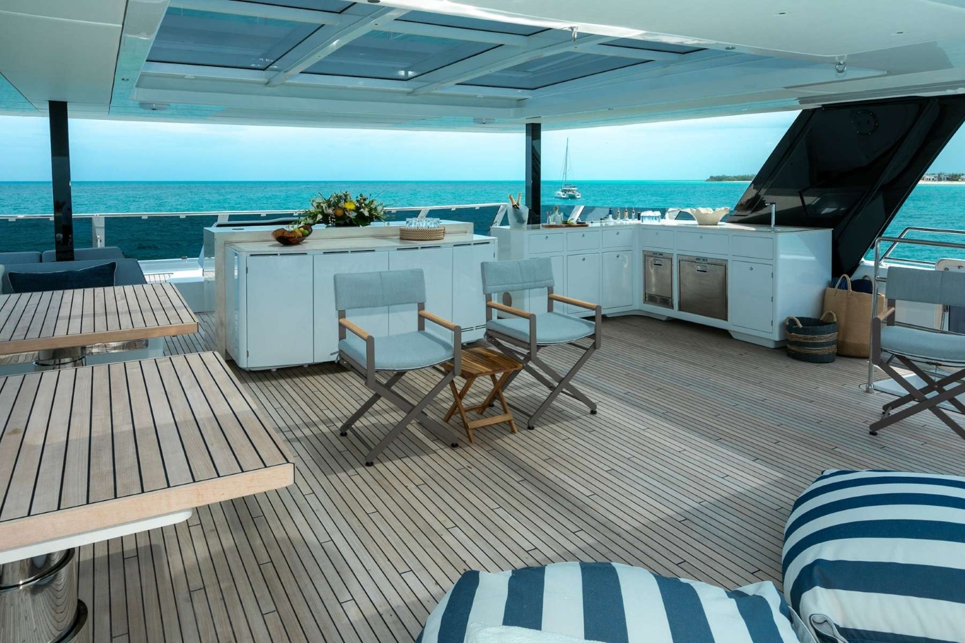 The outdoor spaces on BLESSED are as welcoming as they are impressive. Aft, a shaded dining area comfortably seats 10 for alfresco meals and relaxed conversation, complemented by twin fridges, an icemaker, and a chilled filtered water system. The foredeck features cushioned lounge seating, perfect for morning coffee or sundowner cocktails, while the hydraulic platform and inflatable pool deck create a seamless connection to the sea.