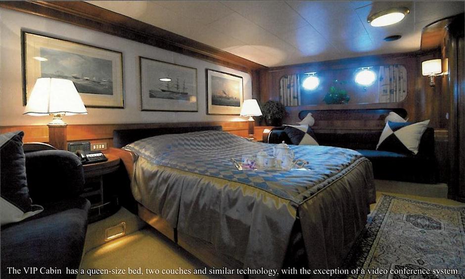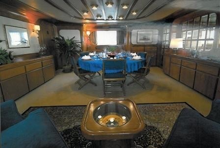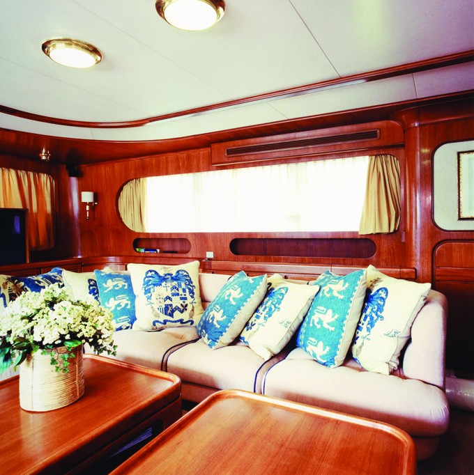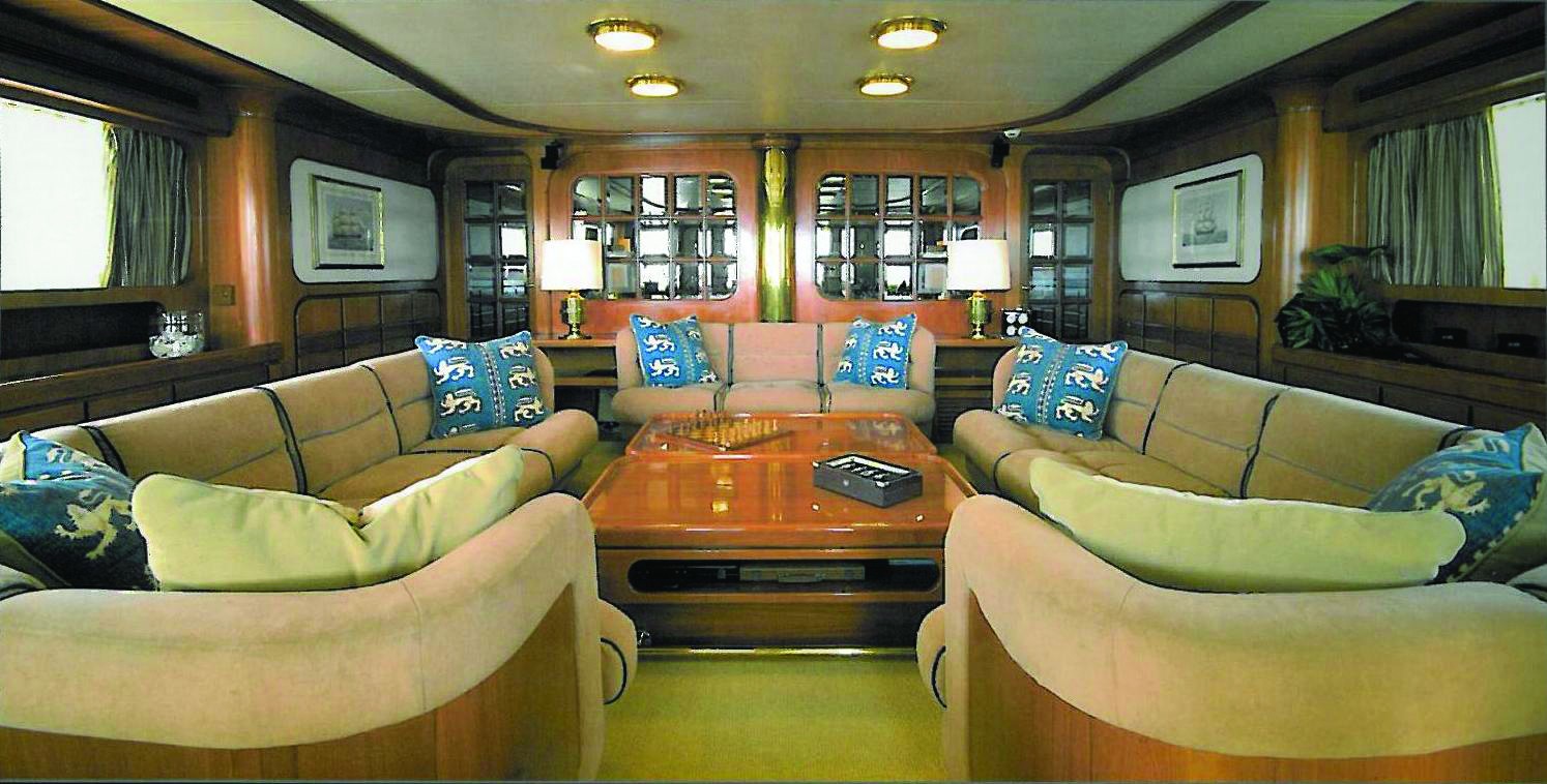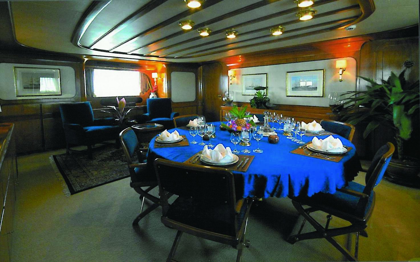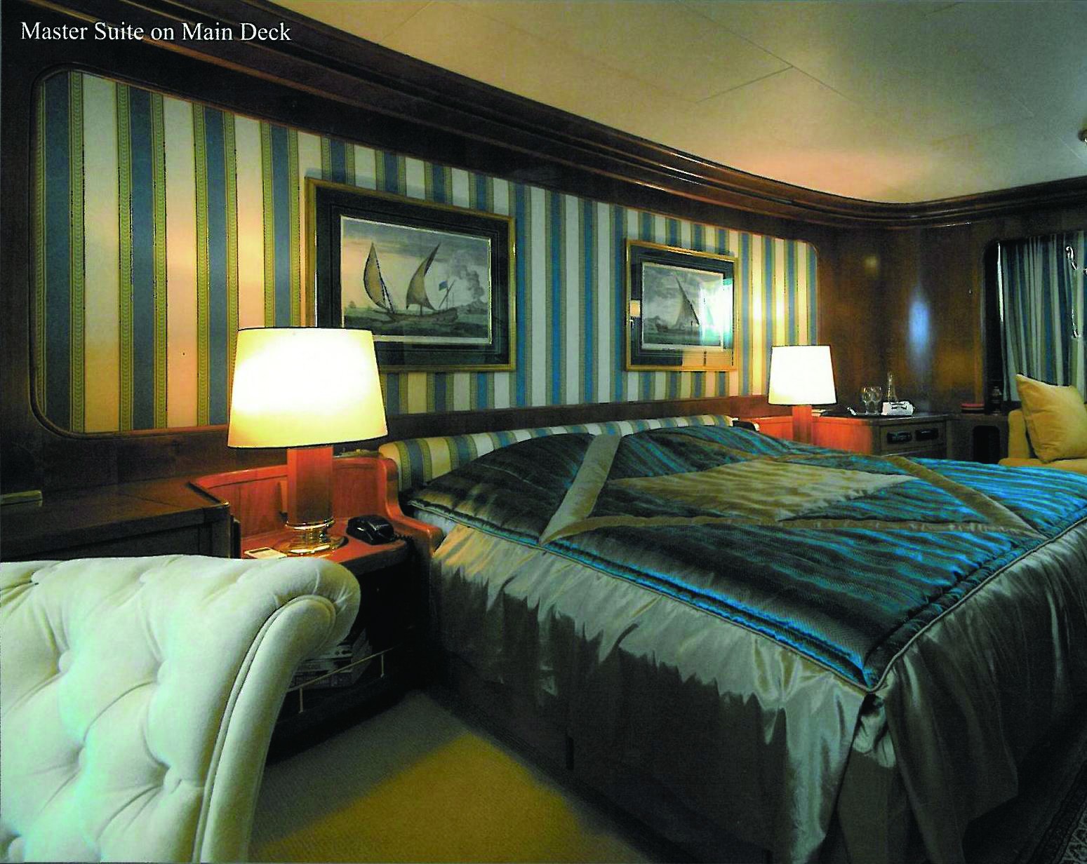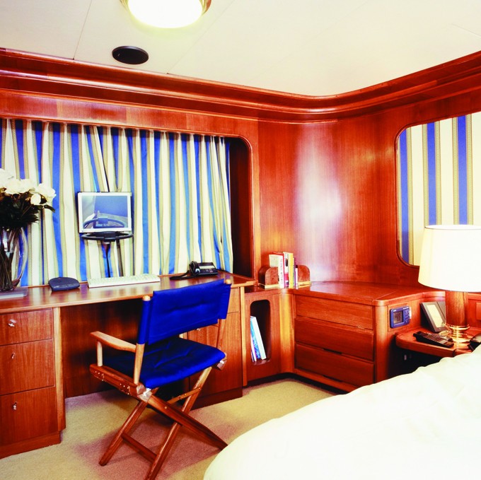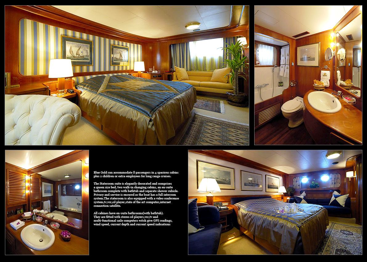 Blue Gold can accommodate up to 9 guests in 4 staterooms. The Master Cabin is located on the Main Deck and provides a King bed, office area, 2 walk-in closets, video conference system, TV, VCR/CD player and computer. The ensuite has a full tub and shower. The VIP Cabin offers a Queen bed with separate full bath and shower. 2 Twin Cabins, with combined tub and shower. (There is a single Pullman in each twin cabin which can accommodate a child). By special arrangement possible 5th cabin with Captains approval.
