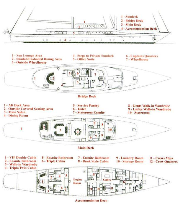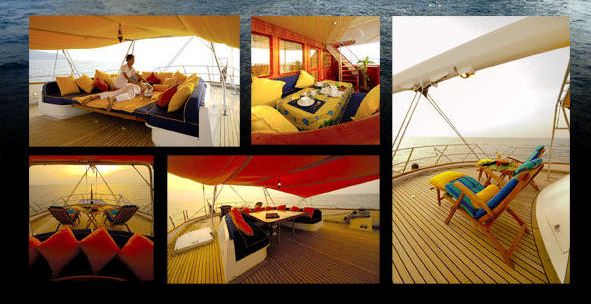 Blue Gold has 3 decks offering unrivalled comfort and relaxation in absolute privacy. She has vast deck space to rival a motor yacht and still offers a comprehensive list of modern amenities, toys and communications while not losing any of the elegance of a sailing yacht.