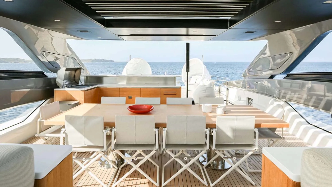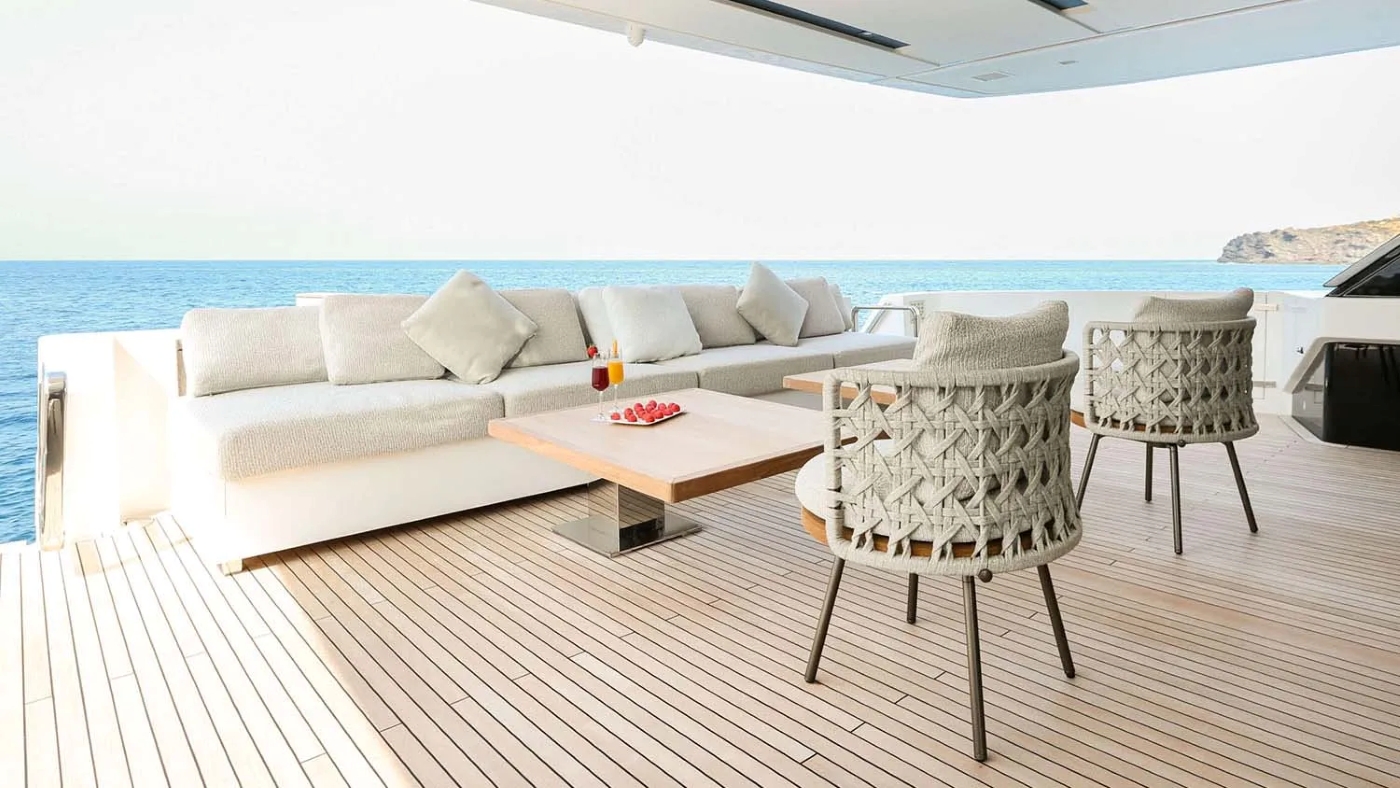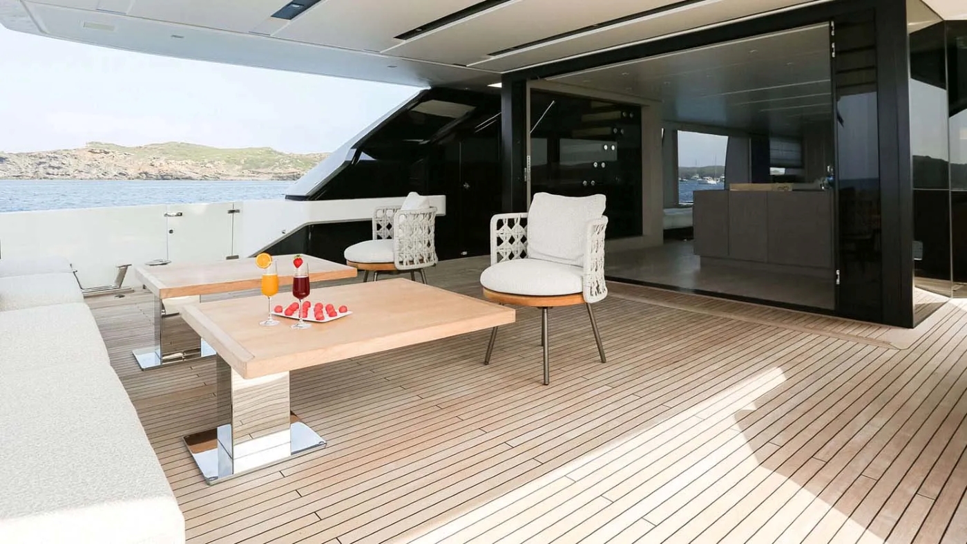 COOL’s striking exterior is matched by her smart layout across three expansive decks. The flybridge is a standout, complete with bar, dining table for ten, oversized sun pads, shaded lounging areas and commanding views — ideal for socialising from day to night. A retractable canopy provides optional cover for all-weather enjoyment.