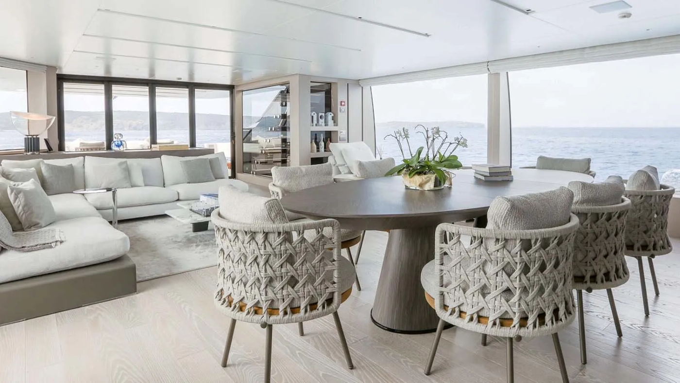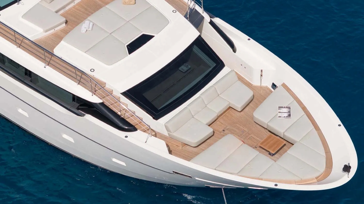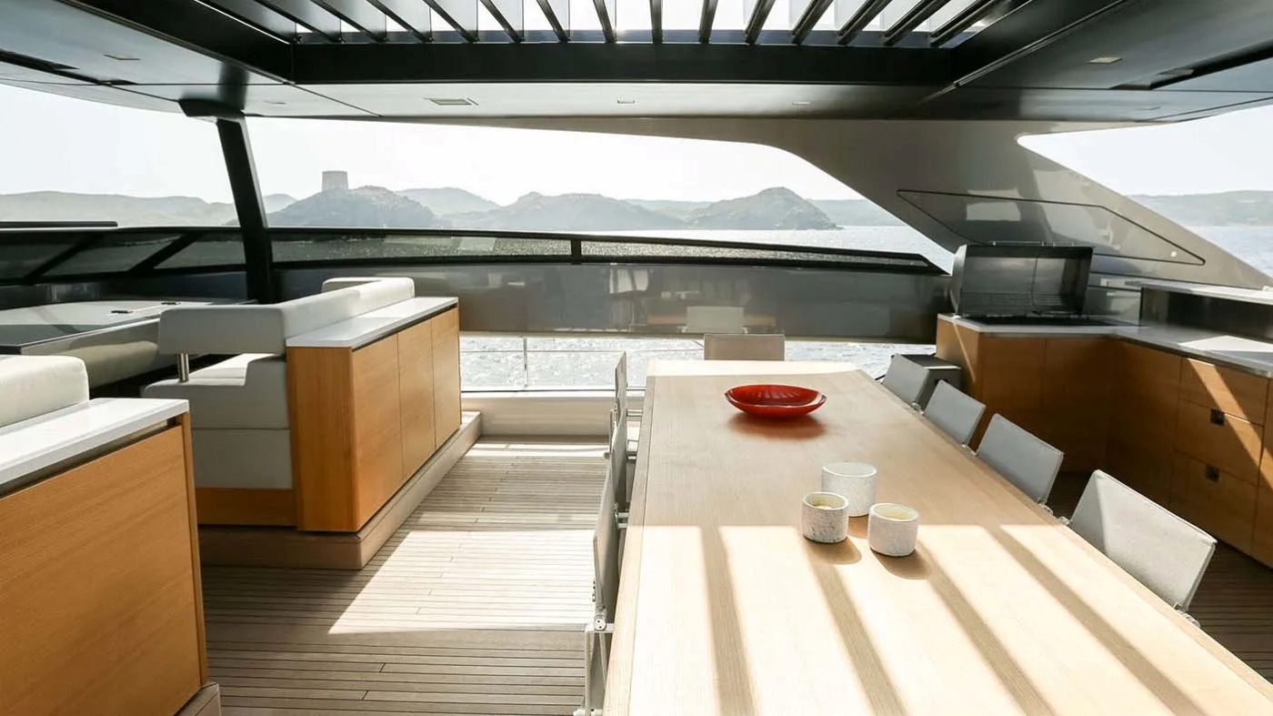 COOL’s striking exterior is matched by her smart layout across three expansive decks. The flybridge is a standout, complete with bar, dining table for ten, oversized sun pads, shaded lounging areas and commanding views — ideal for socialising from day to night. A retractable canopy provides optional cover for all-weather enjoyment.