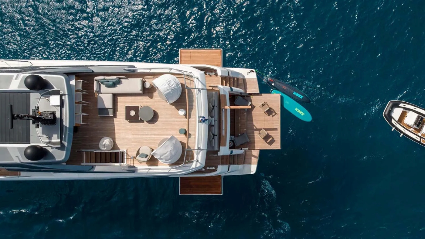Aft, the private beach club extends right to the water’s edge. With steps down to a swim platform and space to lounge by the sea, this area also functions as a launch point for her selection of water toys. Forward, the bow area features a sleek sunbathing zone which can be secured with a children’s safety net on request.