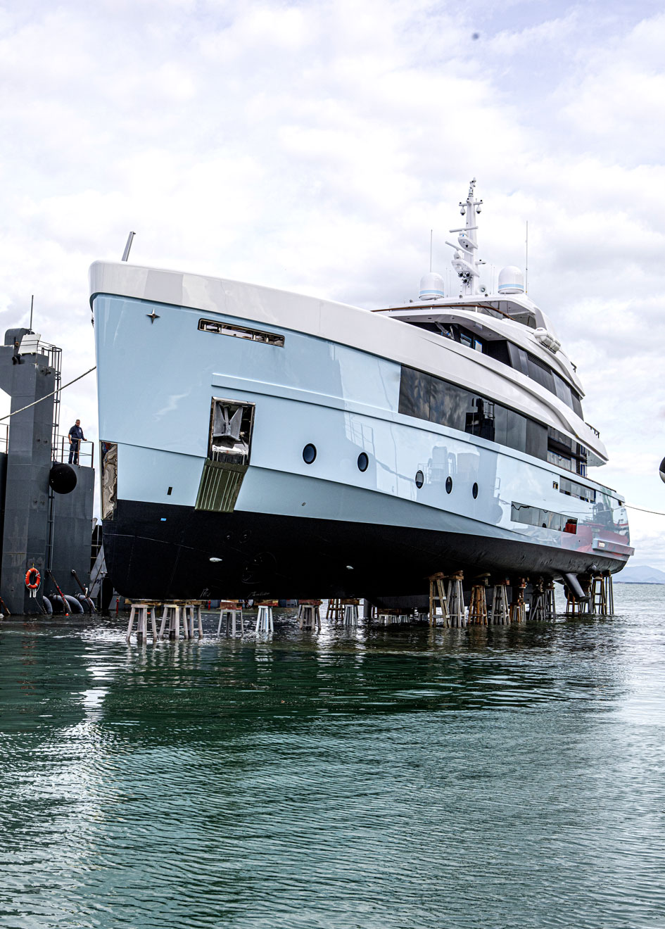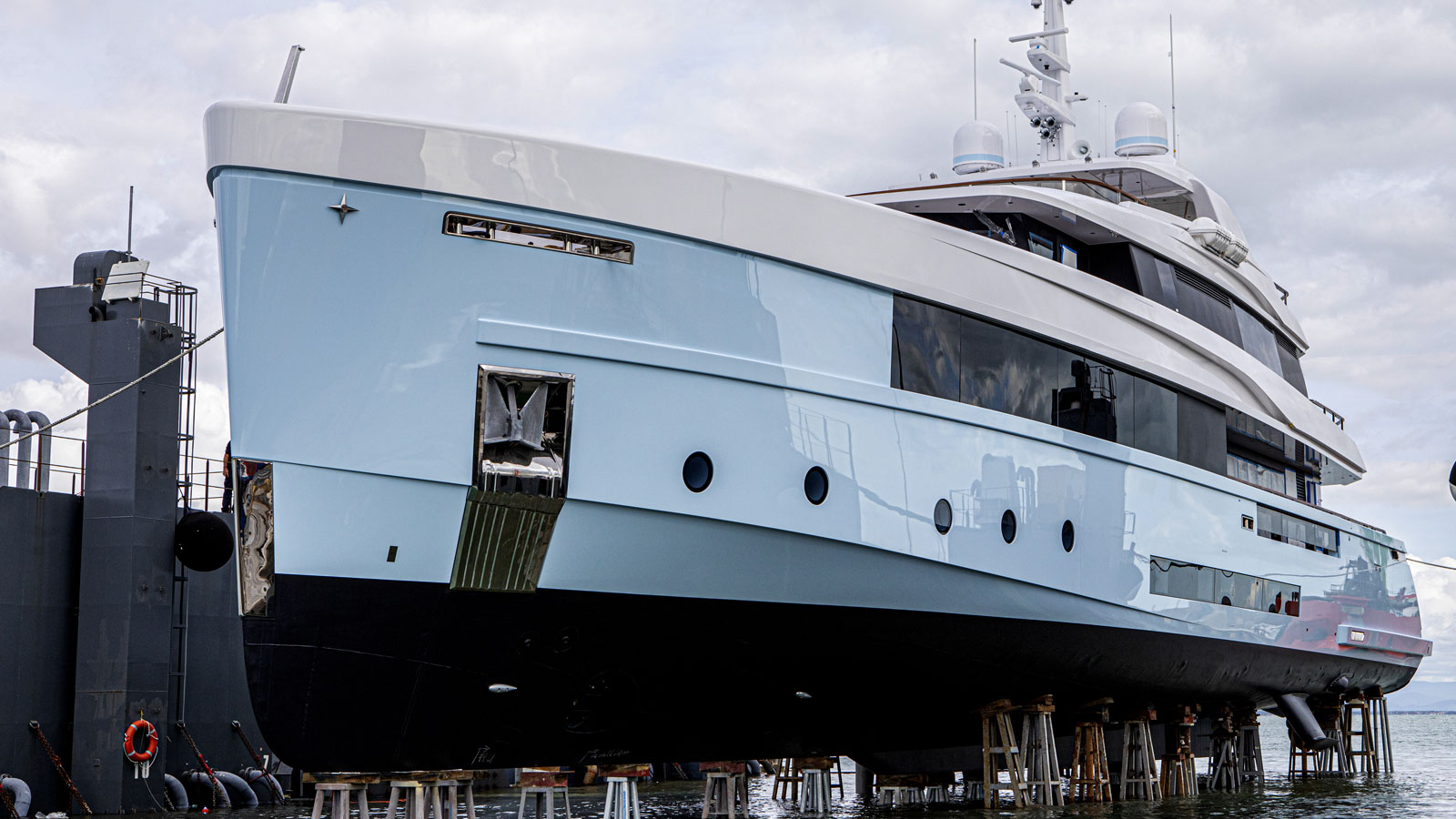 Designed with a light blue hull and white superstructures, the yacht boasts modern and straight lines, which add to her classic yet striking look.