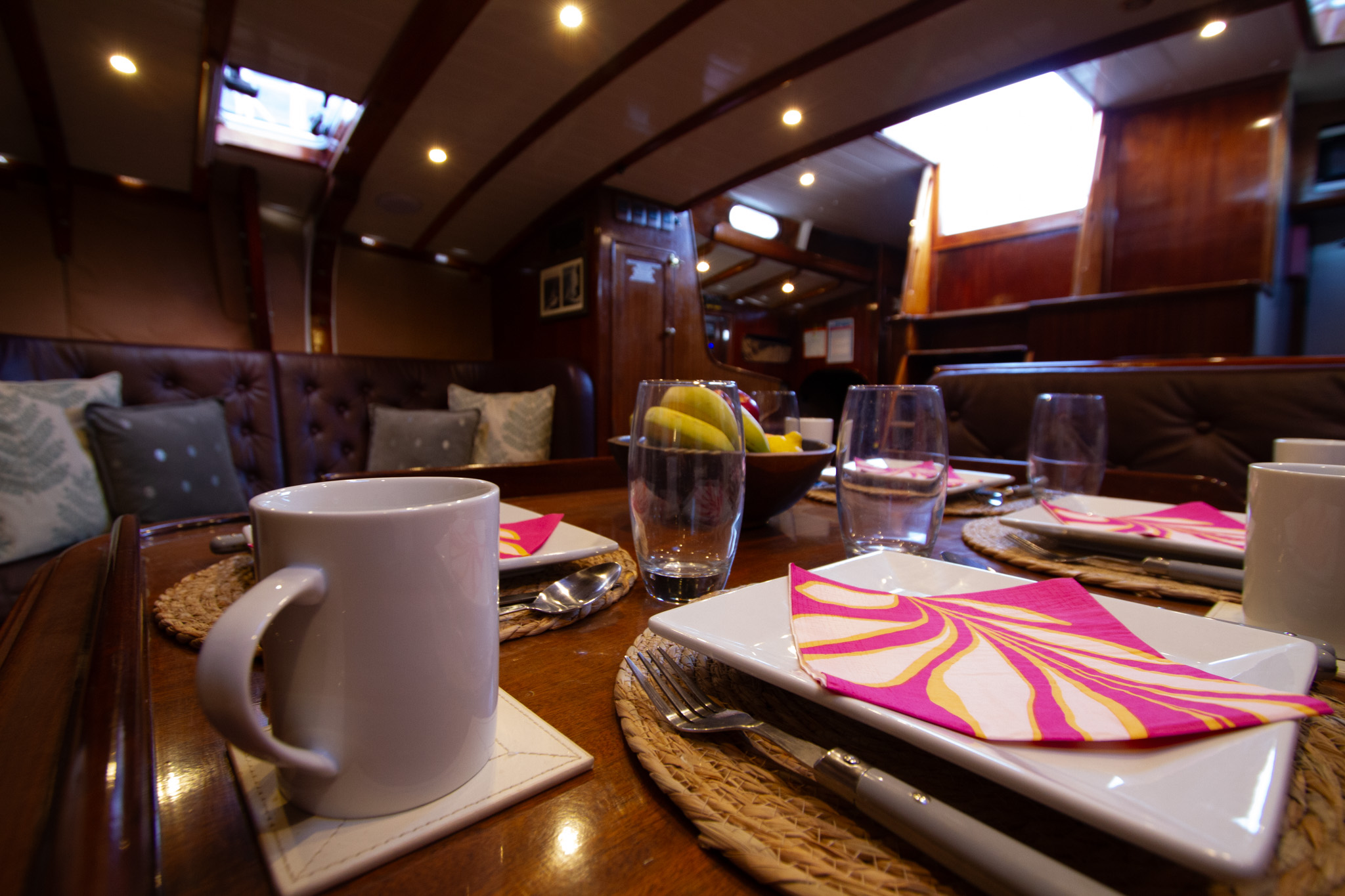 She accommodates up to 4 guests overnight, typically arranged as two couples. The interior features a spacious saloon with dining and seating, a full-beam aft owner’s cabin, and a forward double cabin, each with en-suite facilities. Her layout is ideal for couples.