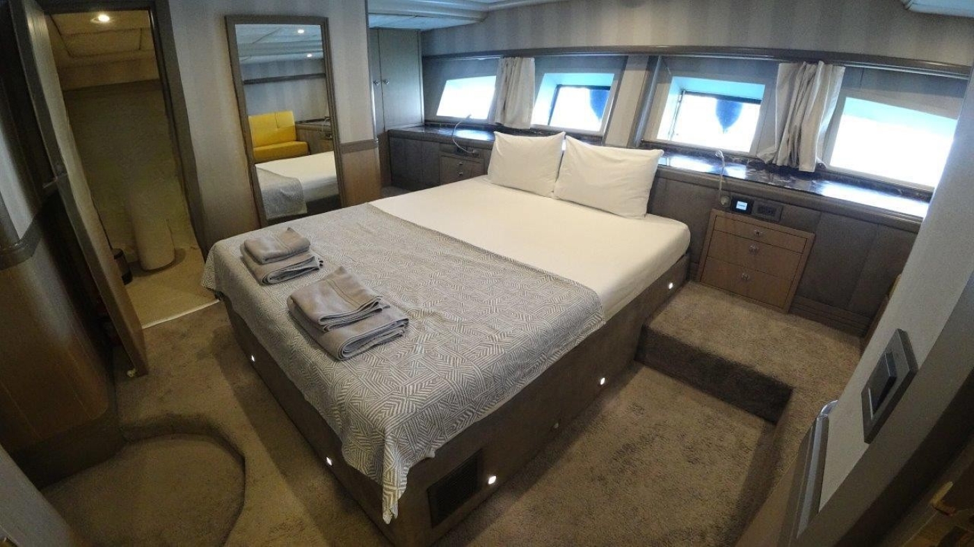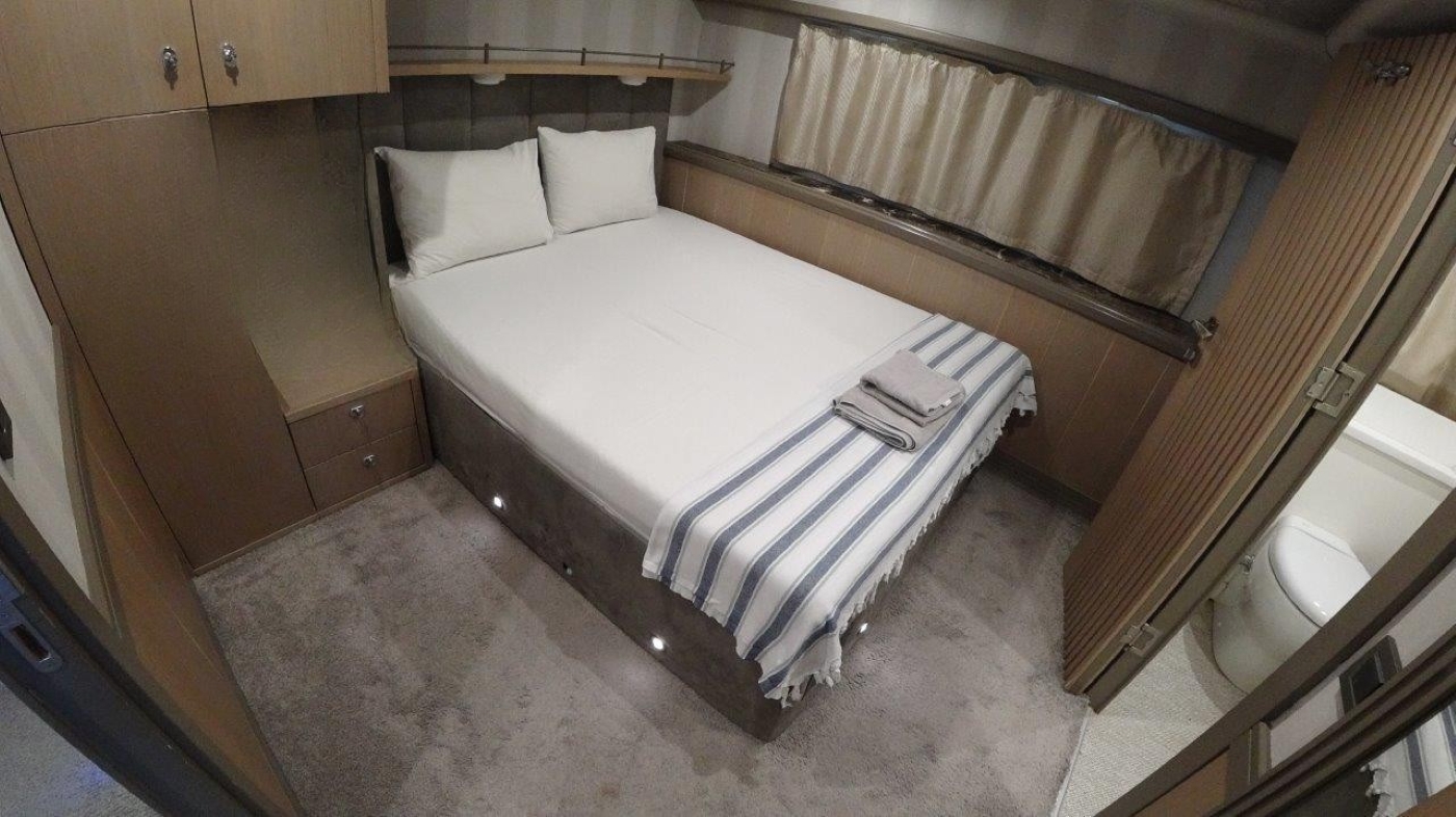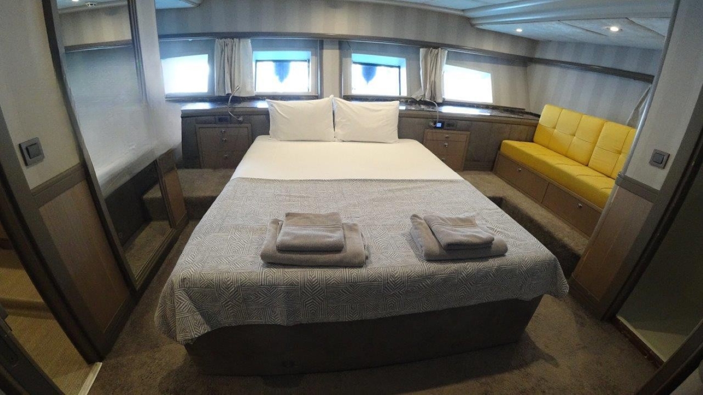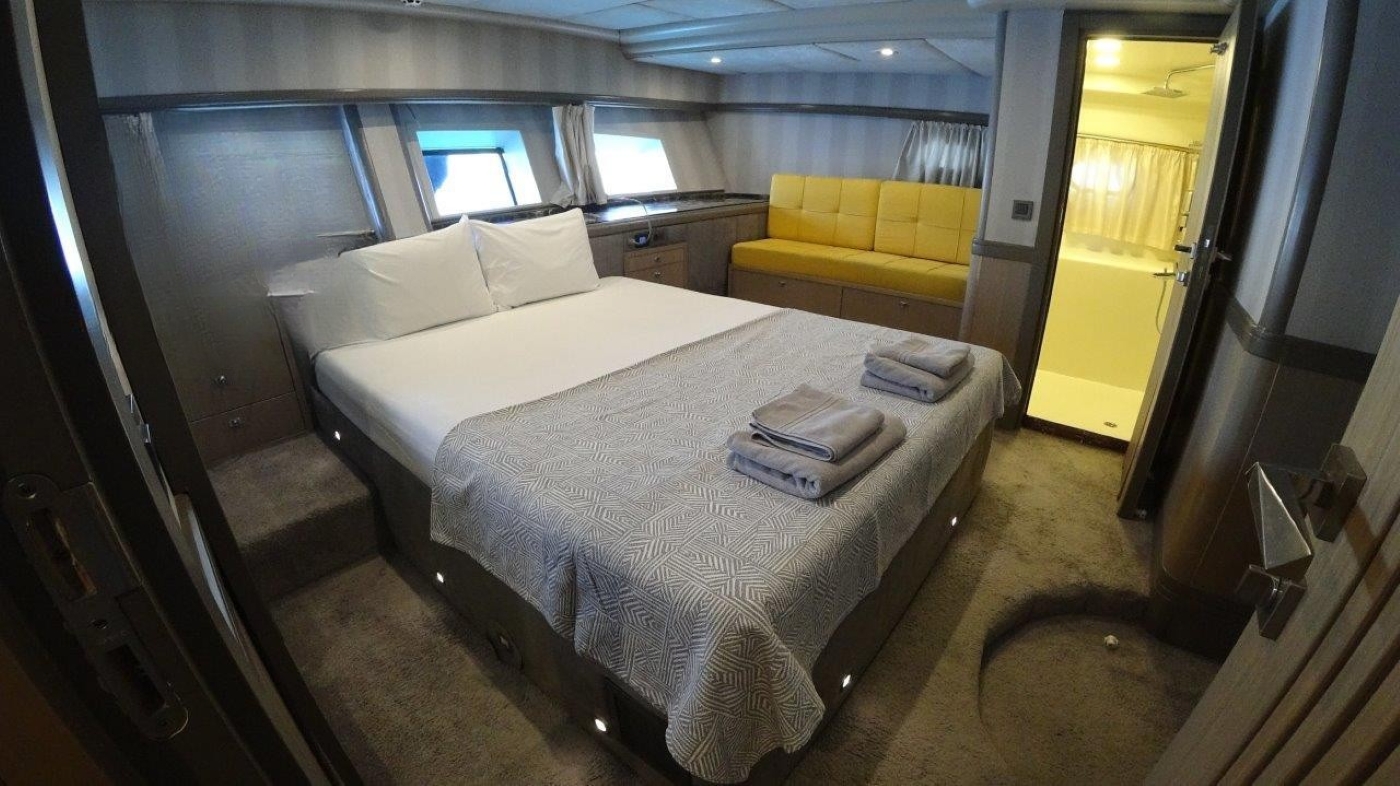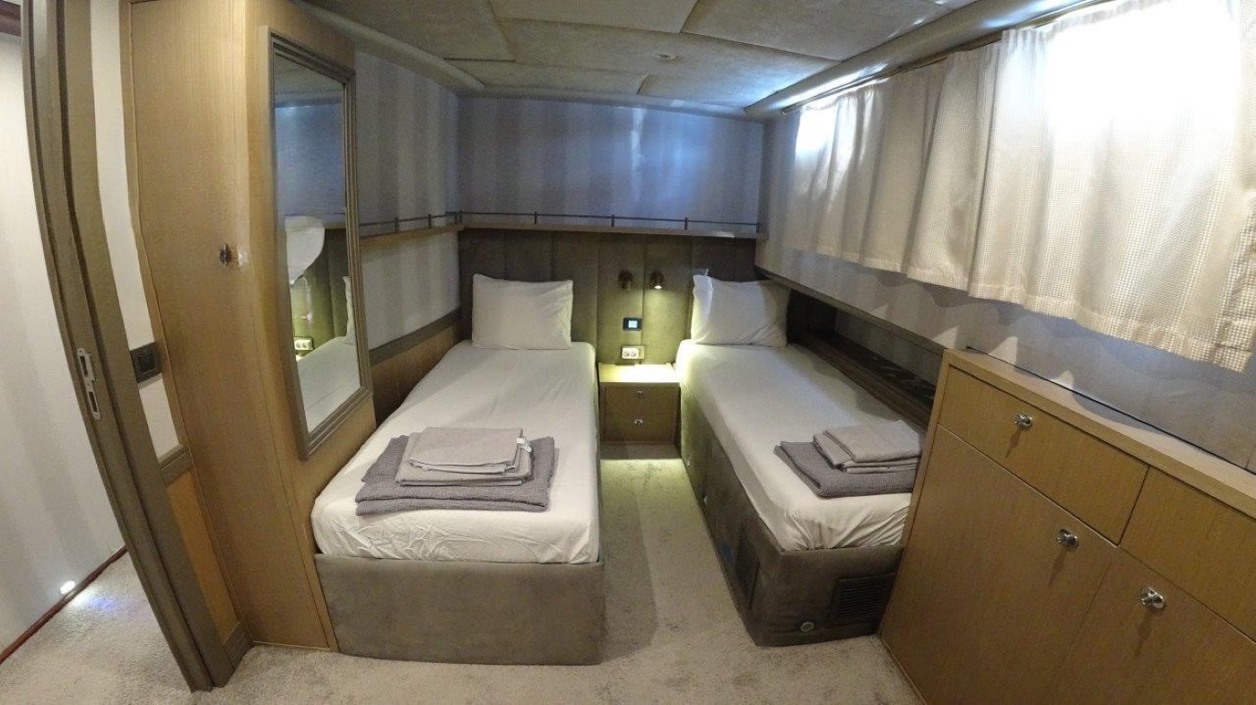 ~ Aft Master Cabin: King bed (200 x 200) + optional extra single (185 x 80), en suite ~ Bow Master Cabin: Queen bed (200 x 182), en suite ~ 2 Double Cabins: (190 x 160), both en suite ~ 1 Twin Cabin: Single beds (190 x 85), en suite