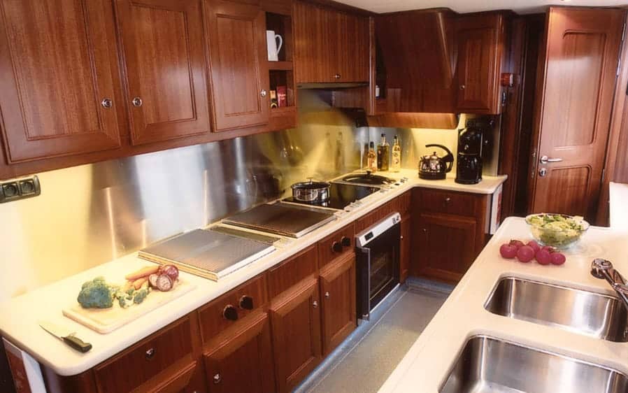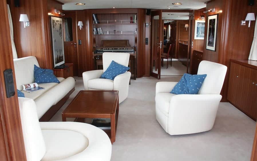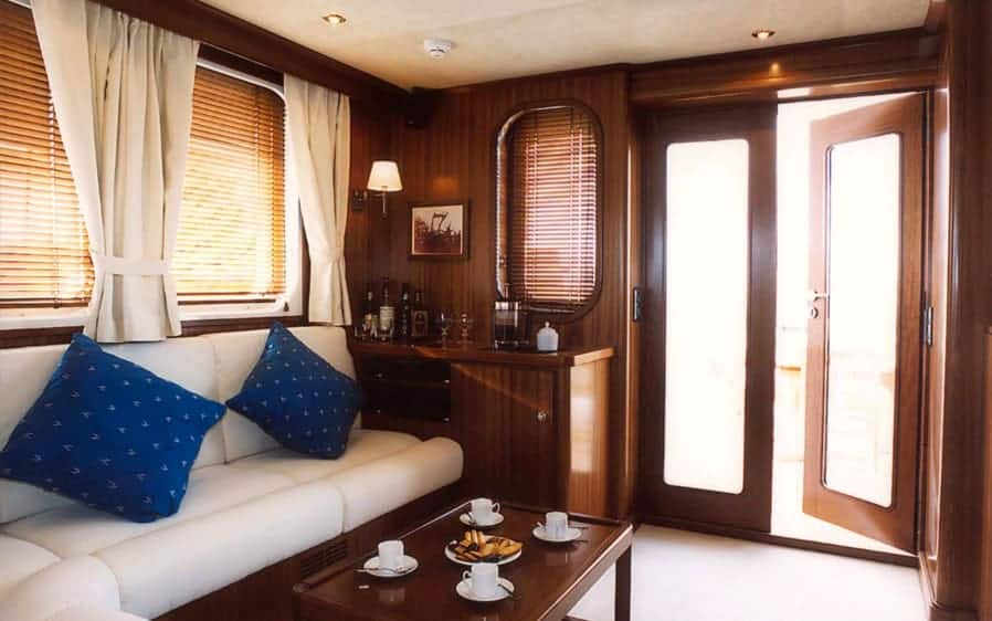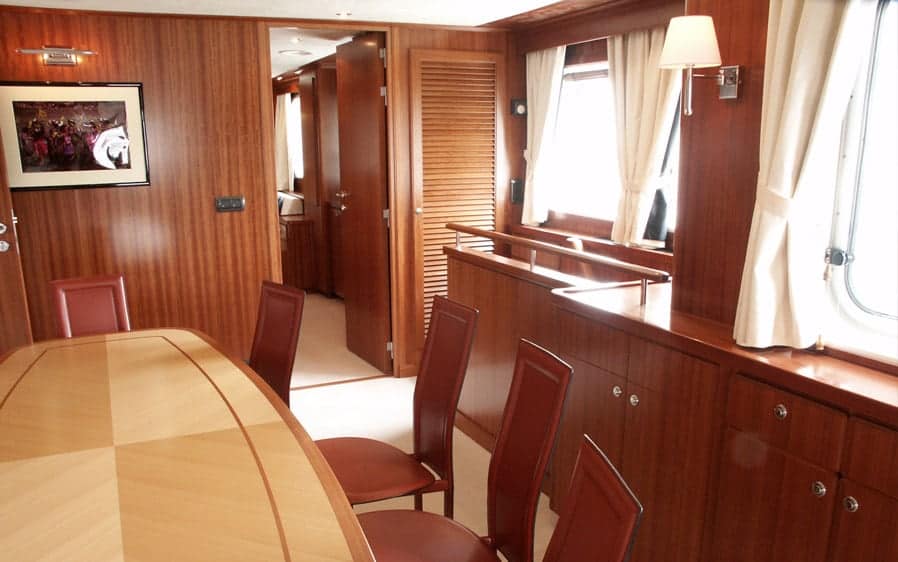 The main salon has an airy lounge and a dining area. The upper deck lounge offes a more intimate atmosphere and is euqipped with an A/V entertainment system.