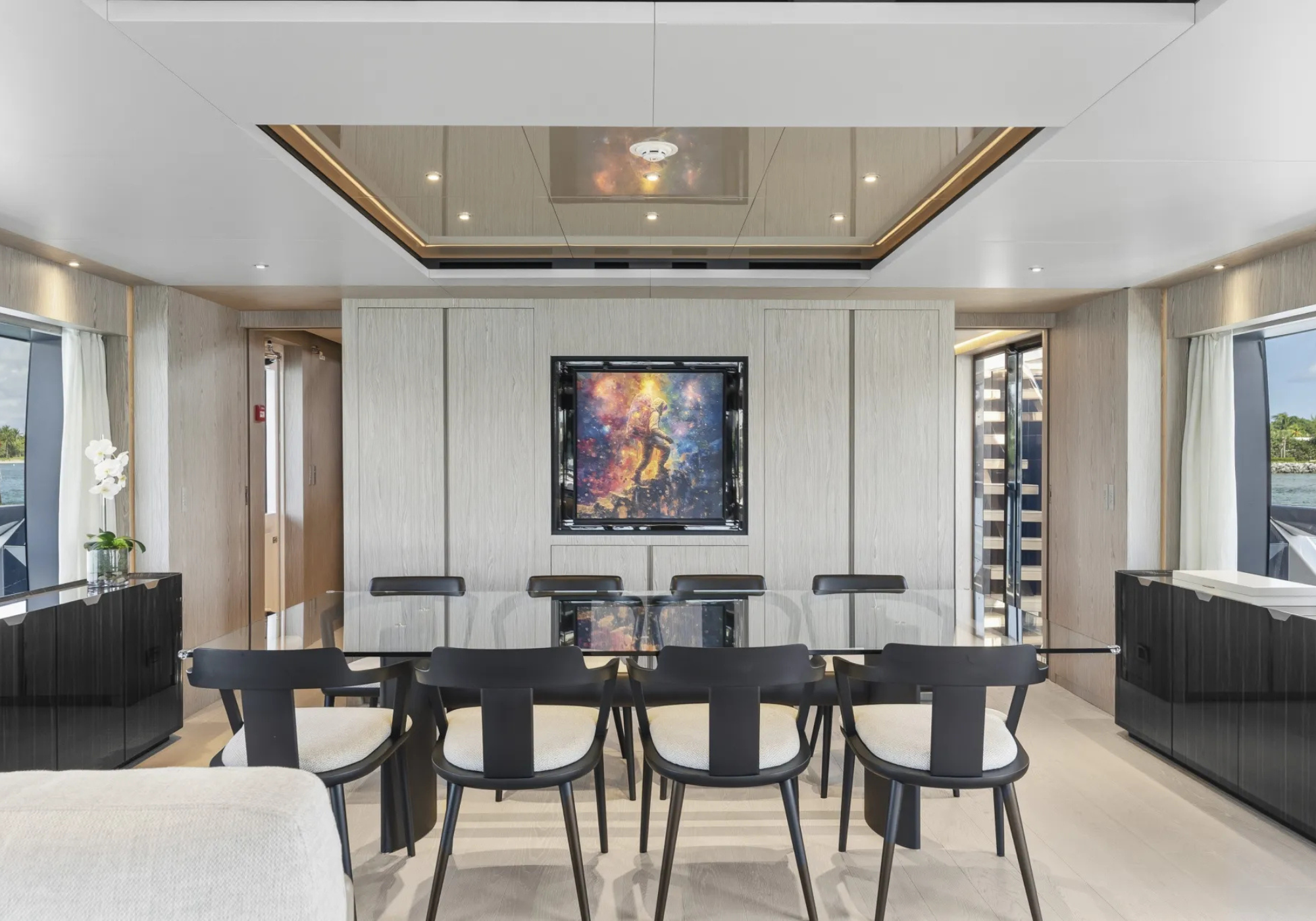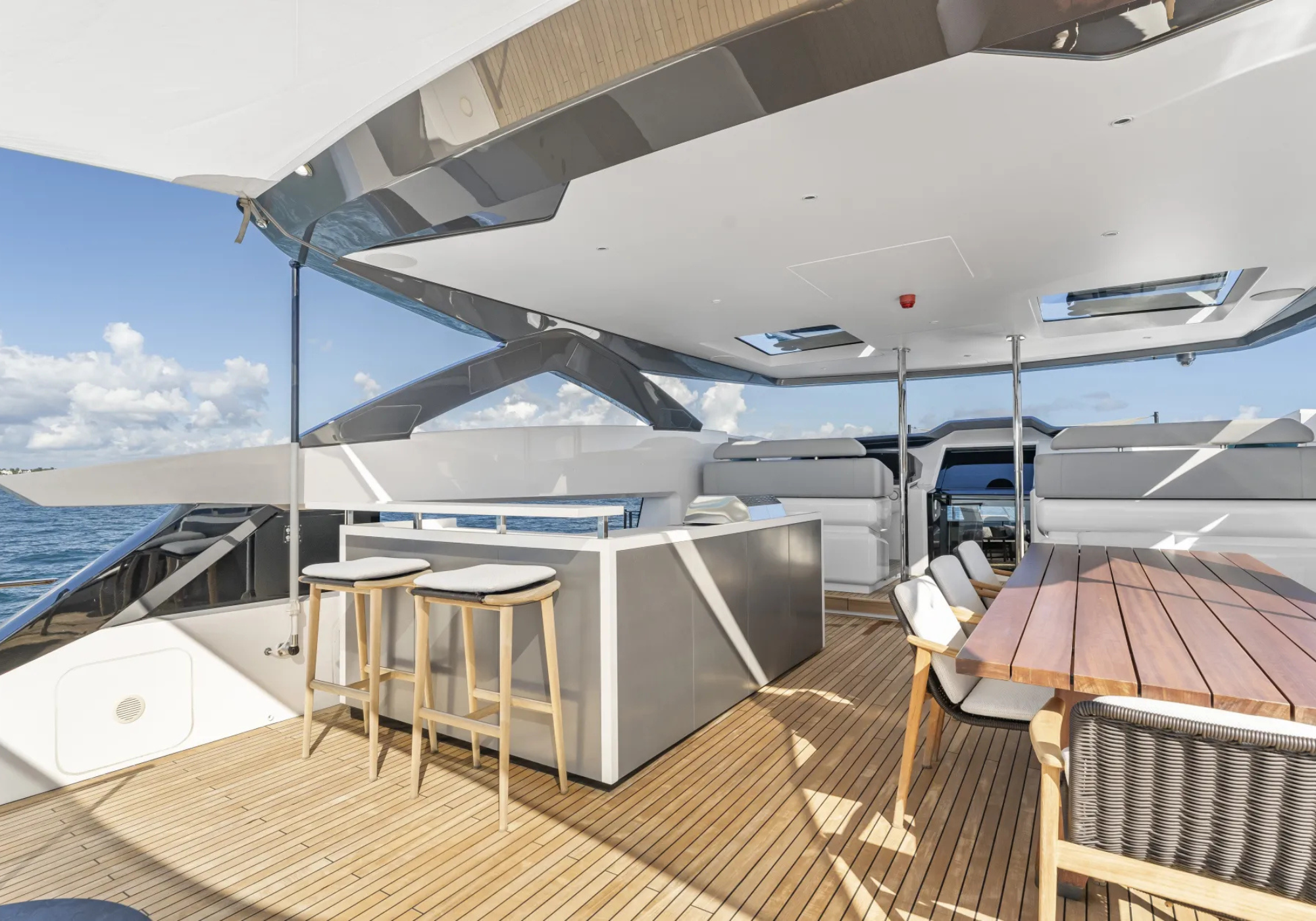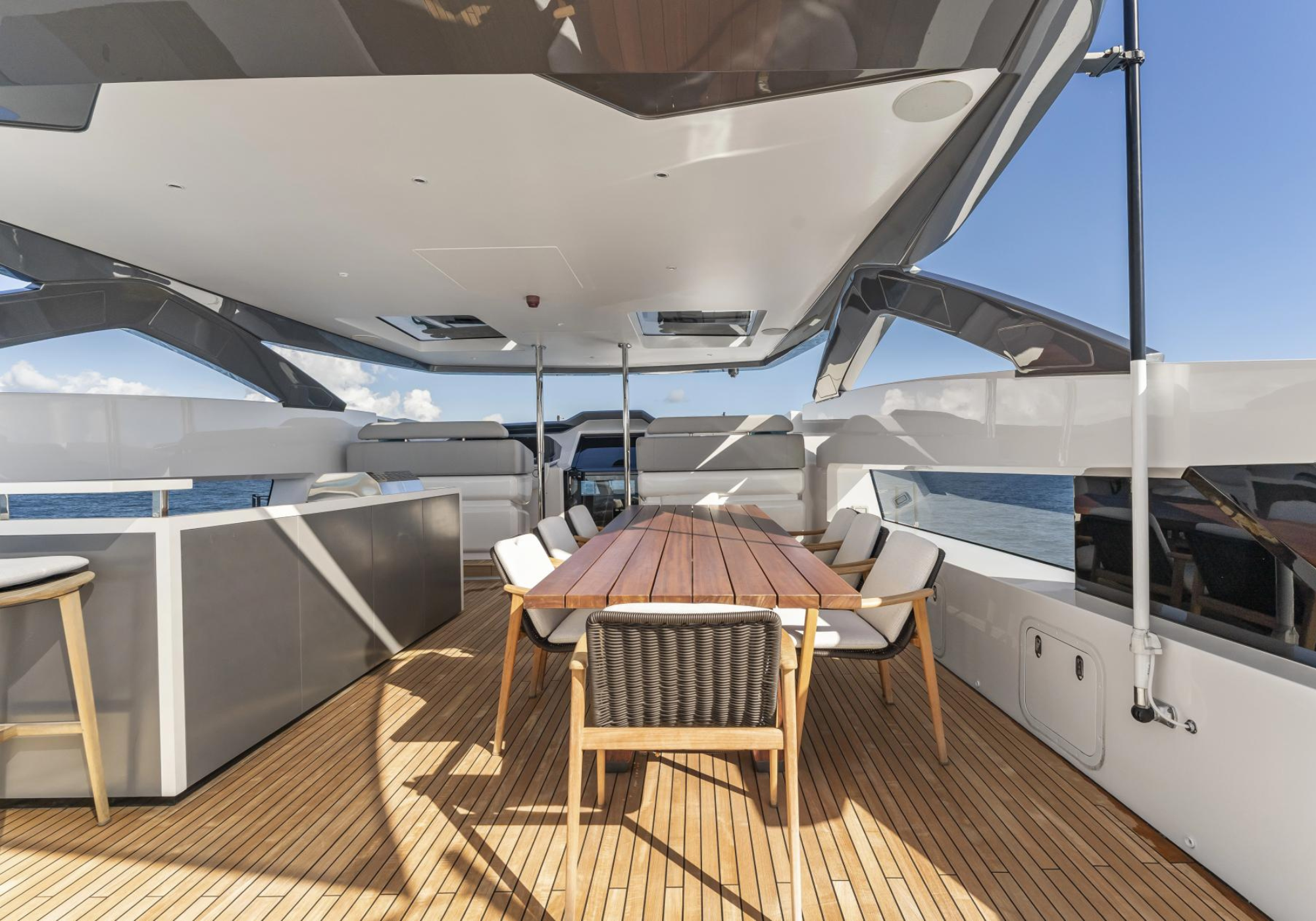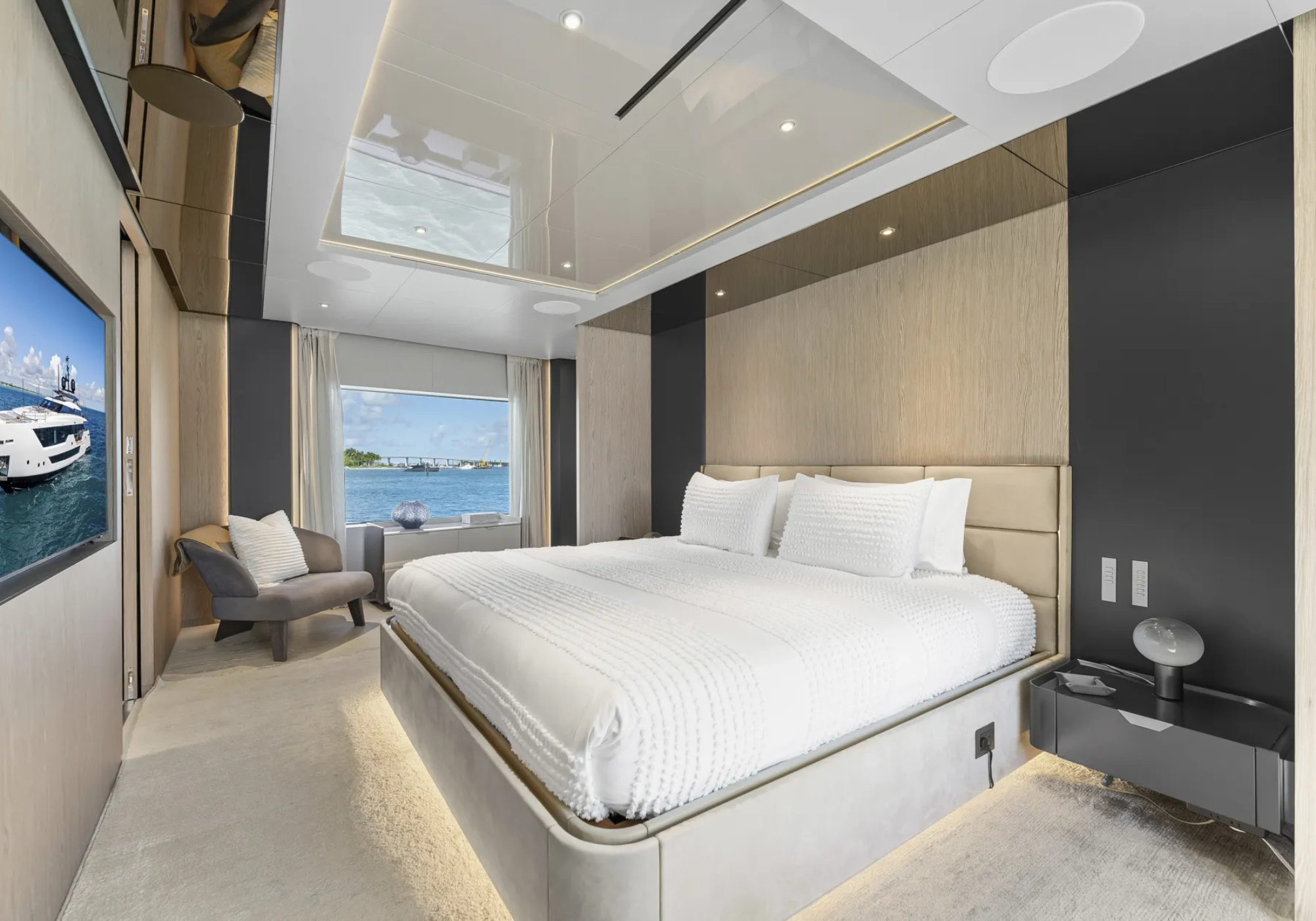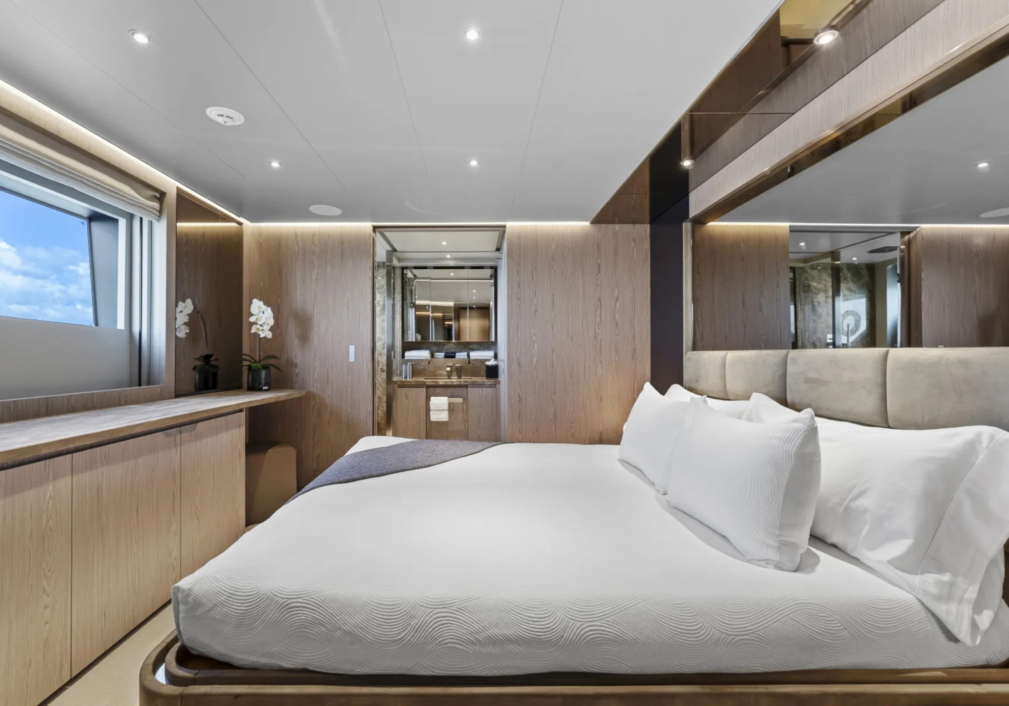 Guest Accommodation: ~EVEXIAS sleeps up to 8 guests across five staterooms. ~The full-beam master suite is positioned on the main deck, complimented with a King sized bed en-suite with his and hers sinks, plentiful storage and a safe. Lower deck features: ~2 VIP staterooms with Queen sized beds. ~1 fixed Twin stateroom. ~1 convertible Twin staterooms that can be converted to a King. ~All cabins accompanied by their own en-suites.