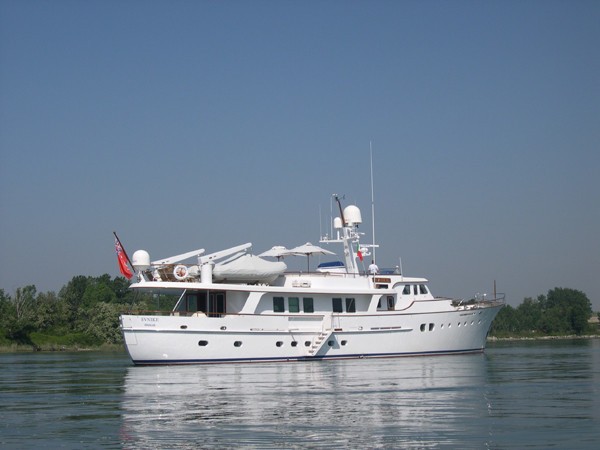 The yacht's general design work came from Willem De Vries Lentsch Jr. The formal naval architect intellectual property are the products of Willem De Vries Lentsch Jr. Motor Yacht EVNIKE received her stylish interior designing from the interior design company of Willem De Vries Lentsch Jr. Built by Lowland Yachts Bv the yacht was fabricated in the recognised yachting country the Netherlands. She was officially launched in Zoeterwoude in 1996 before being transferred to the owner. Her hull was constructed with steel. The motor yacht main superstructure is made for the most part with aluminium. With a width of 6.19 metres or 20.3 feet EVNIKE has moderate internal space. A fairly shallow draught of 2.53m (8.3ft) determines the amount of marinas she can enter into, taking into account their minimum depth at low tide.