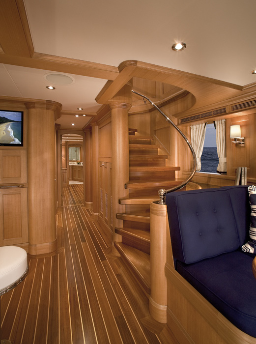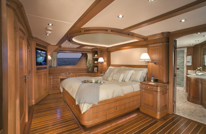 Miss Lisa superyacht's main deck master suite features a king sized bed, entertainment centre and marble en-suite bath. Three additional queen-berthed guest staterooms are on the lower level all with marble en-suite baths. Further aft, two additional cabins, each finished to guest standards, accommodate four crew or additional guests. Anigre, a non-threatened wood was chosen for Miss Lisa motoryacht's exquisite interior joinery and cabinetry.