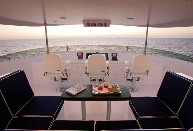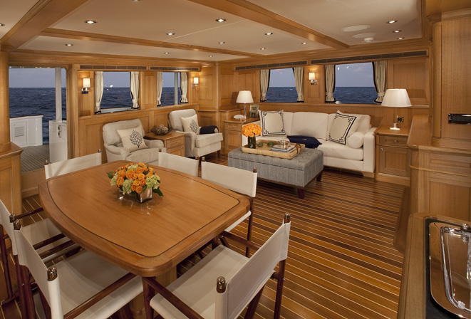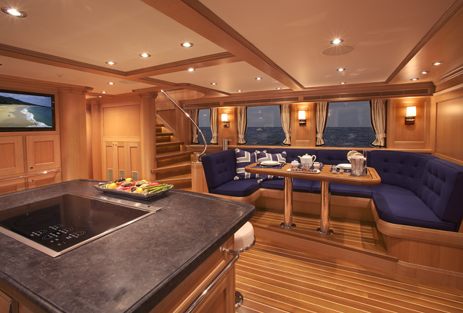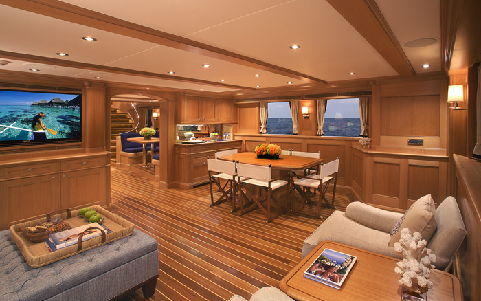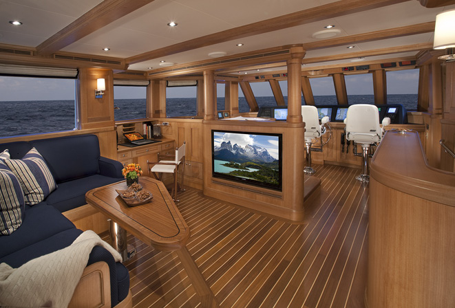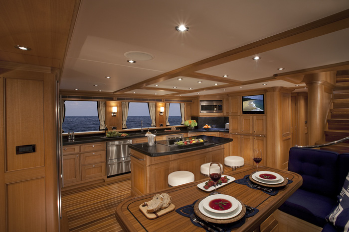 Expedition Yacht Miss Lisa's large 25 foot beam offers vast interior spaces, still enabling a full walk-around on the main deck and the advantage of recruiting fewer crew. The salon and dining area for a formal setting; the galley superb for casual and festive entertainment and the sky lounge with sweeping 360 degree views make it a perfect retreat; comprise more than 1,200 square feet all together.