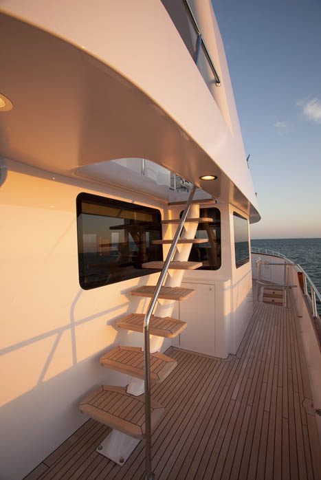 Massive 10-inch teak caprails were installed on all bulwarks with teak decking on all levels except the flybridge. Two highly-polished, custom stainless steel anchor winches, complete with polished stainless anchor troughs and gold plated control levers, adorn the foredeck of the expedition yacht Miss Lisa. Stainless steel handrails and safety rails accent this area with a large Portuguese bulwark for added protection to the pilothouse.