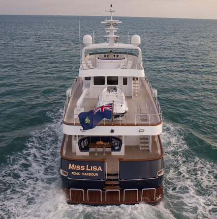 One of the many features of the expedition yacht Miss Lisa is her extended boat deck capable of securing a 22-foot tender.