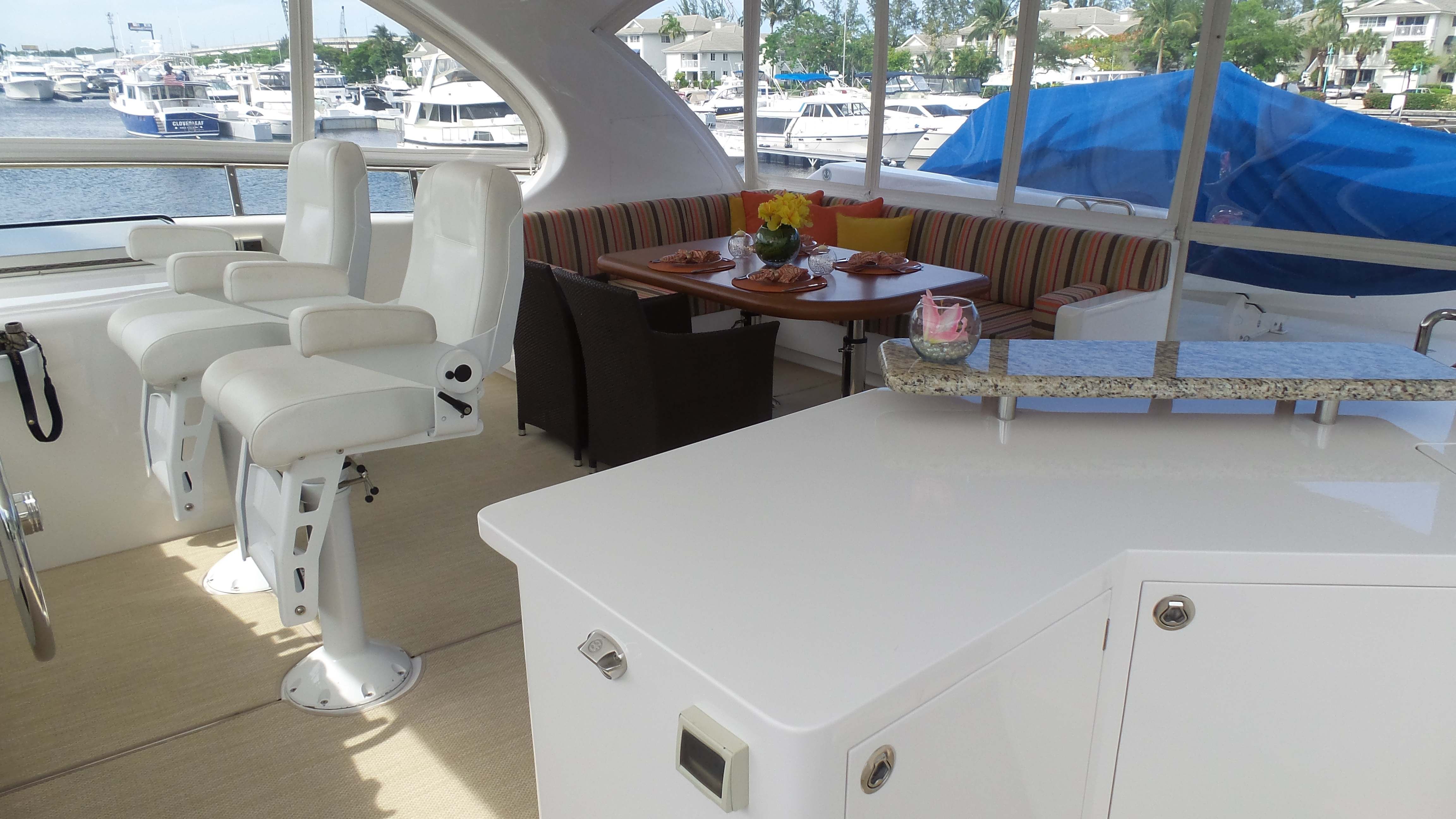 Charter yacht First-A-Fence has an elegant interior of beautifully furnished wood floors and plush leather soft furnishings. The décor is minimalistic with African embelishments and is warm and welcoming. Upon entering the salon is the open planned galley which features a large breakfast bar with fitted stools- perfect for entertaining!. The salon features a large lounge area with an L shaped sofa, coffee table and an artfull ascending staircase to the fly bridge. Forward of the salon is the full beam master cabin with a king sized bed, sofa, pop up TV, vanity and en-suite facilities. The VIP Cabin, fitted with a queen sized bed is in the starboard forward hull with a TV and en-suite facilities. The boat is entirely air conditioned and has wifi access (location dependant).