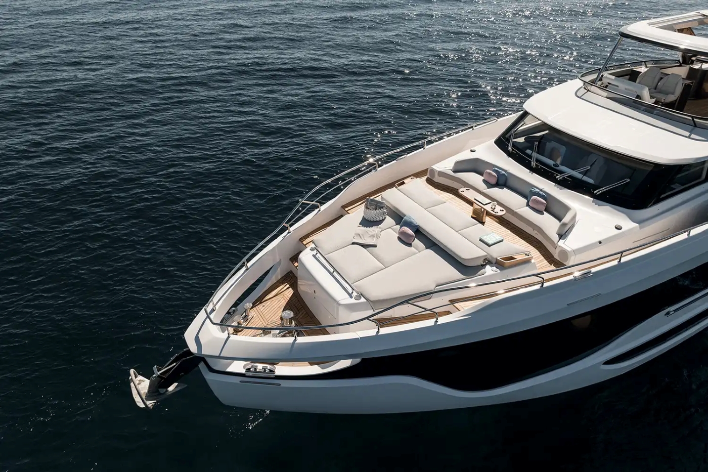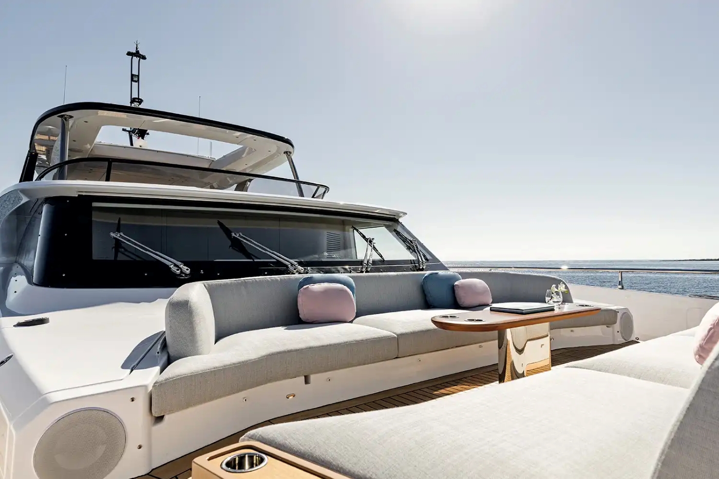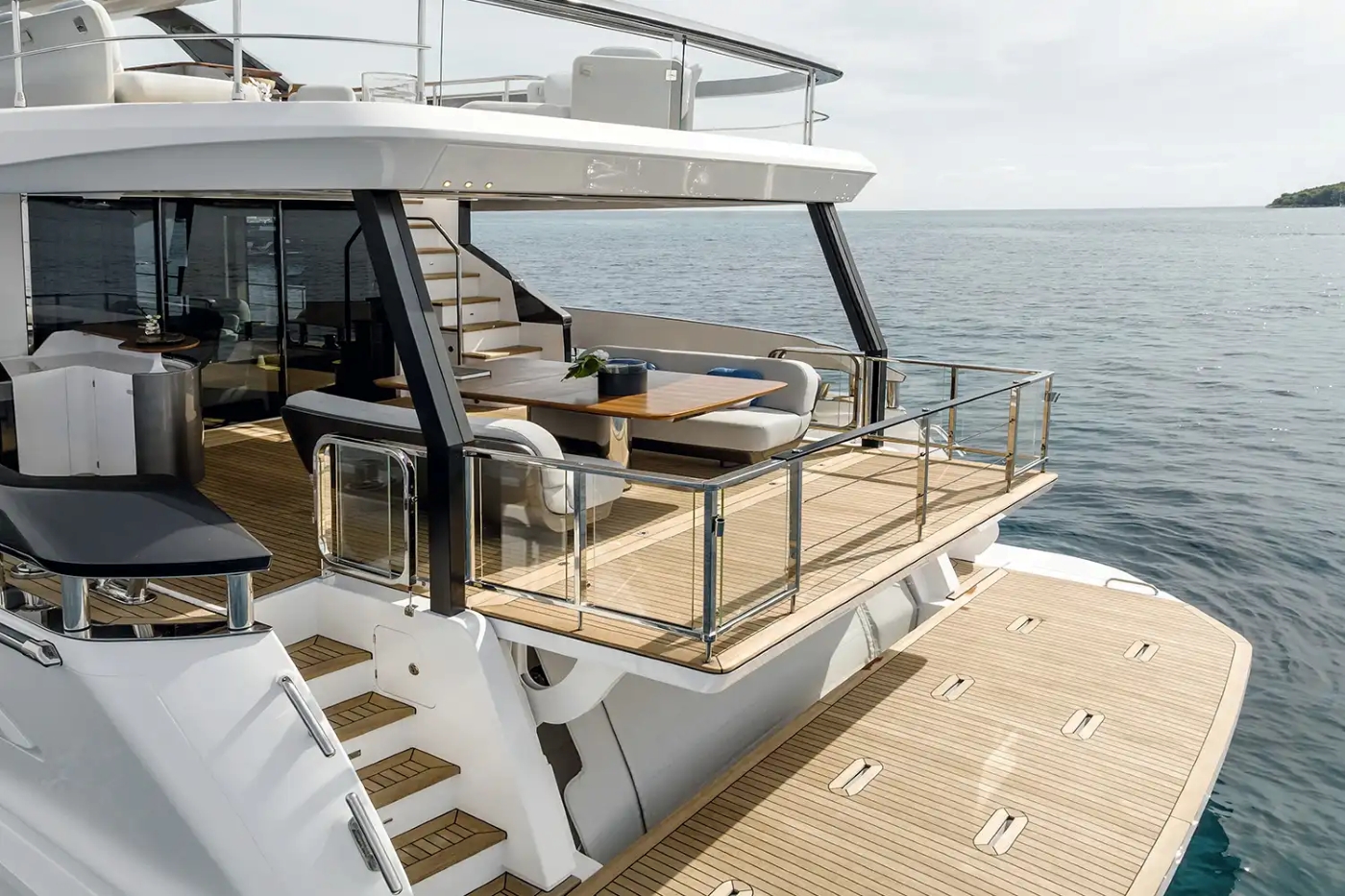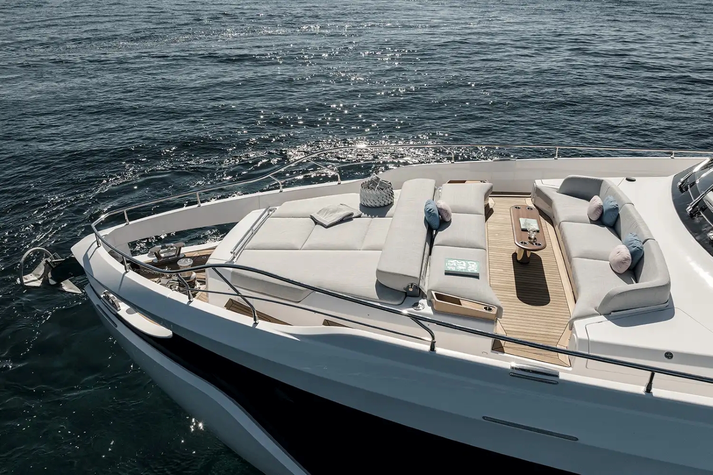 Wide side decks and well designed walk around access ensure seamless movement around the yacht, while a hydraulic bathing platform offers convenience for swimming or boarding a tender. The foredeck includes a sun pad and built in seating, rounded off with refined stainless steel and teak finishes — a balanced combination of comfort and refined styling.