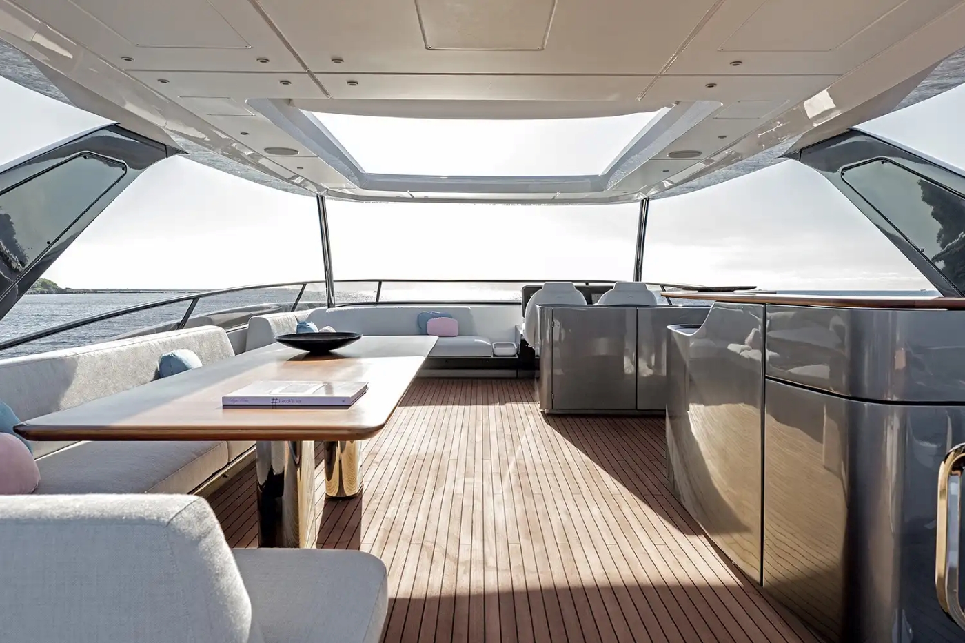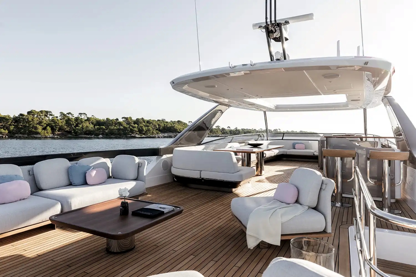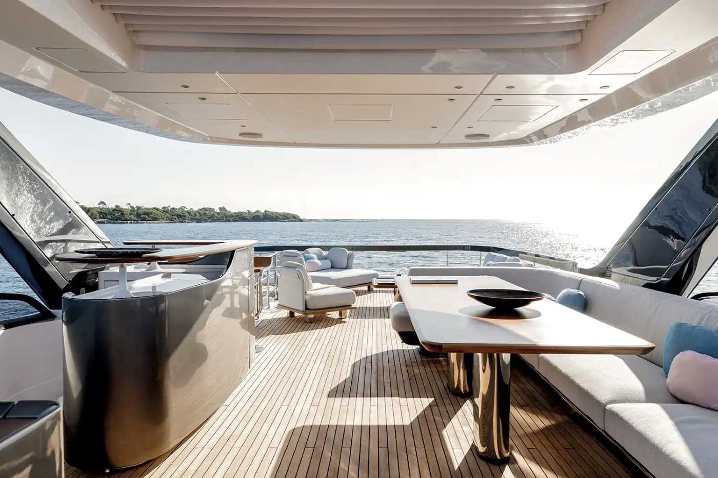 Wide side decks and well designed walk around access ensure seamless movement around the yacht, while a hydraulic bathing platform offers convenience for swimming or boarding a tender. The foredeck includes a sun pad and built in seating, rounded off with refined stainless steel and teak finishes — a balanced combination of comfort and refined styling.