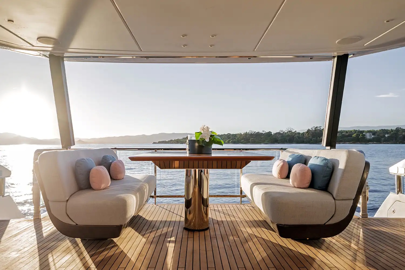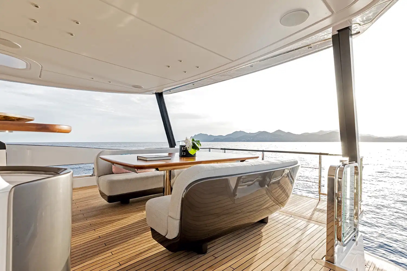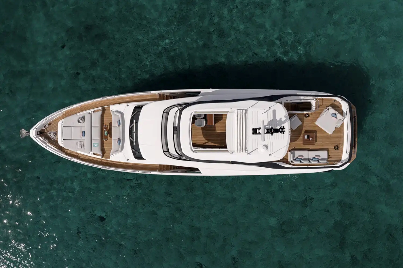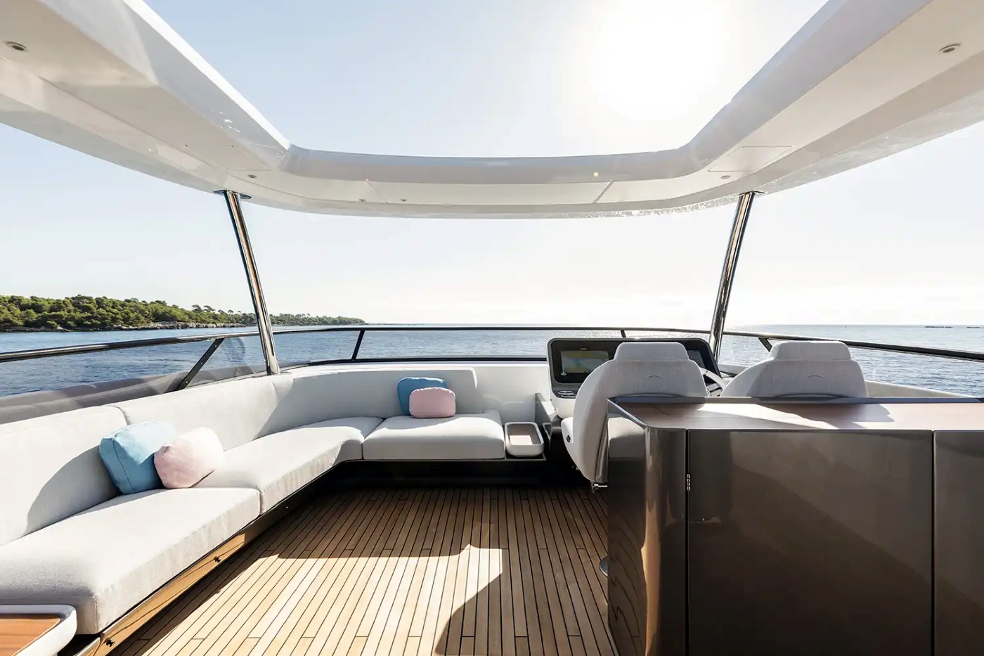 Wide side decks and well designed walk around access ensure seamless movement around the yacht, while a hydraulic bathing platform offers convenience for swimming or boarding a tender. The foredeck includes a sun pad and built in seating, rounded off with refined stainless steel and teak finishes — a balanced combination of comfort and refined styling.