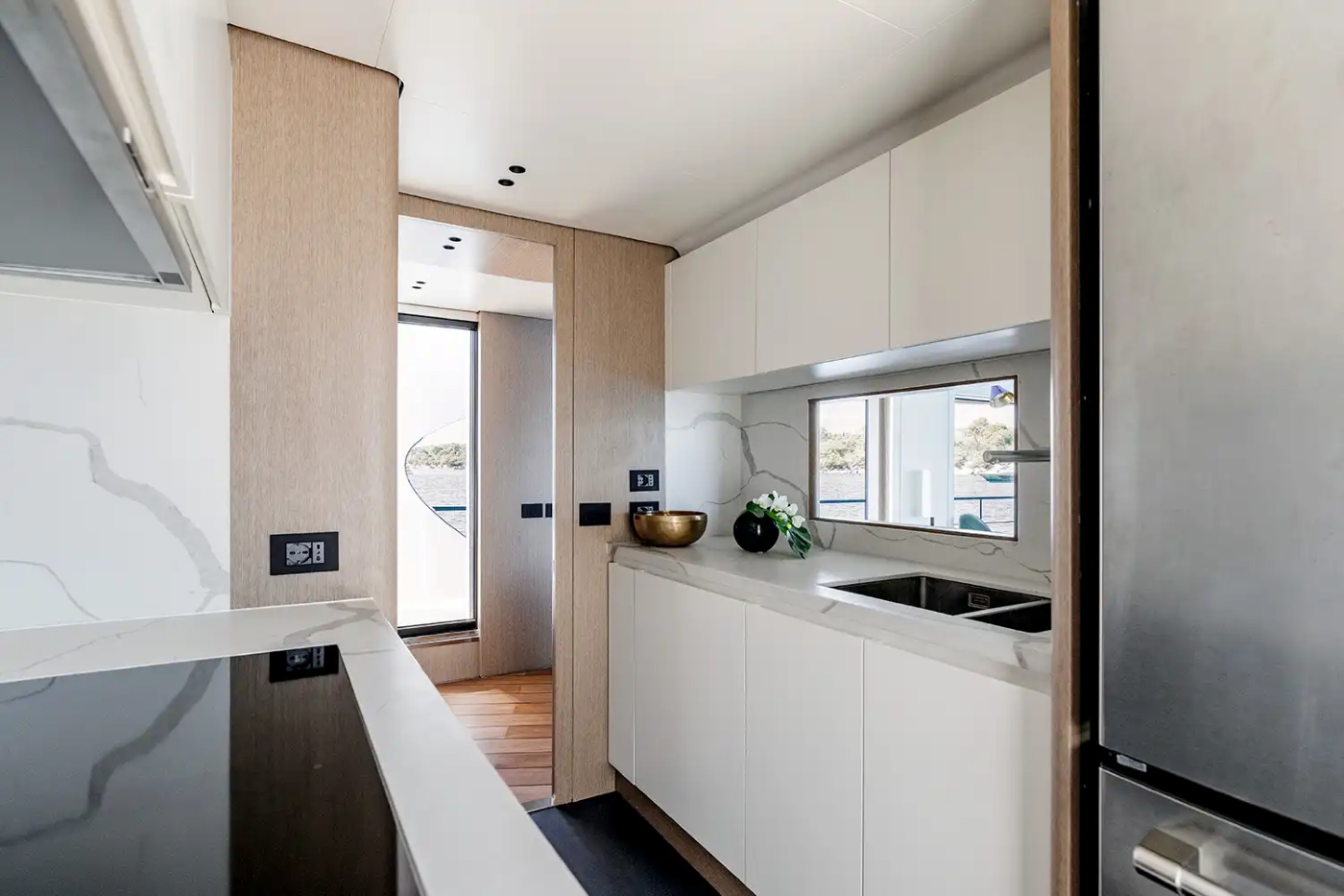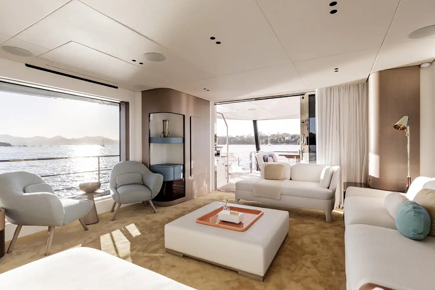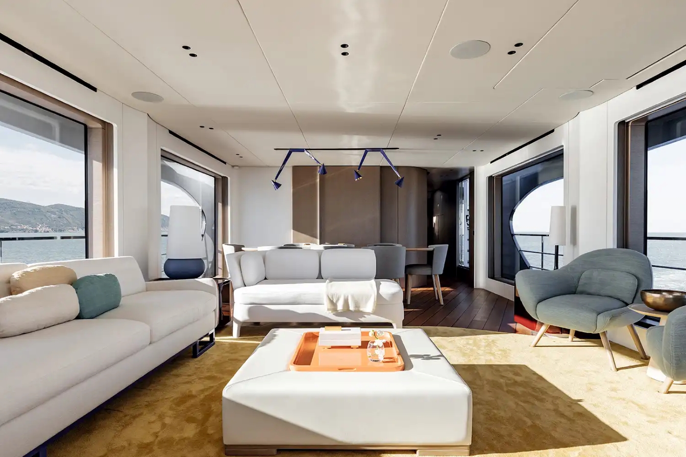 The main salon flows seamlessly into a dining area and galley, offering an open plan layout that encourages sociable living. Furniture is freestanding — a hallmark of superyacht design — allowing flexible arrangement depending on guest needs. Natural materials, refined finishes and careful lighting reinforce a sense of understated luxury and homely elegance.