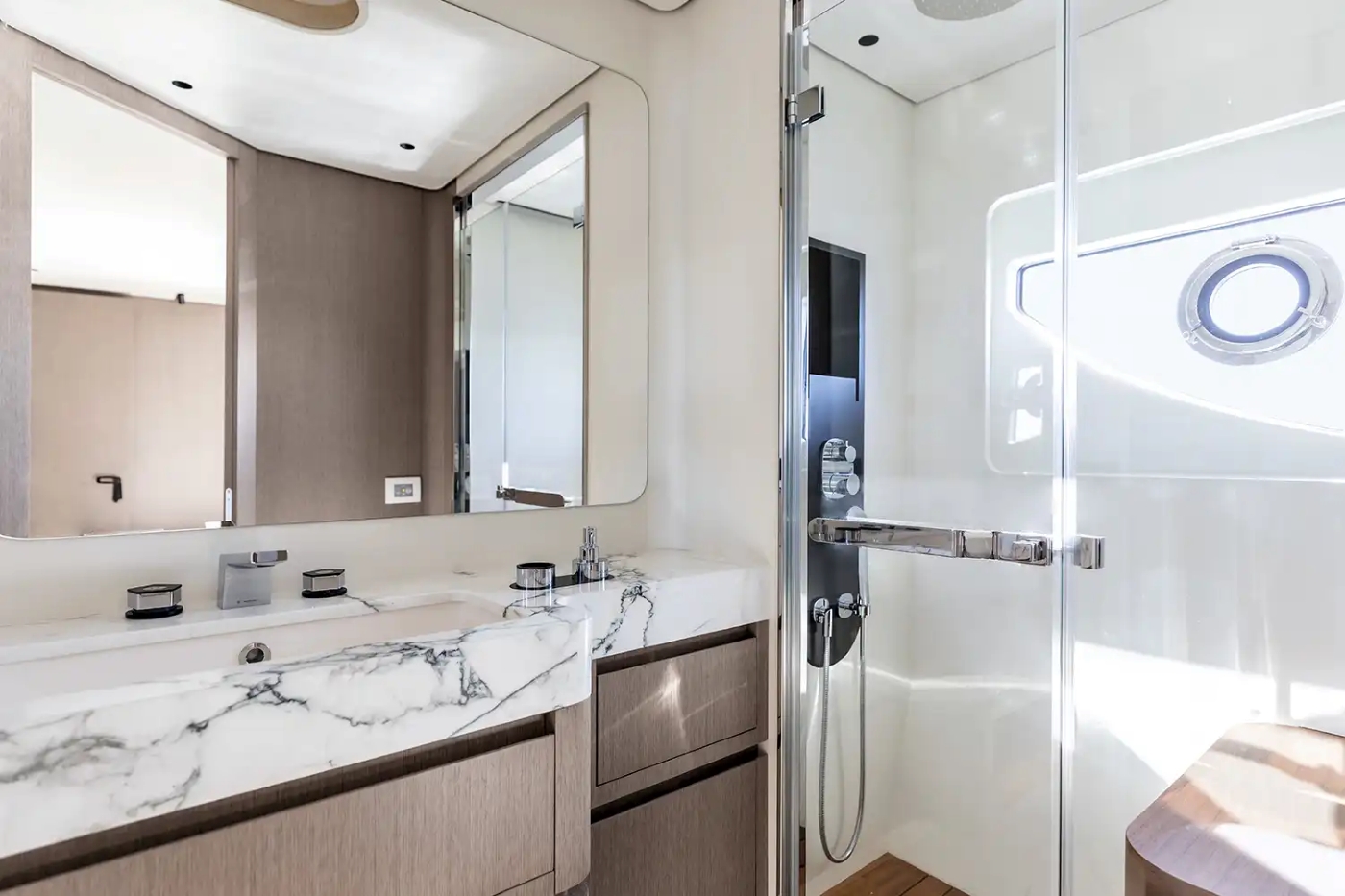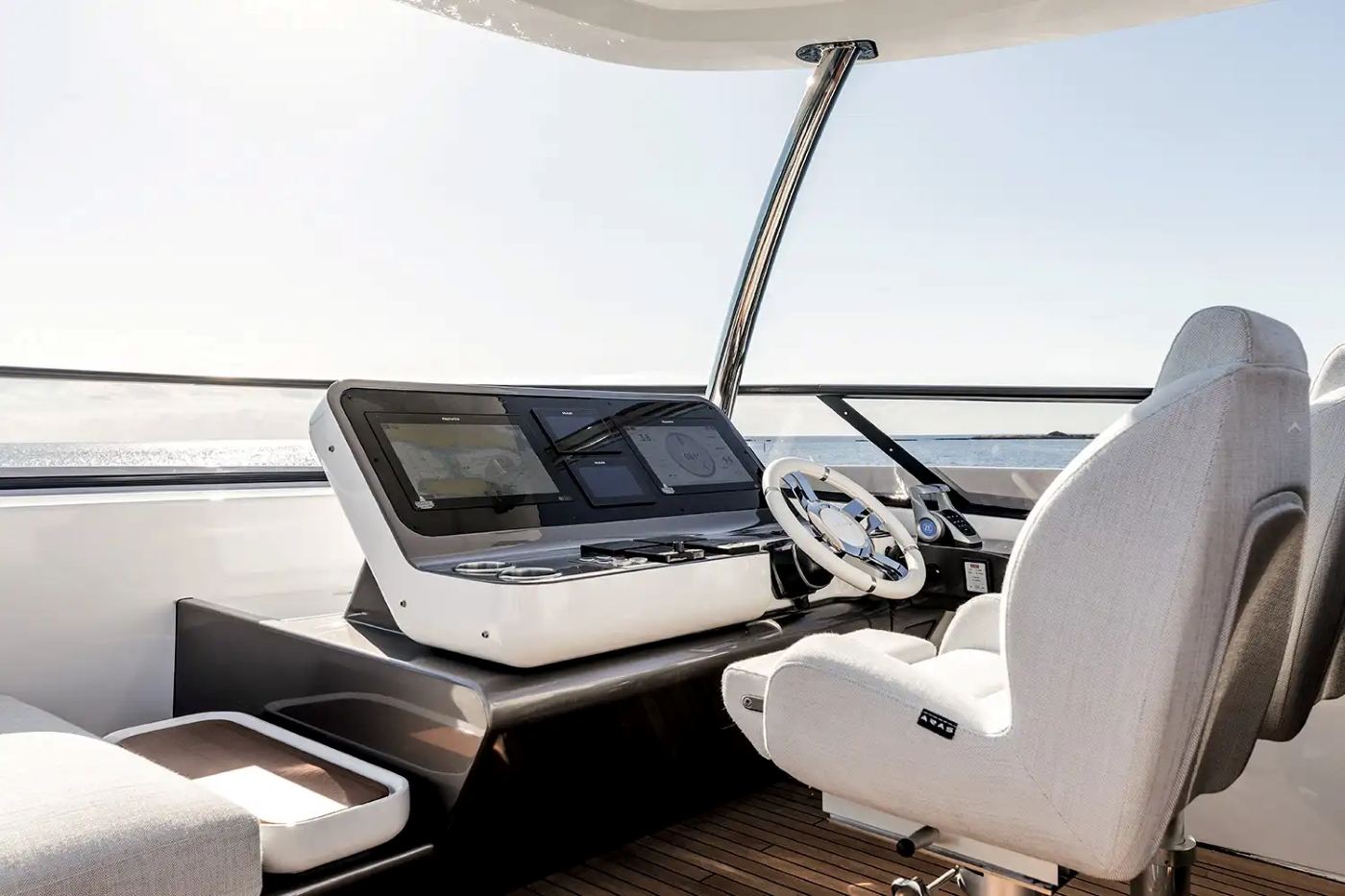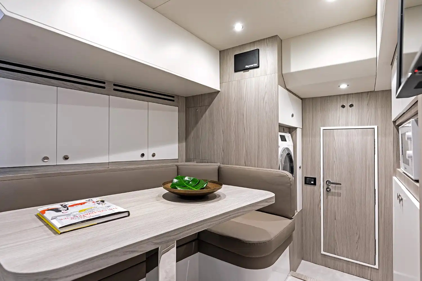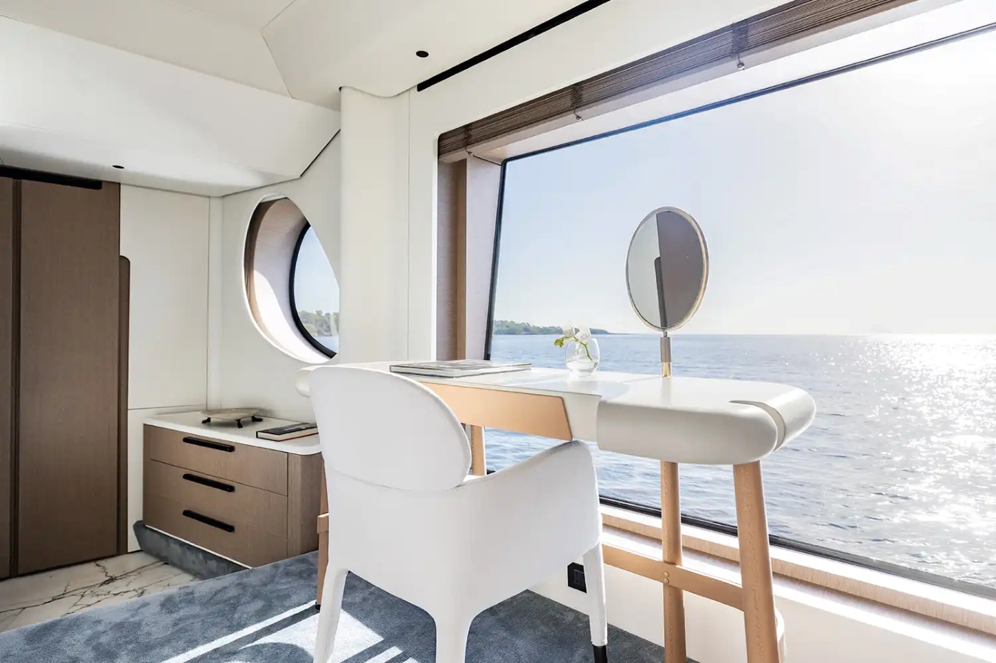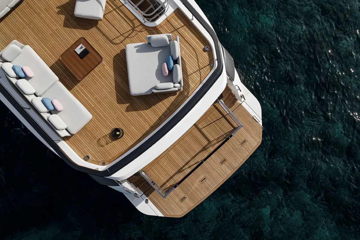 On deck, the flybridge offers an expansive social hub — perfect for lounging, sunbathing or entertaining. The aft deck benefits from the ingenious Deck2Deck™ Terrace: a hydraulic transom extension that transforms the cockpit into an extended terrace over the water, creating an impressive al fresco dining or lounging area for up to eight guests. This design innovation turns the aft zone into a spacious, flexible environment for gatherings, meals or evening drinks.
