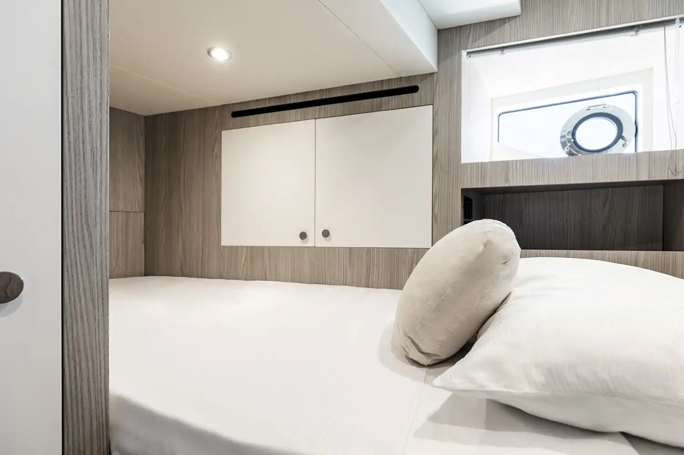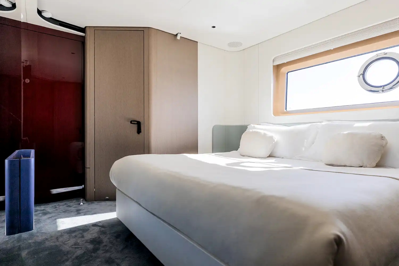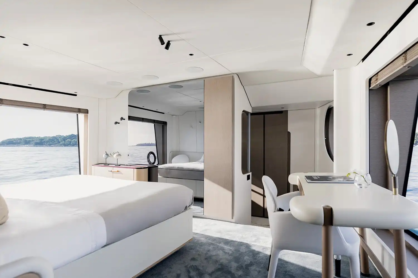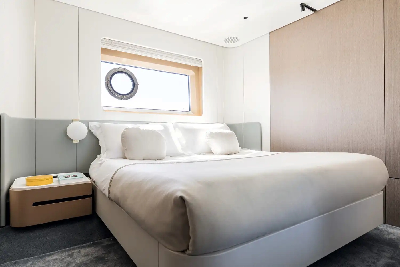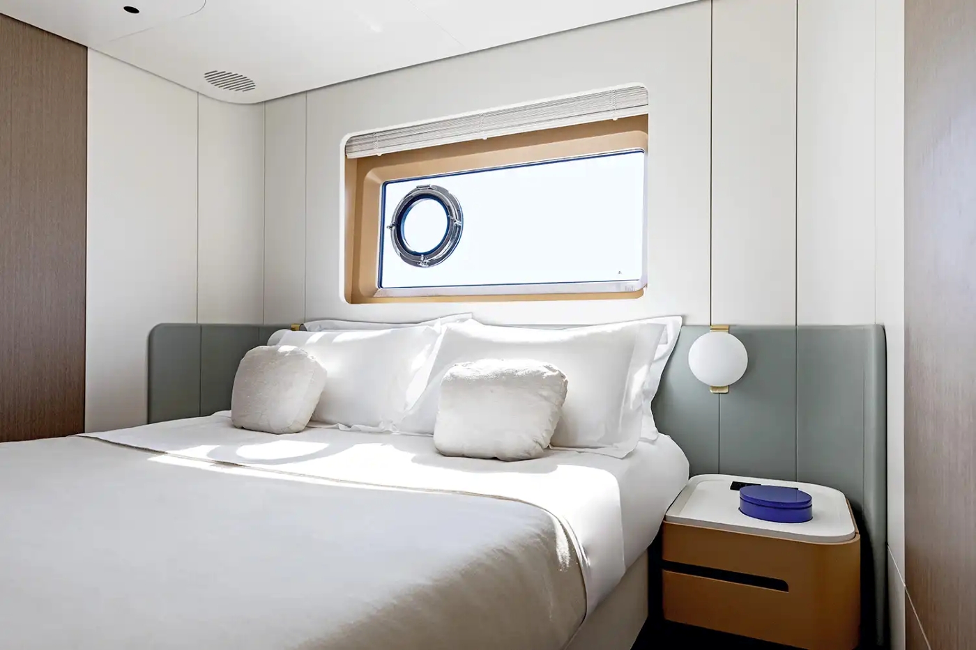 Below deck, guest cabins are arranged to offer privacy and tranquillity. The overall design philosophy ensures that guest spaces are peaceful retreats, with well considered materials, soft lighting and refined touches throughout.