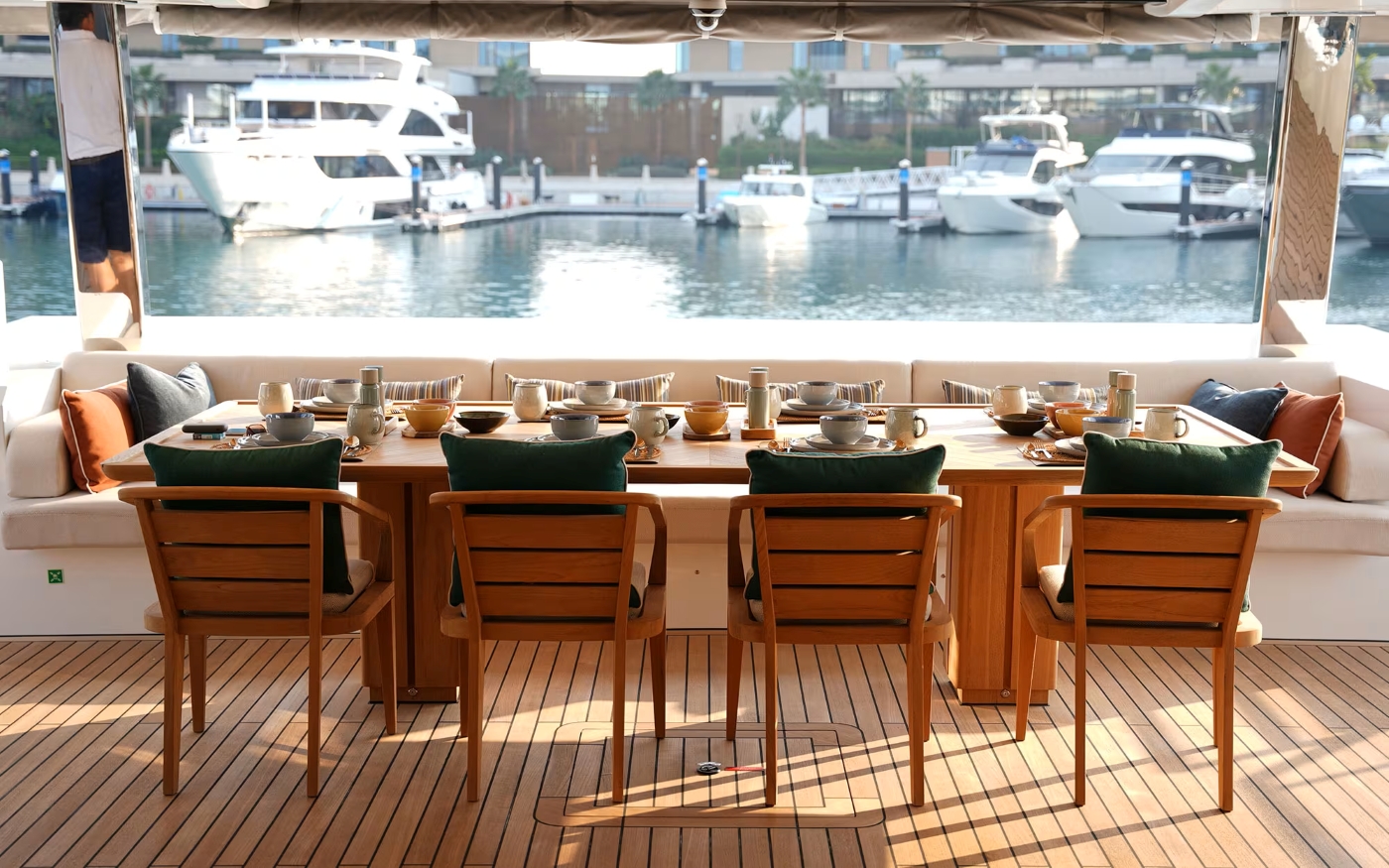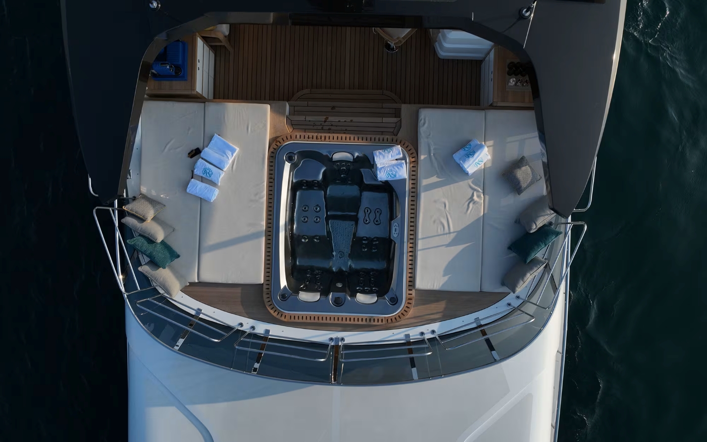 Descending one level, the upper aft deck reveals an intimate dining area beneath the overhang, complete with barbecue facilities and direct access to the saloon—ensuring effortless flow between indoor and outdoor spaces. The foredeck offers a layered design, with built-in seating perfect for quiet contemplation at anchor or during gentle cruising.